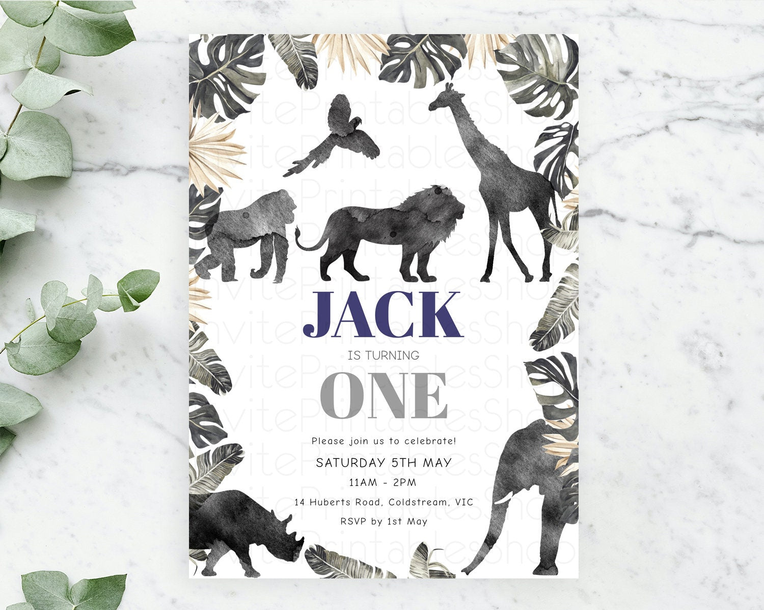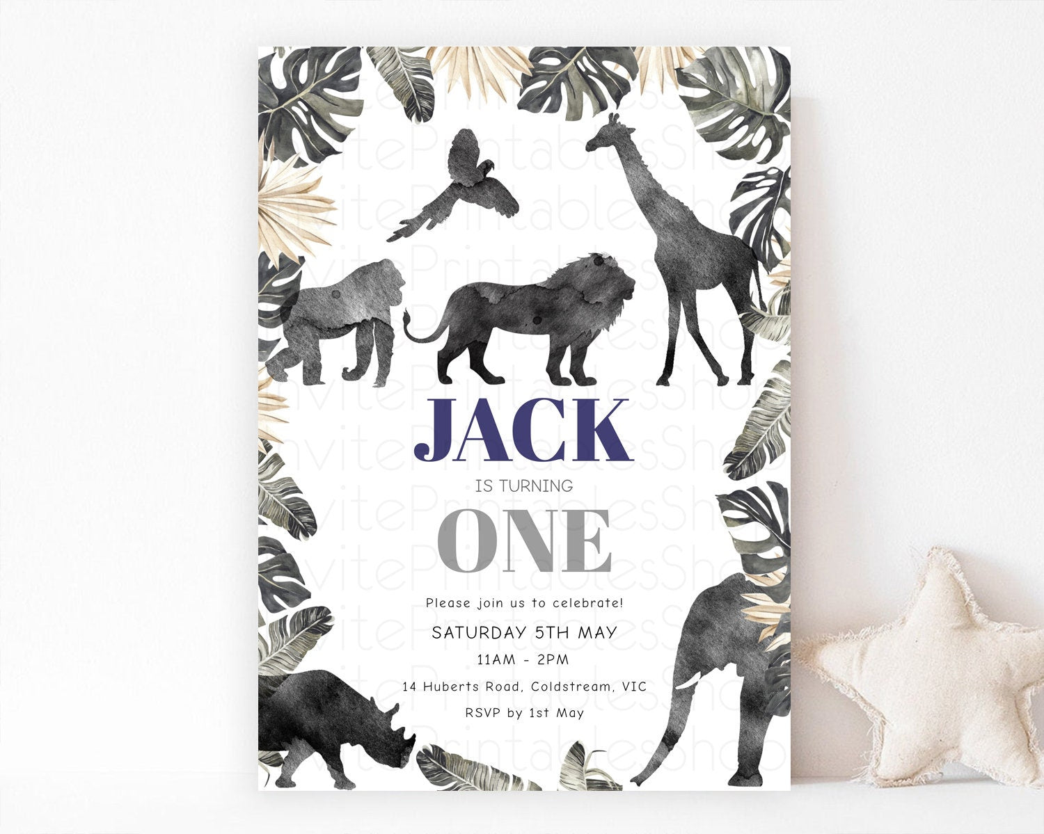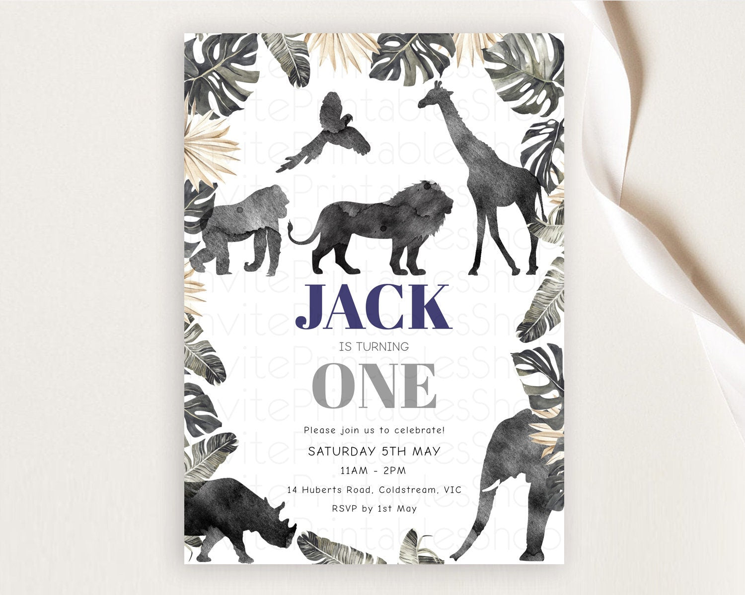 Safari Birthday Invitation Lion Gorilla Elephant Rhino Tropical Palm Jungle Safari Adventure Zoo Party Animal 2nd 1st First Birthday D10865