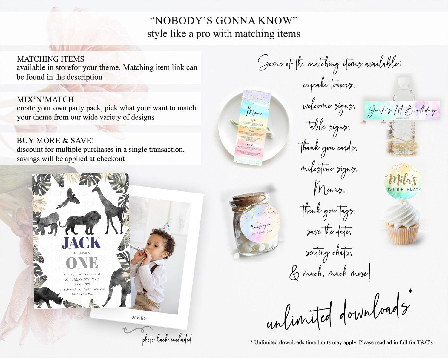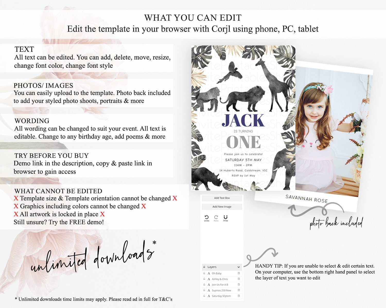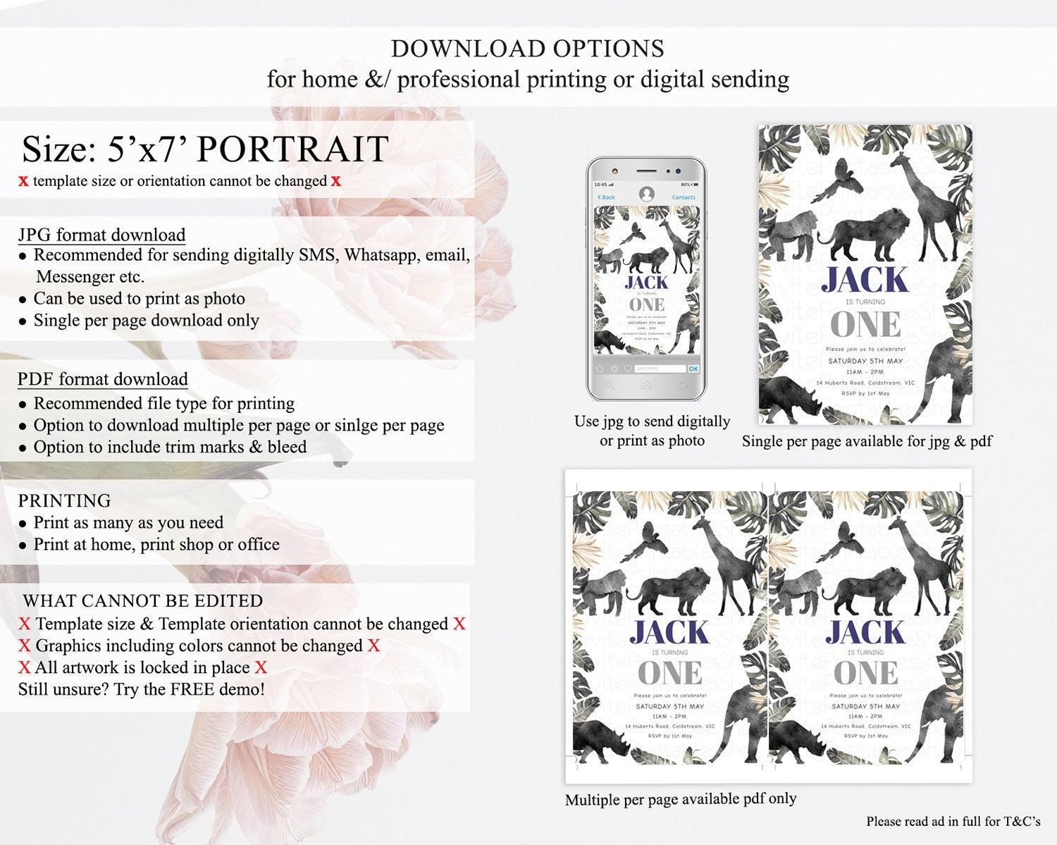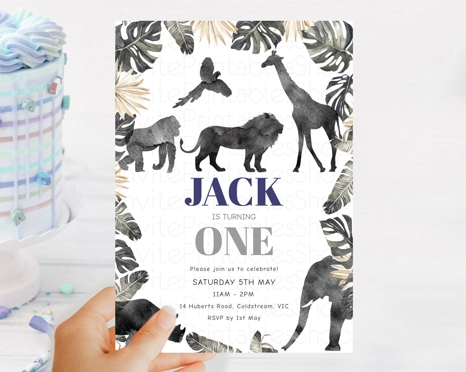 Safari Birthday Invitation Lion Gorilla Elephant Rhino Tropical Palm Jungle Safari Adventure Zoo Party Animal 2nd 1st First Birthday D10865
