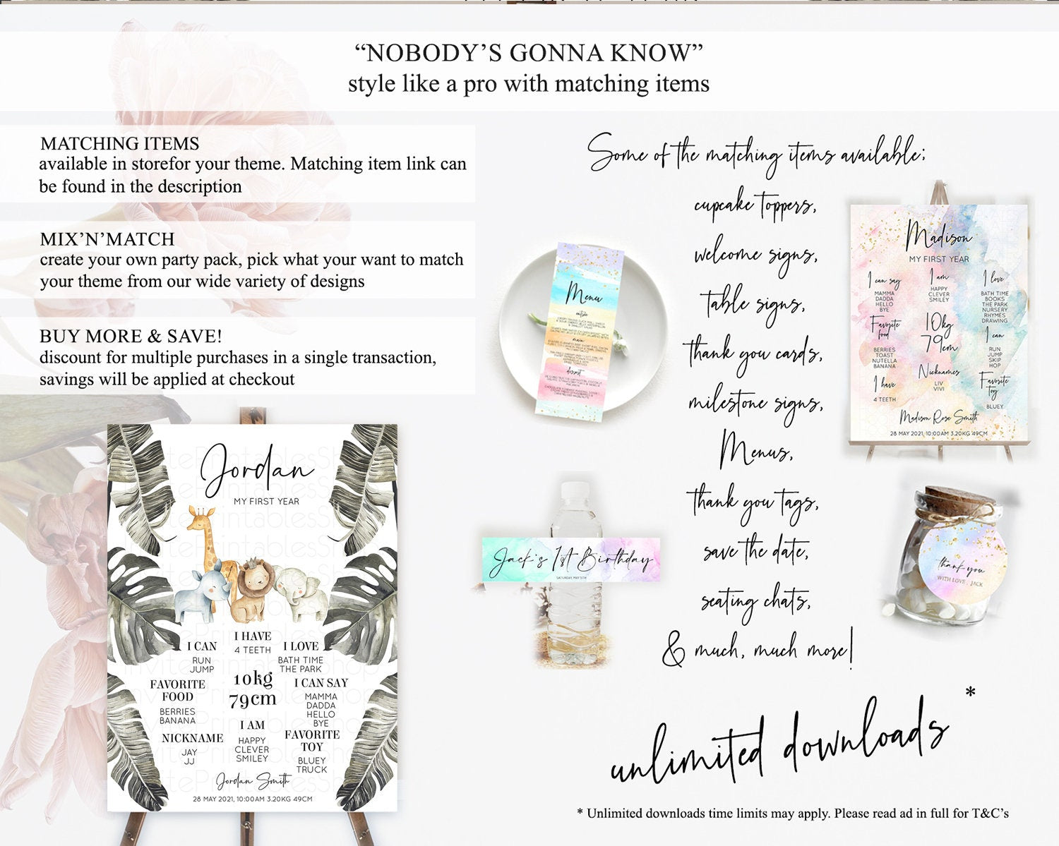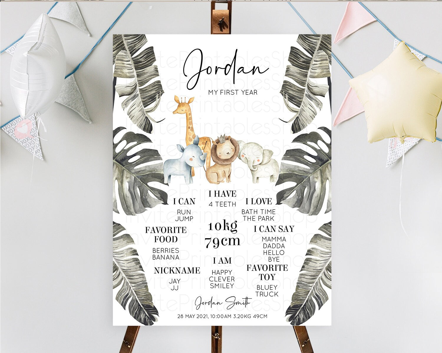 Safari First Birthday Milestone Poster Lion Gorilla Elephant Rhino Tropical Palm Jungle Zoo Party Animal 1st Birthday Welcome Sign D10599