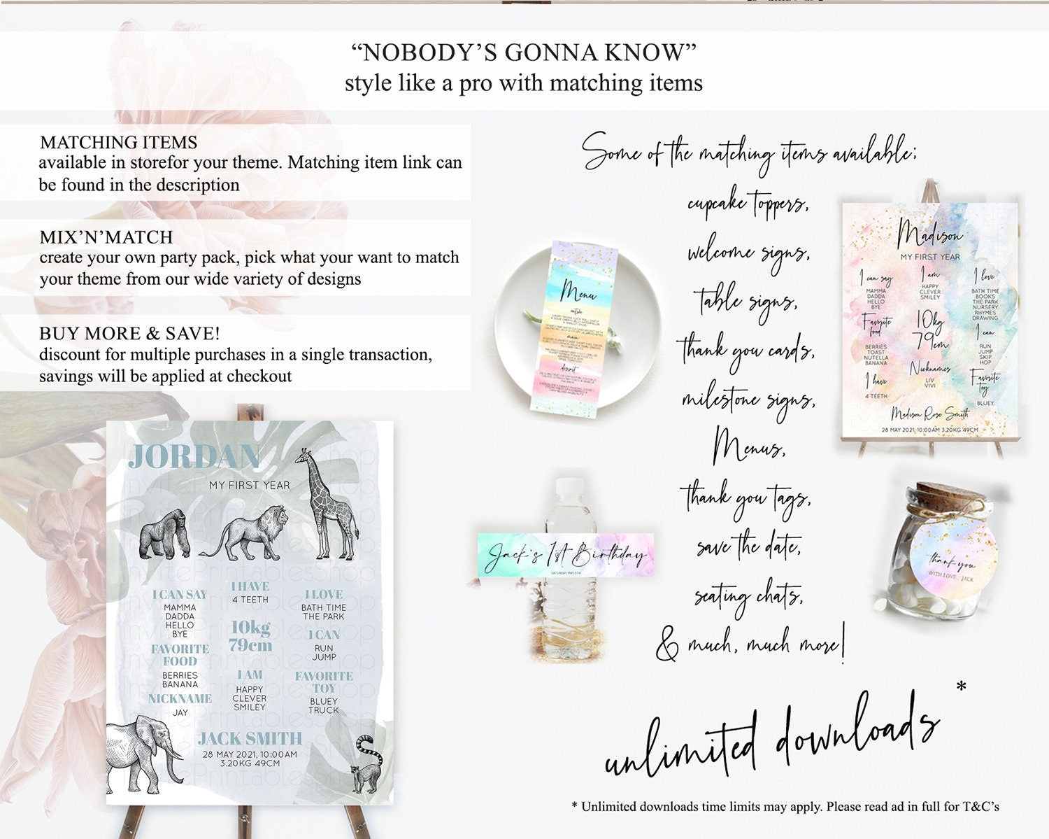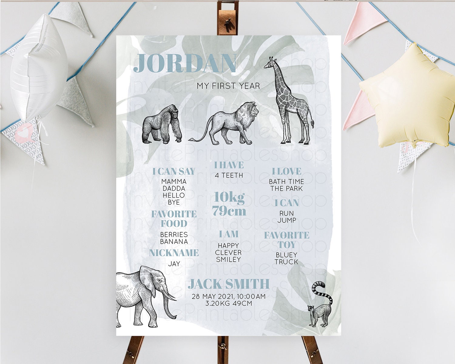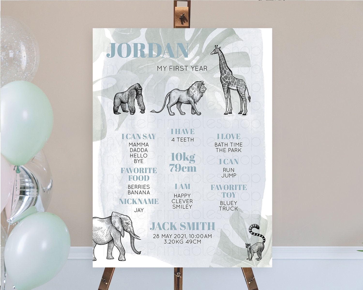 Safari First Birthday Milestone Poster Lion Gorilla Elephant Rhino Tropical Palm Jungle Zoo Party Animal 1st Birthday Welcome Sign D10821