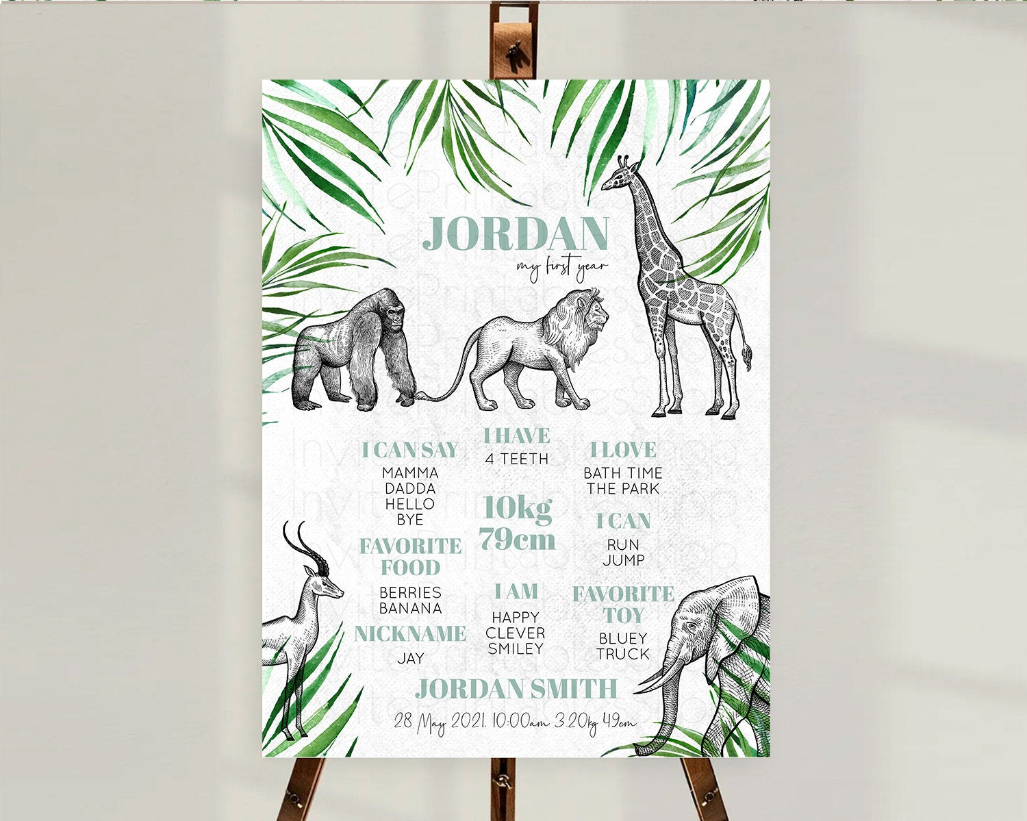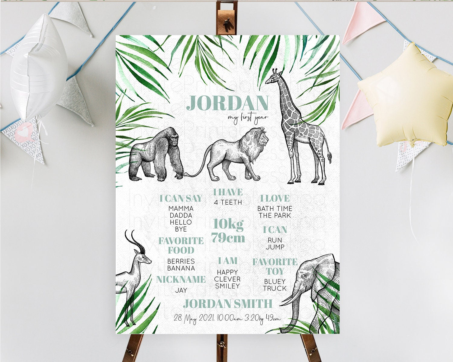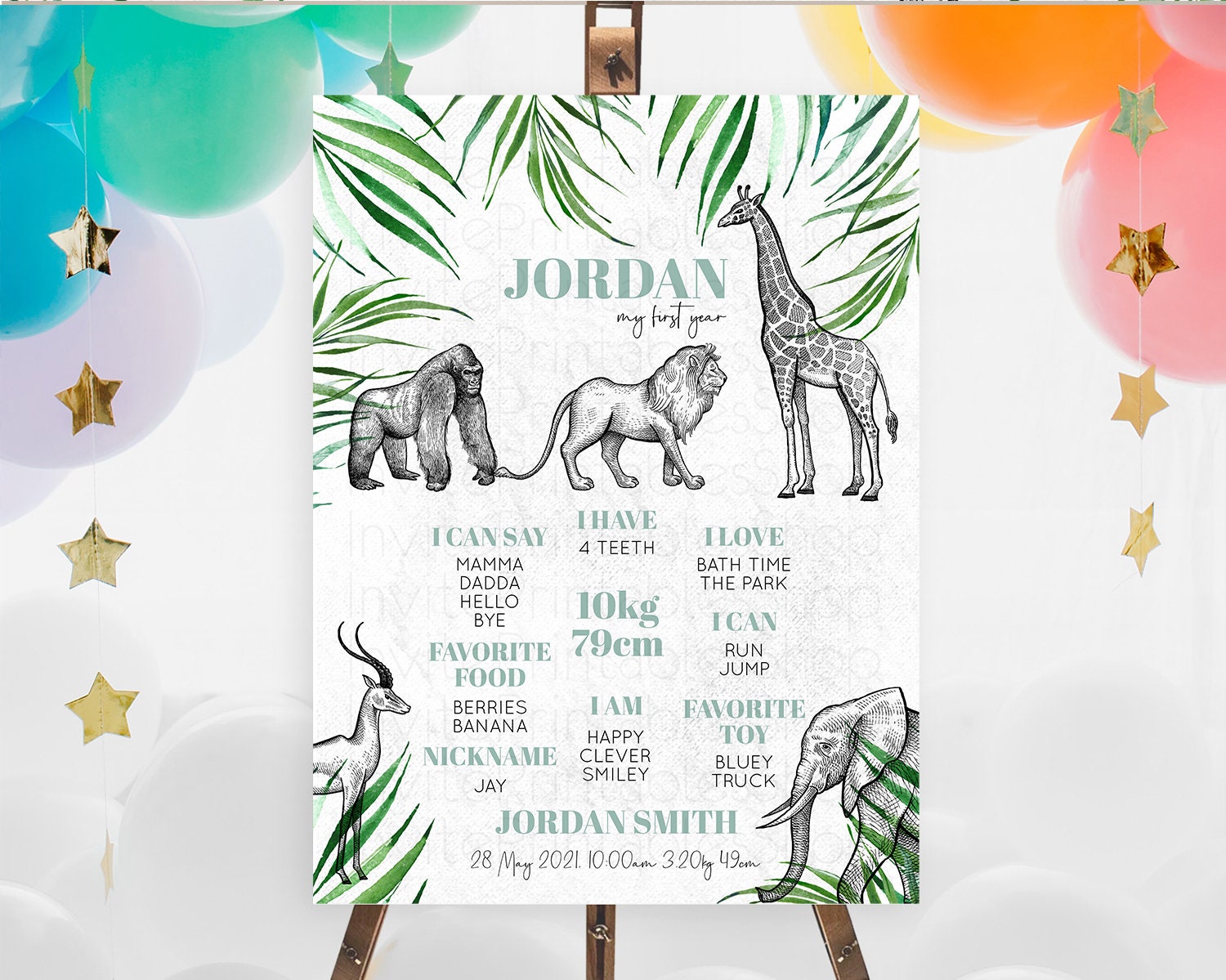 Safari First Birthday Milestone Poster Lion Gorilla Elephant Rhino Tropical Palm Jungle Zoo Party Animal 1st Birthday Welcome Sign D10853