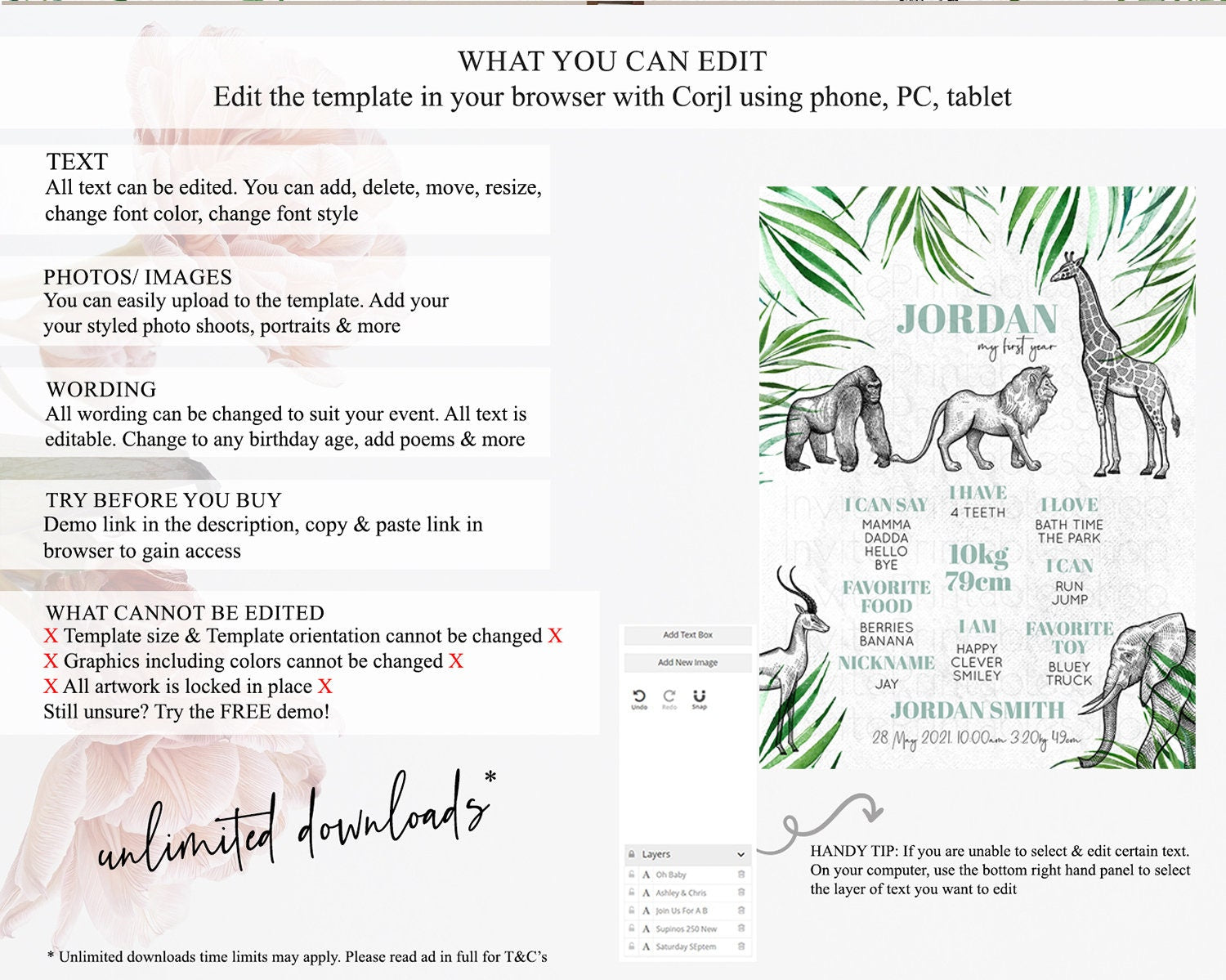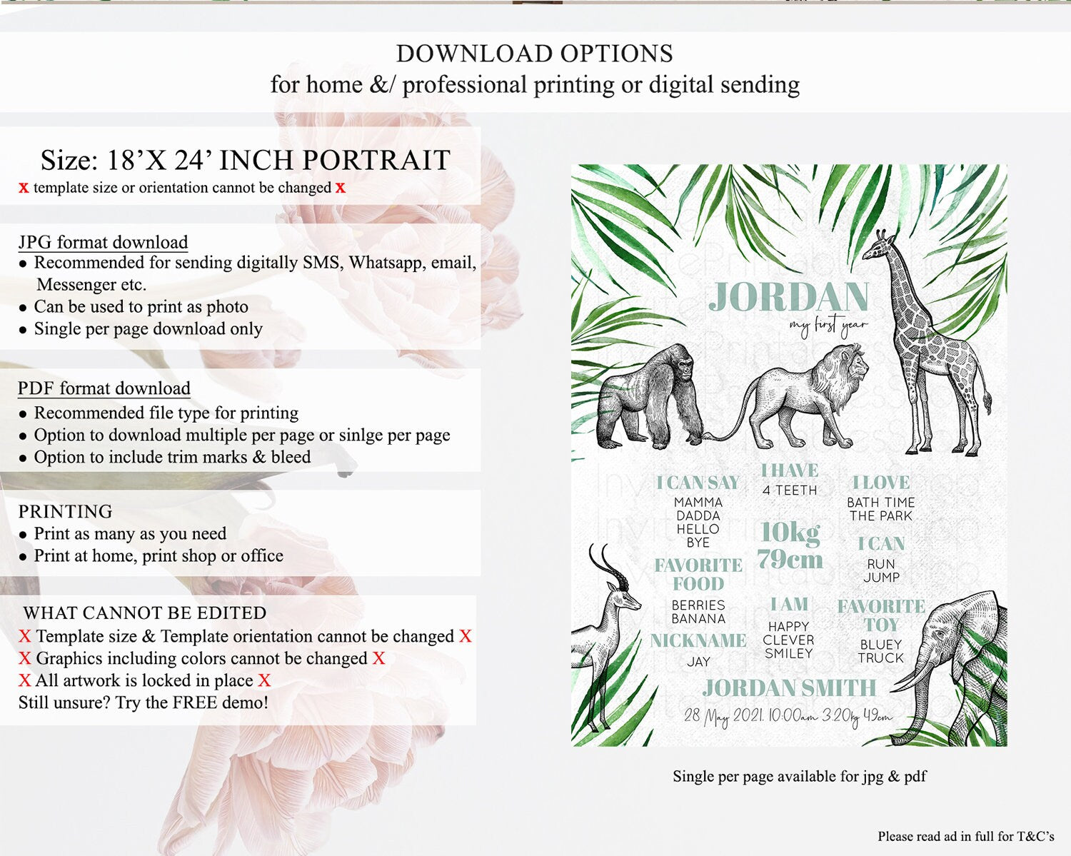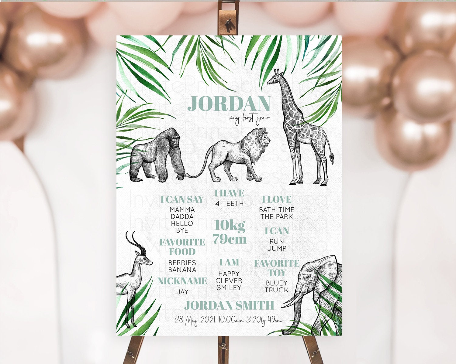 Safari First Birthday Milestone Poster Lion Gorilla Elephant Rhino Tropical Palm Jungle Zoo Party Animal 1st Birthday Welcome Sign D10853