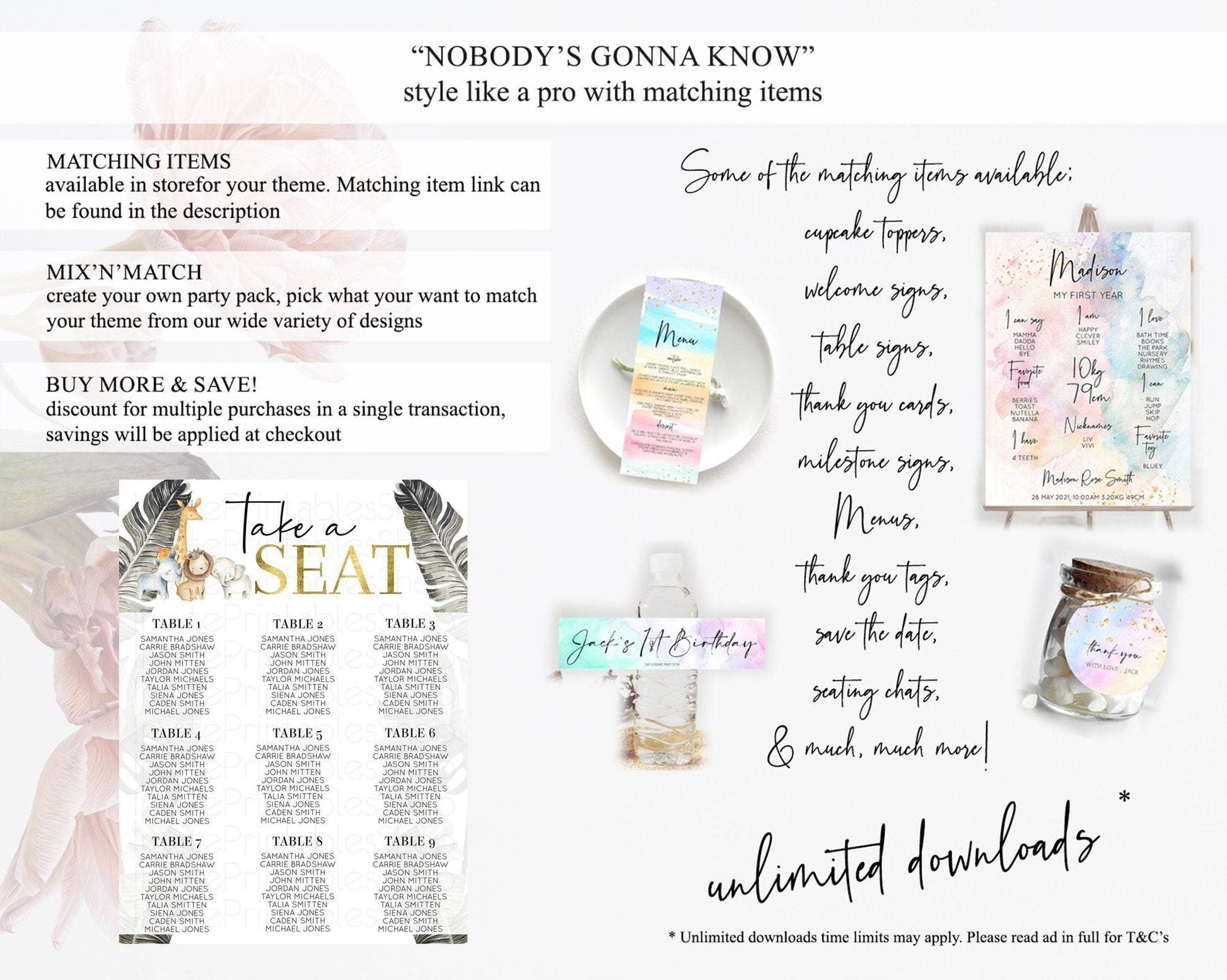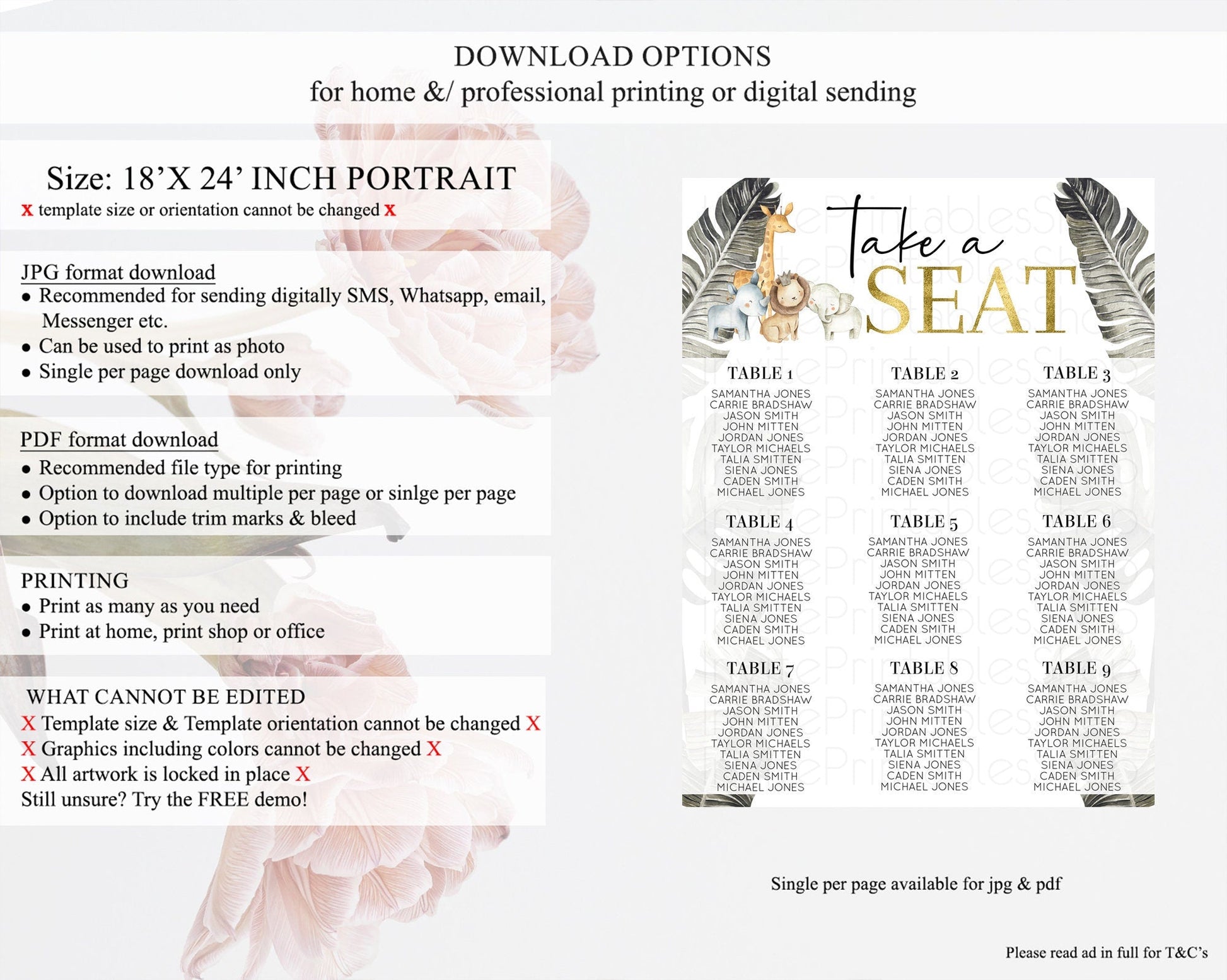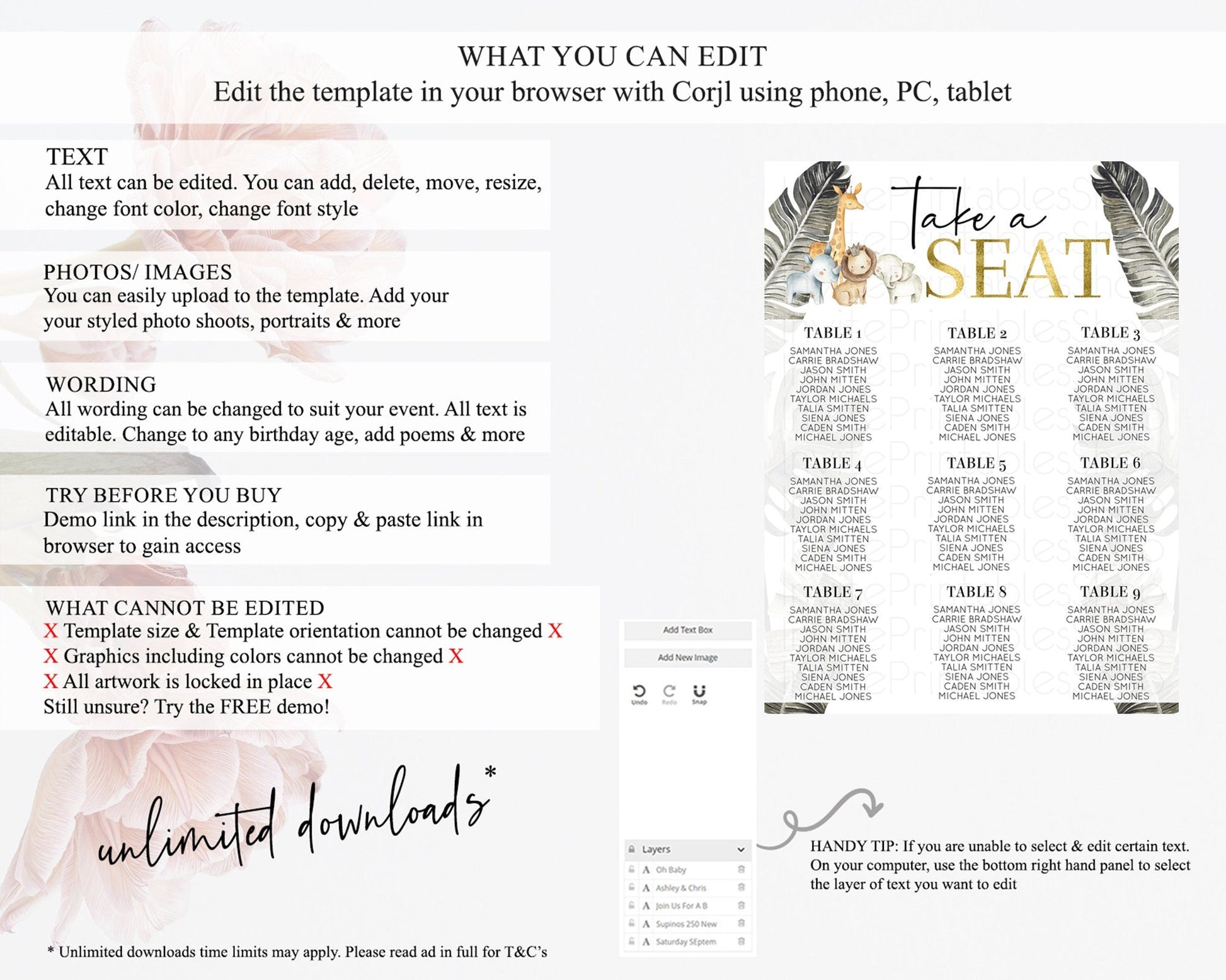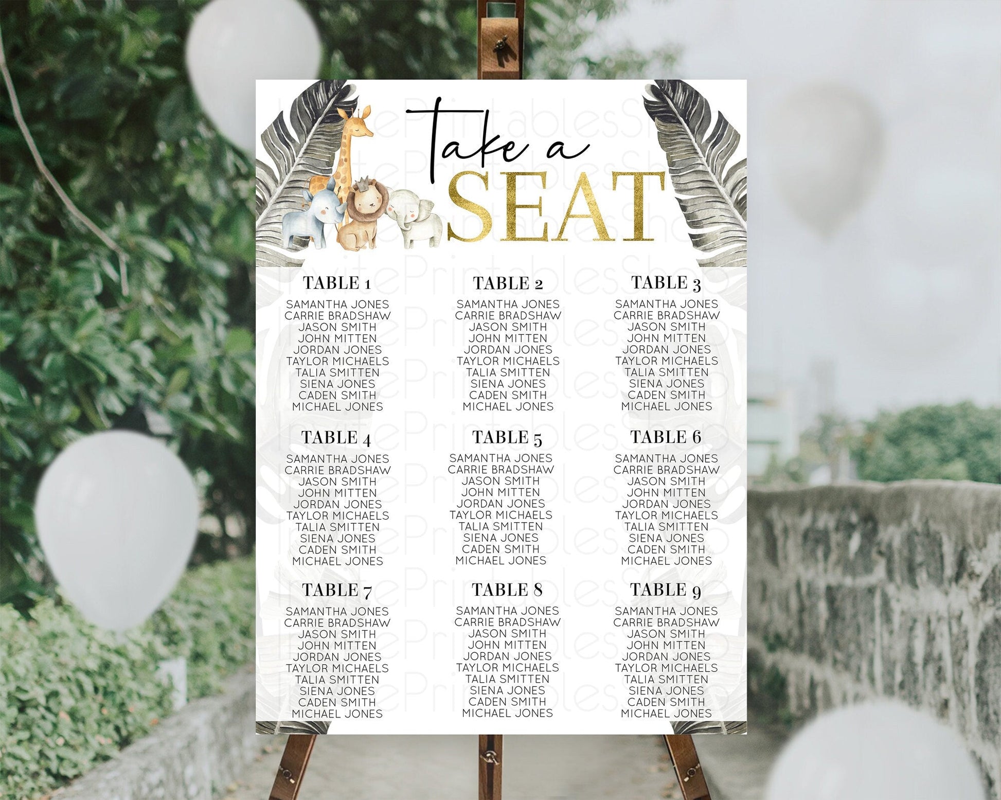 Safari Seating Chart Lion Gorilla Elephant Rhino Tropical Palm Decor Jungle Safari Adventure Zoo Take A Seat Sign D10599