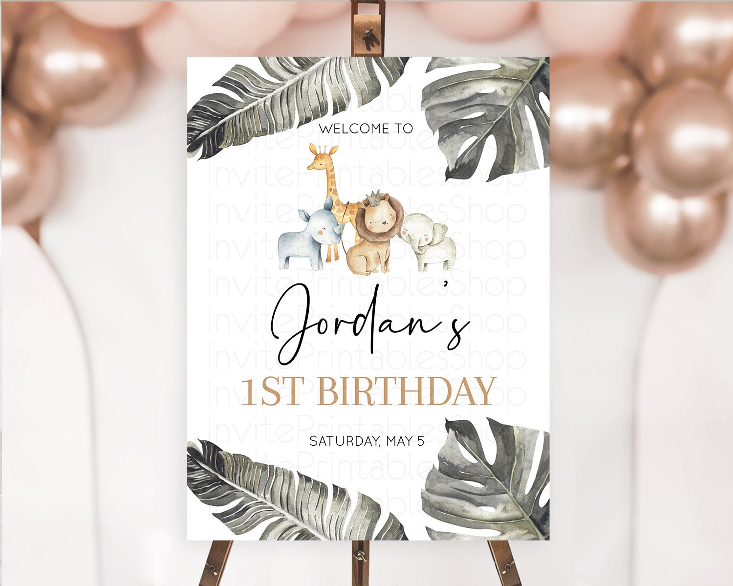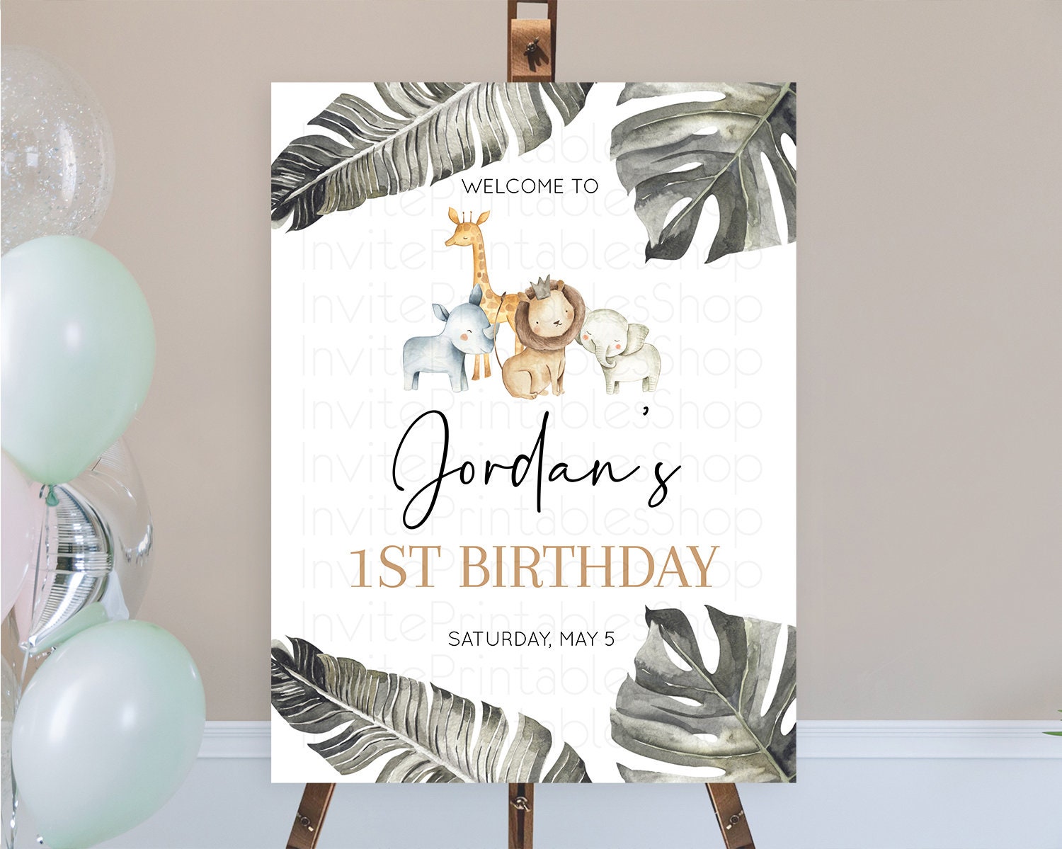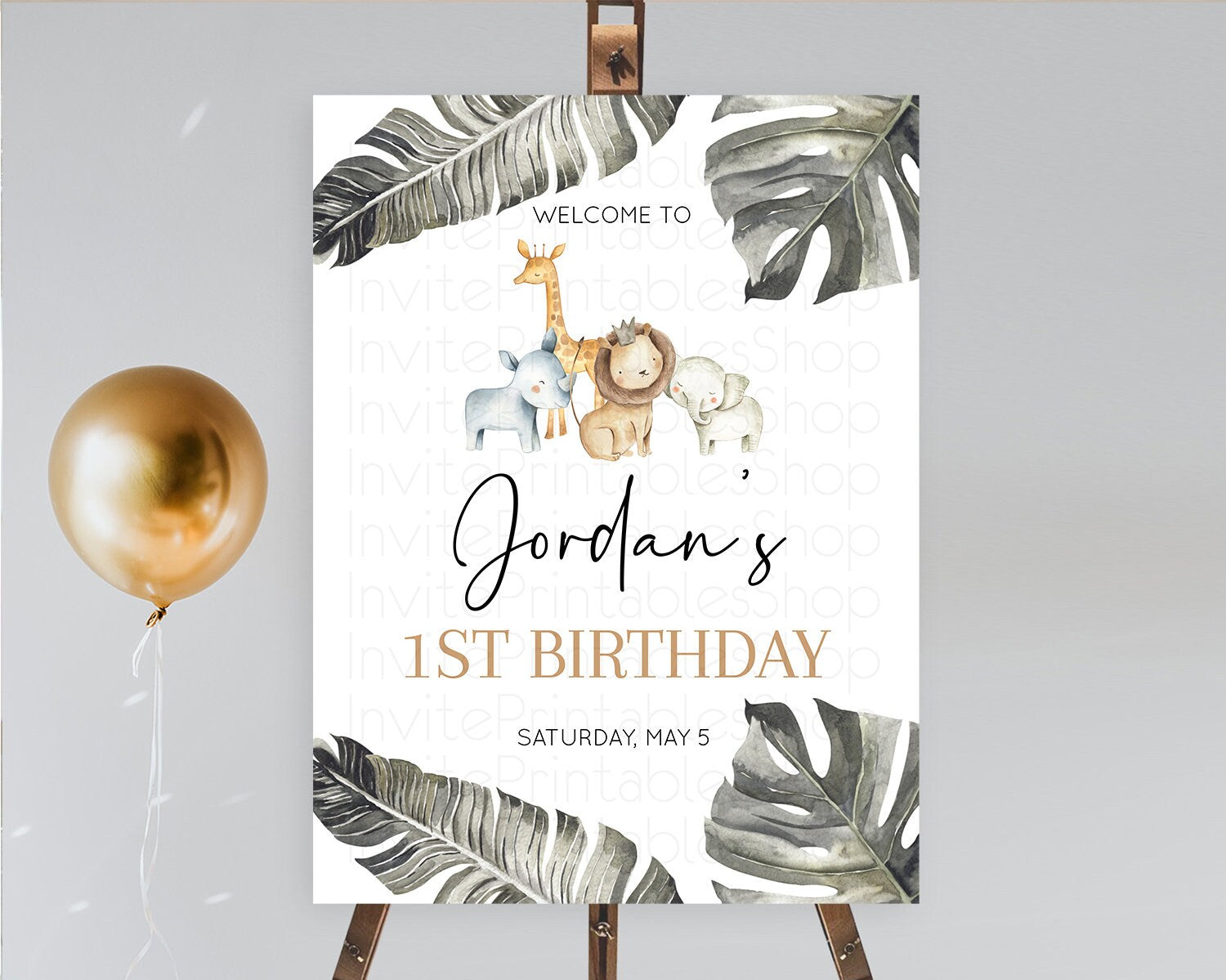 Safari Welcome Sign Safari Welcome Board Lion Gorilla Elephant Rhino Tropical Palm Zoo Party Decor First Birthday Welcome Sign D10599
