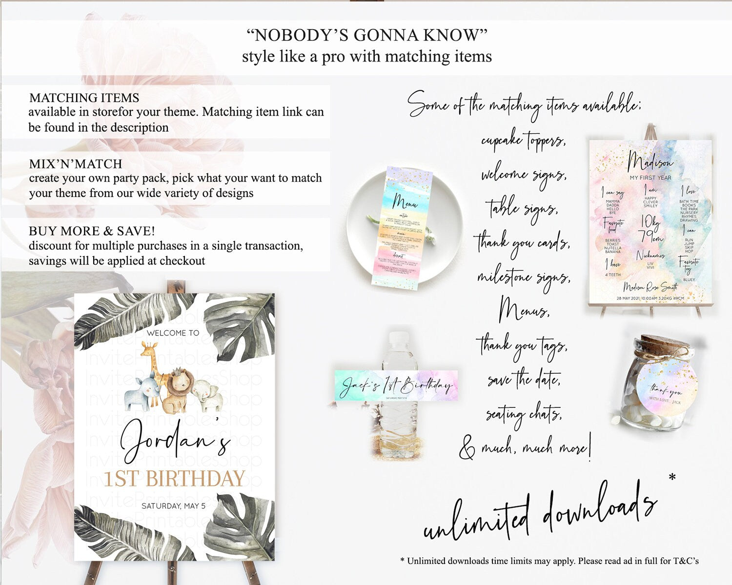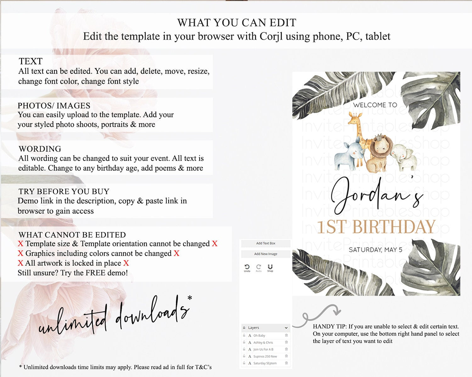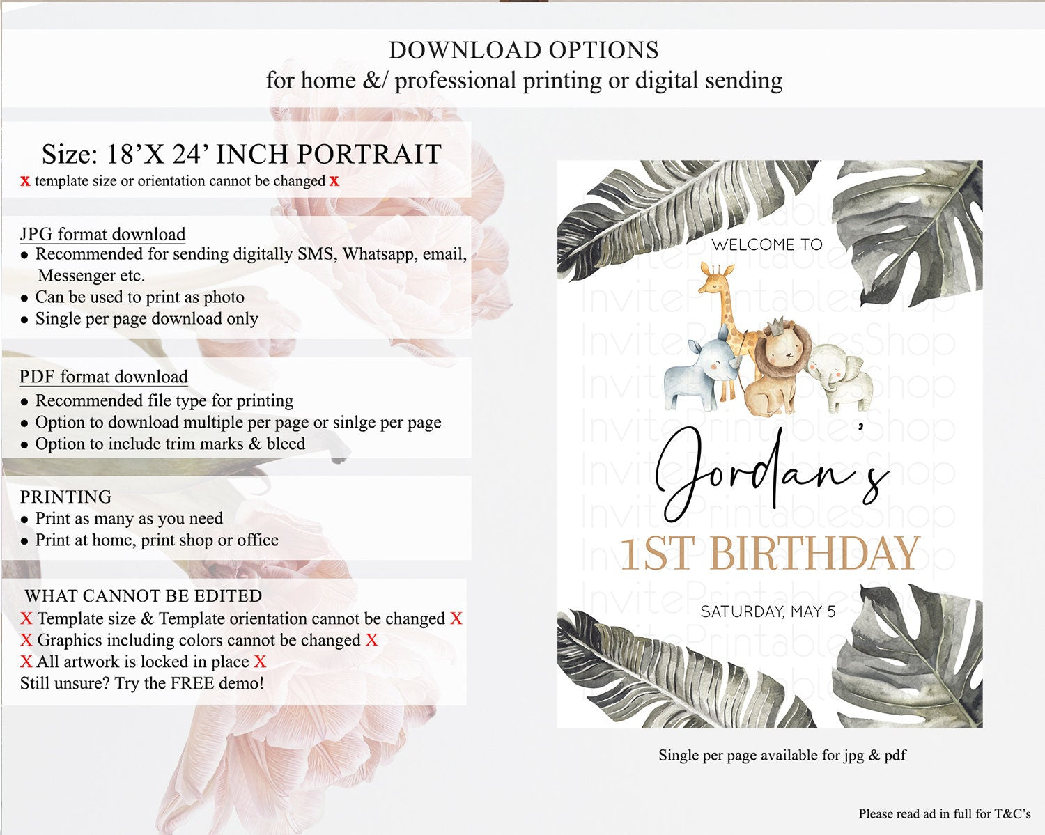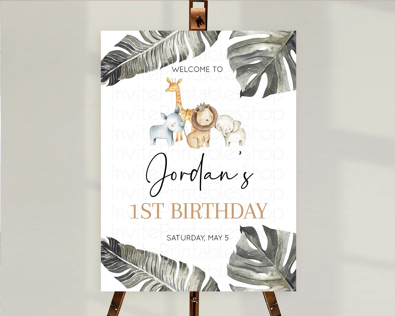 Safari Welcome Sign Safari Welcome Board Lion Gorilla Elephant Rhino Tropical Palm Zoo Party Decor First Birthday Welcome Sign D10599