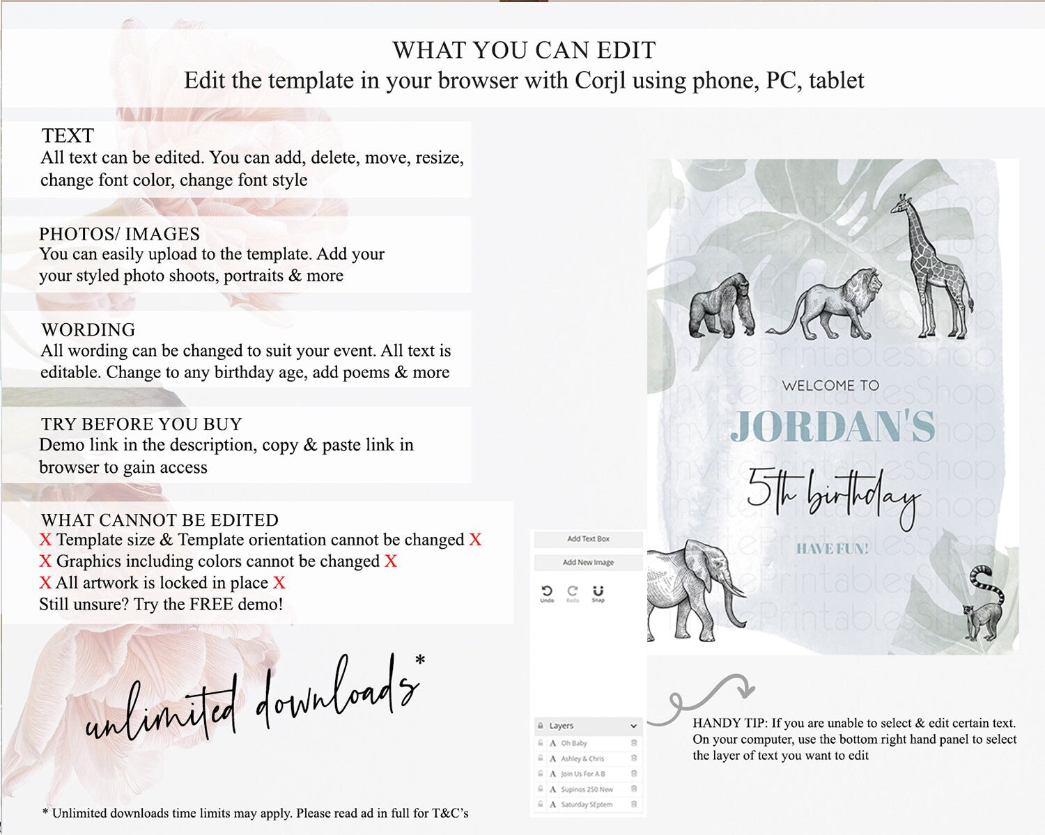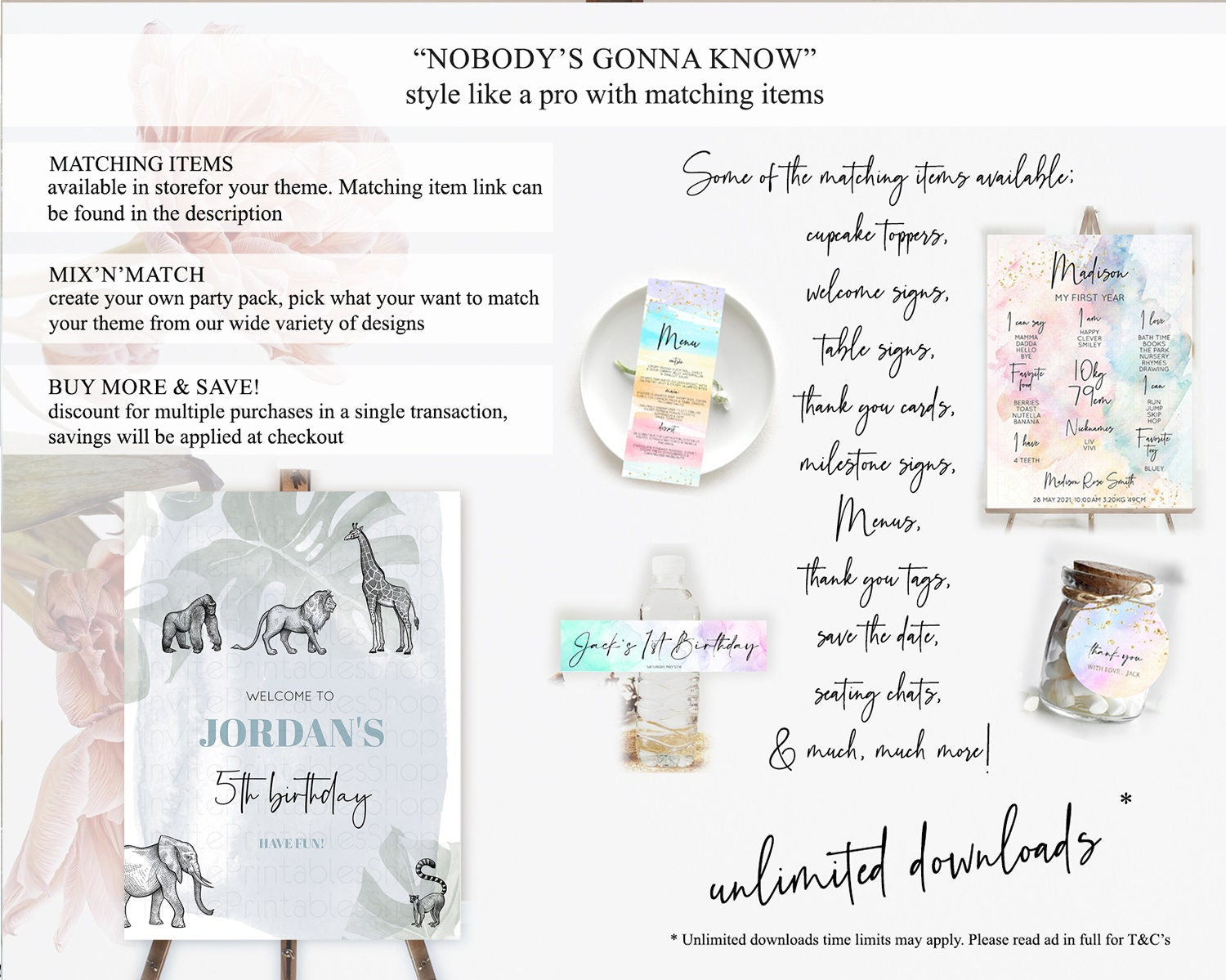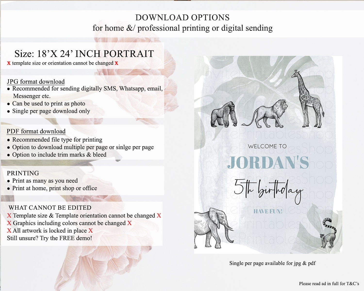 Safari Welcome Sign Safari Welcome Board Lion Gorilla Elephant Rhino Tropical Palm Zoo Party Decor First Birthday Welcome Sign D10821