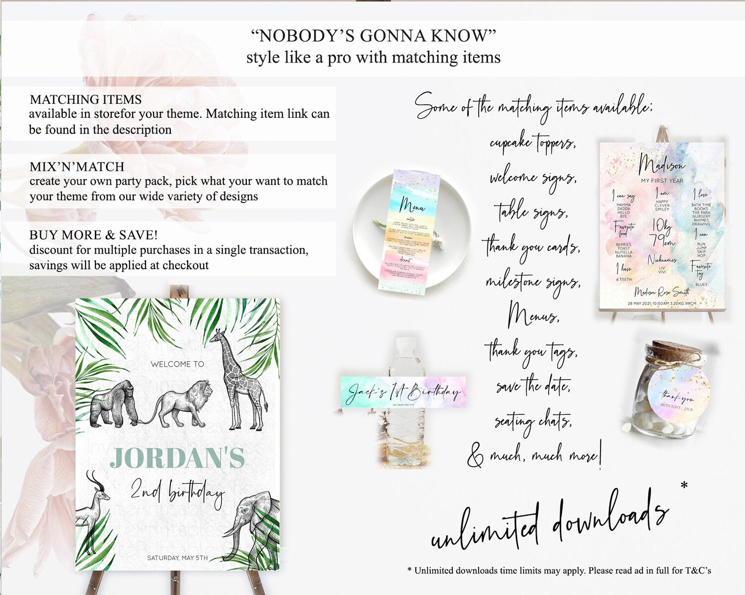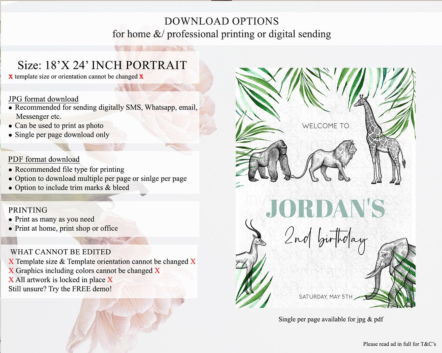 Safari Welcome Sign Safari Welcome Board Lion Gorilla Elephant Rhino Tropical Palm Zoo Party Decor First Birthday Welcome Sign D10853