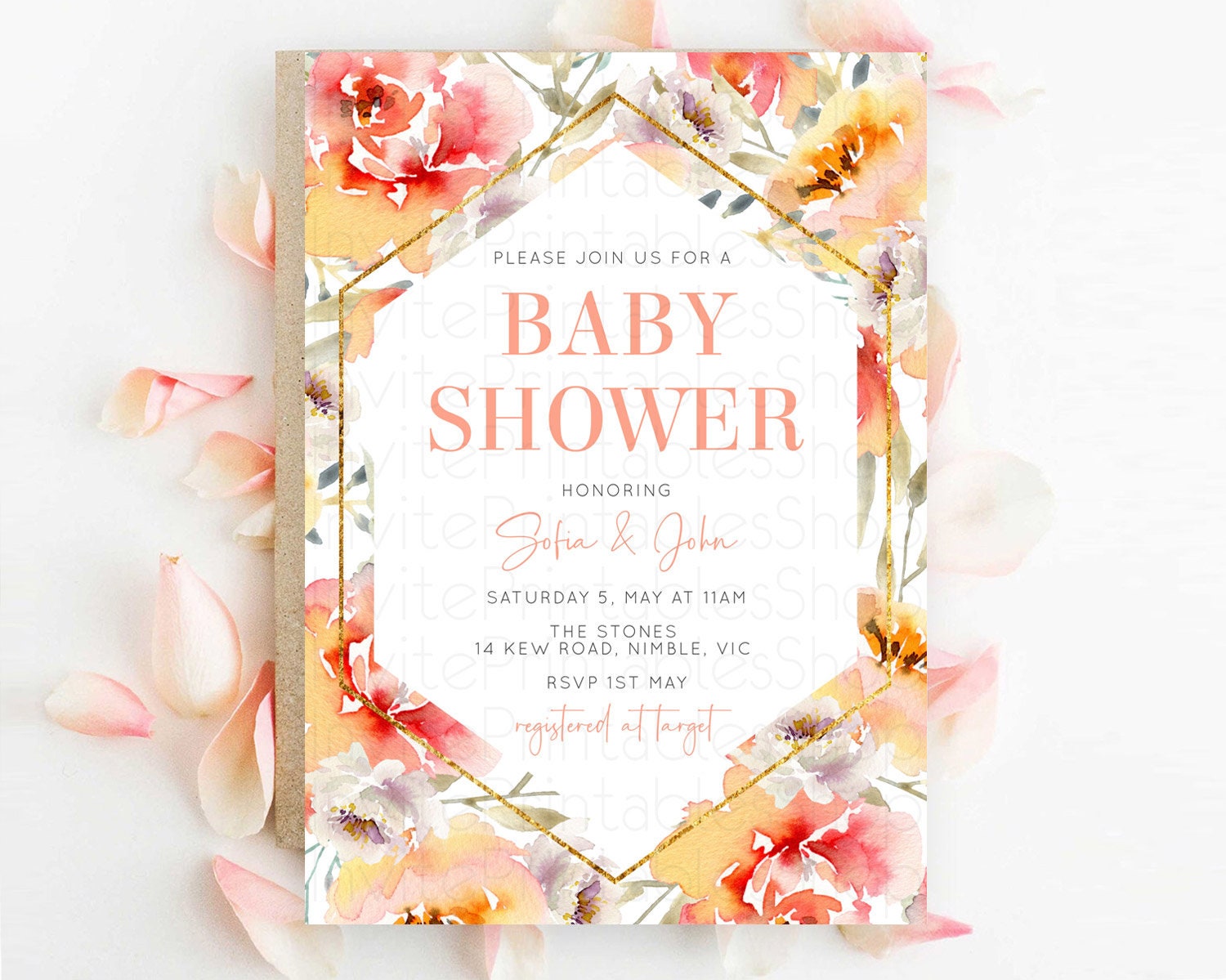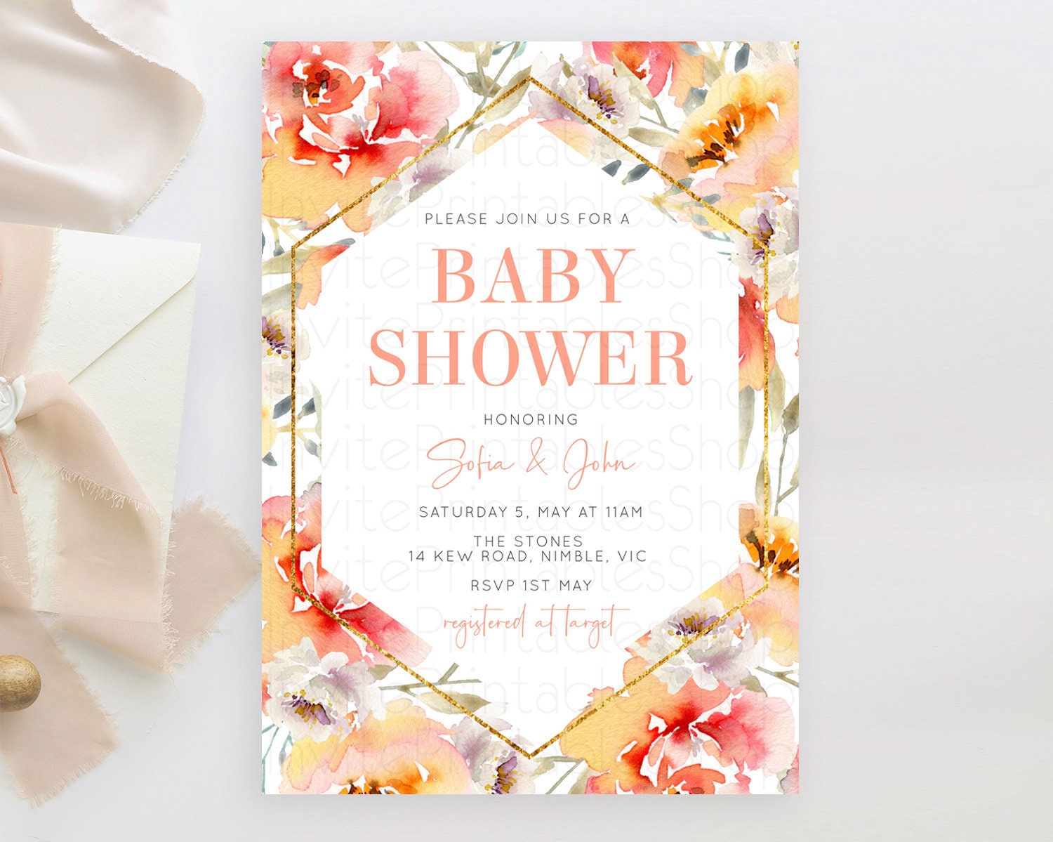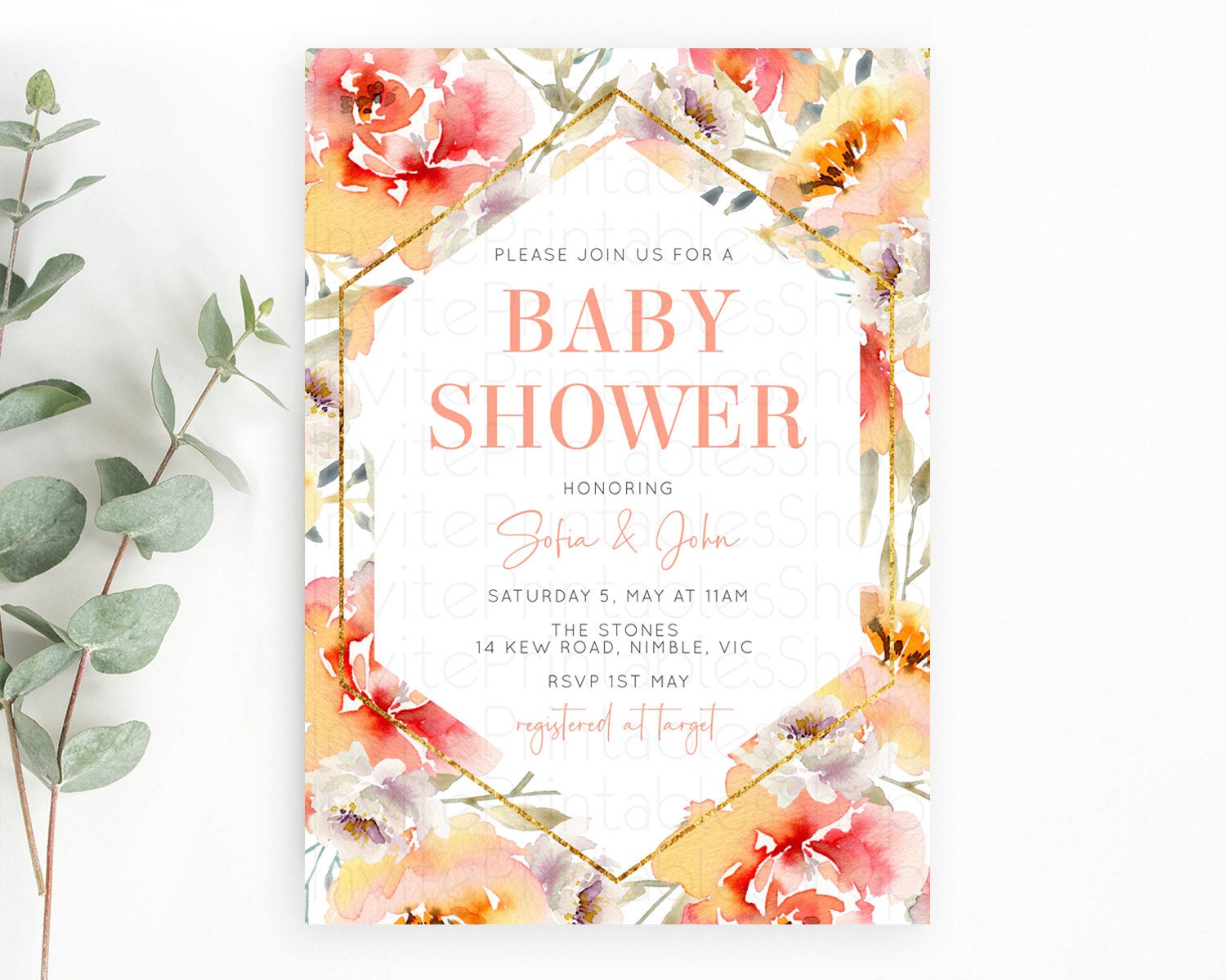 Secret Garden Baby Shower Invitation, Wildflower, Blooms, Botanical Theme, Pastel Flowers, Orange, Red Floral, Gold Accents D10791