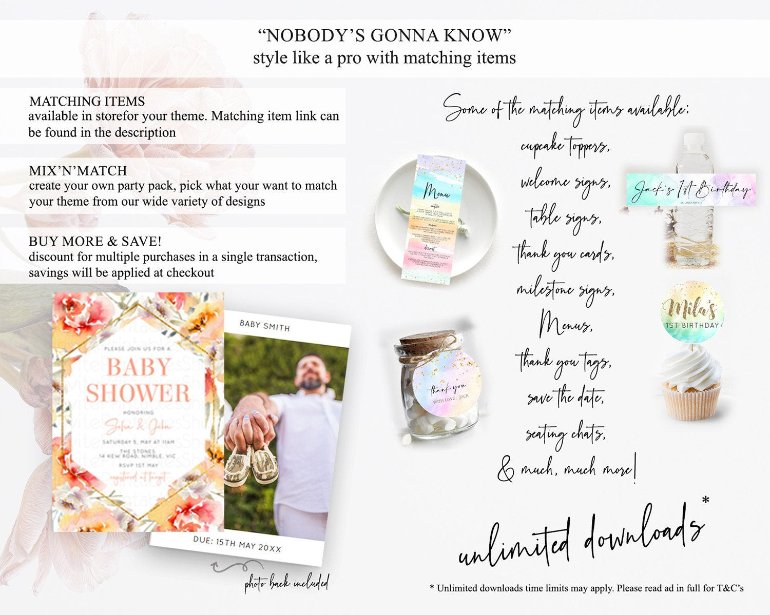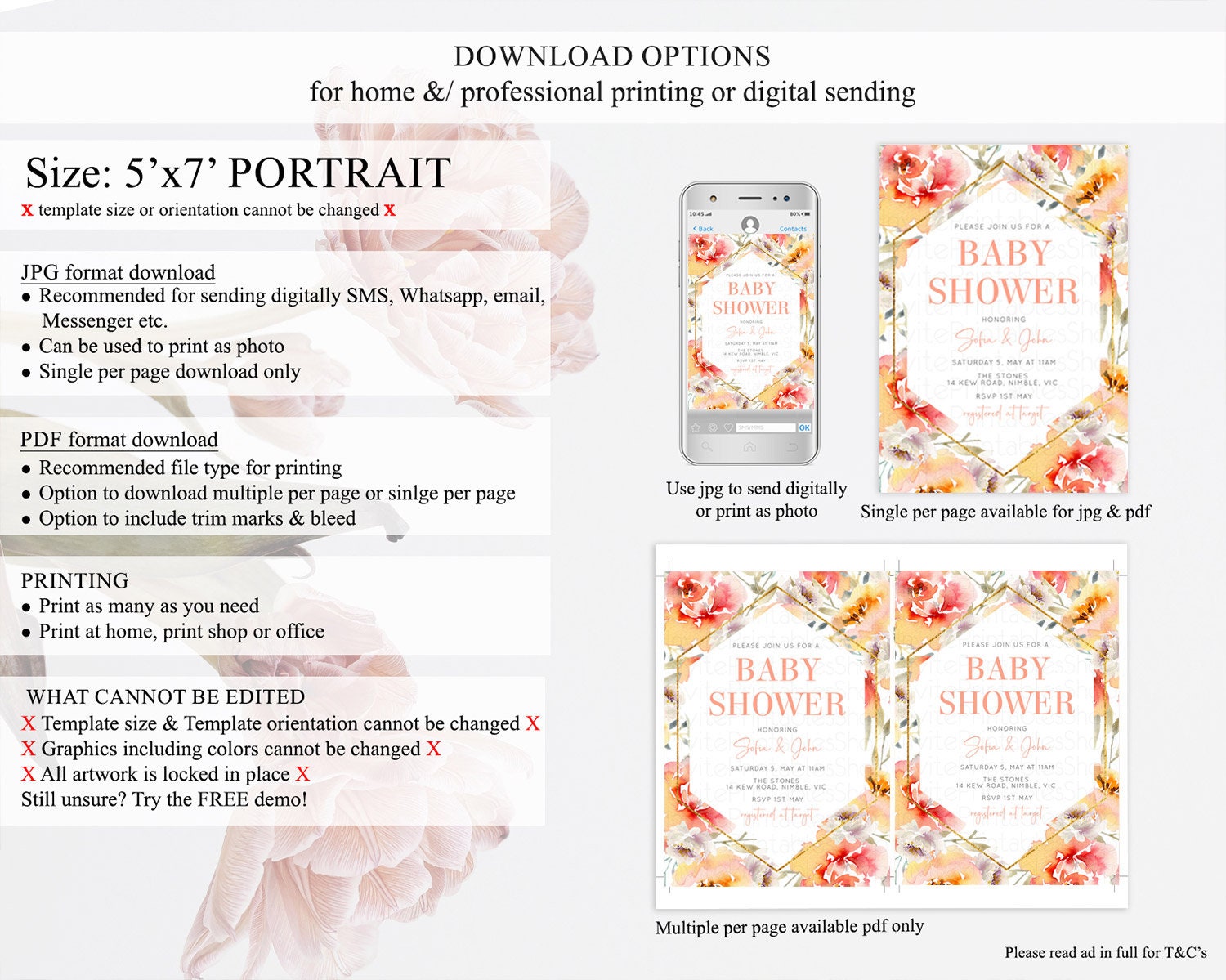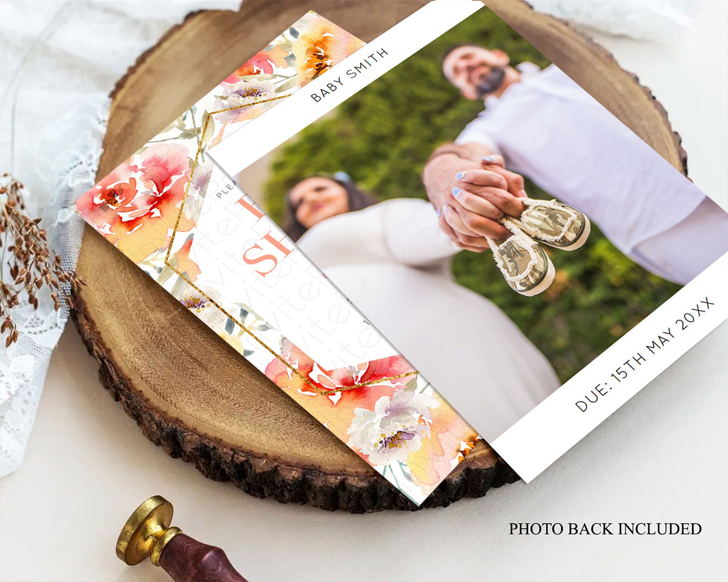 Secret Garden Baby Shower Invitation, Wildflower, Blooms, Botanical Theme, Pastel Flowers, Orange, Red Floral, Gold Accents D10791