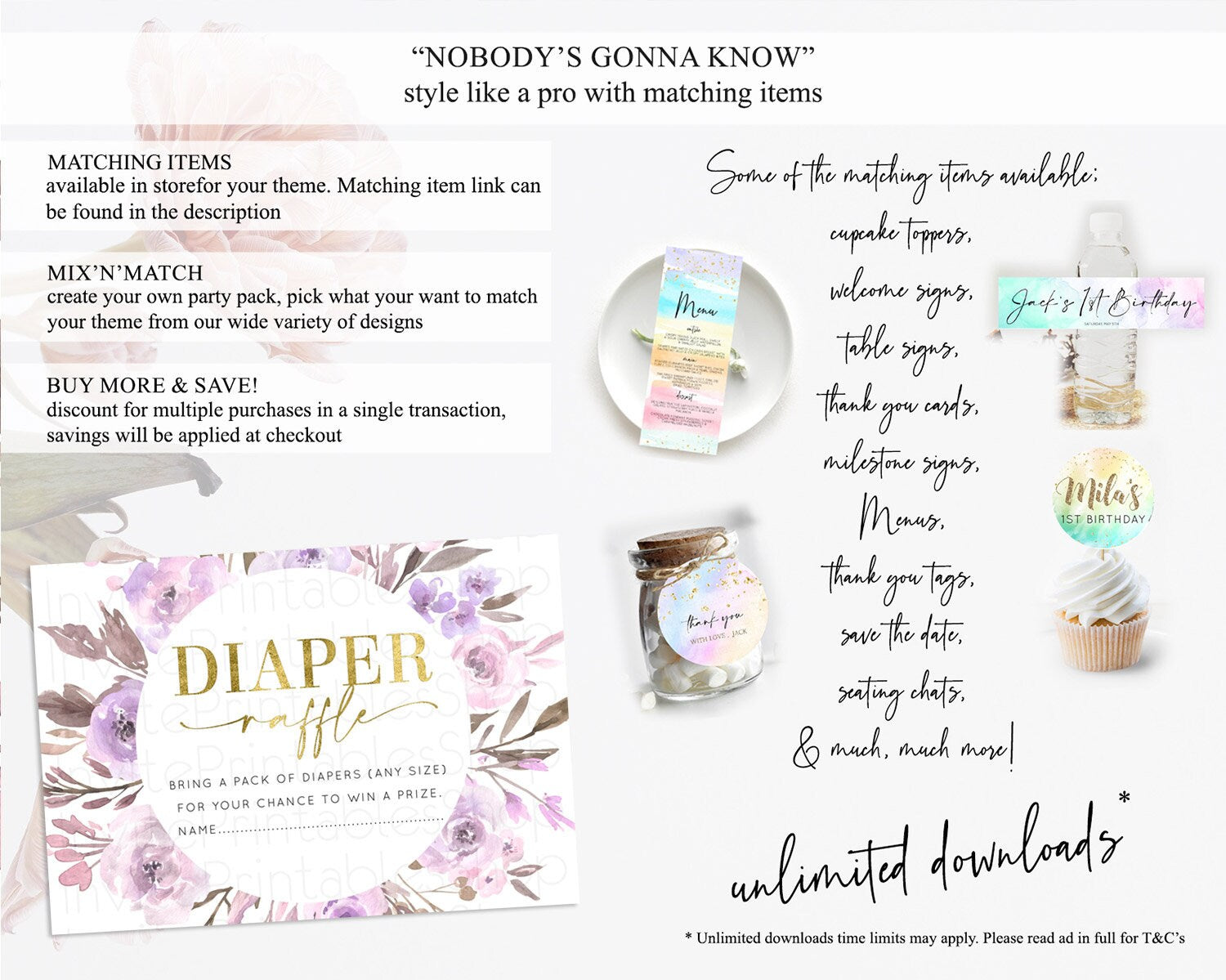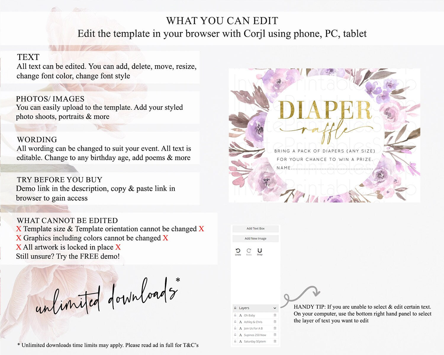 Secret Garden Diaper Raffle Card Boho Wildflower Diaper Raffle Insert Pastel Flower Garden Baby Shower Card Flower Raffle Game D10201