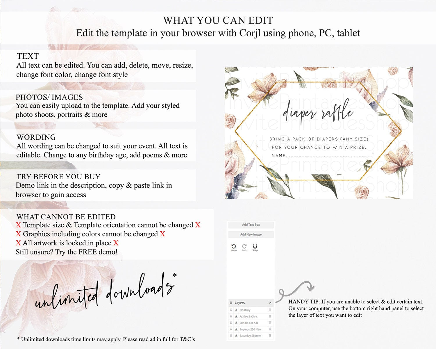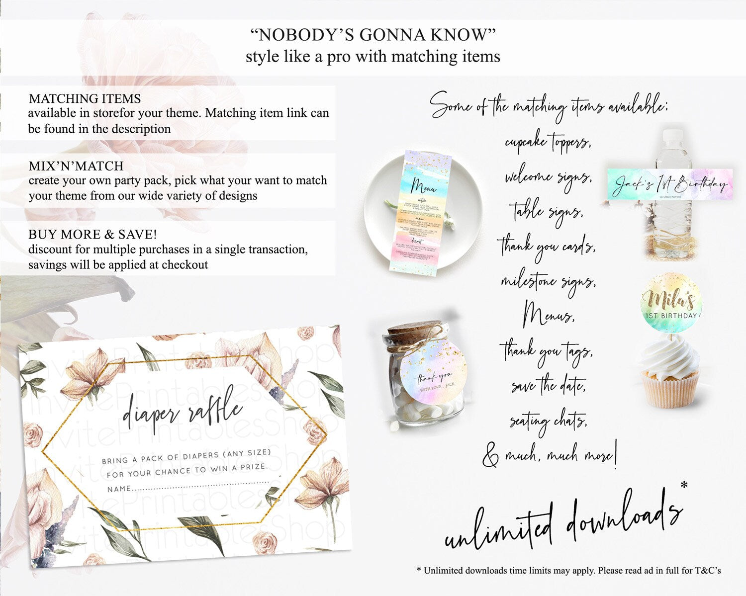 Secret Garden Diaper Raffle Card Boho Wildflower Diaper Raffle Insert Pastel Flower Garden Baby Shower Card Flower Raffle Game D10504