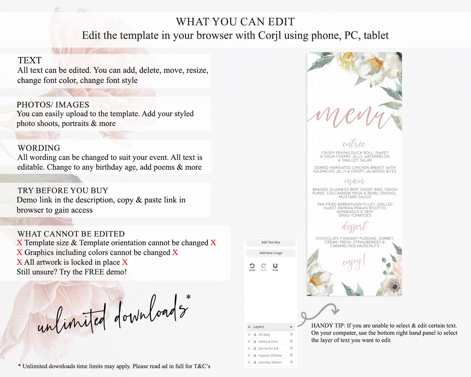 • Template size & orientation cannot be changed. Please use the demo link to confirm this product suits your needs.