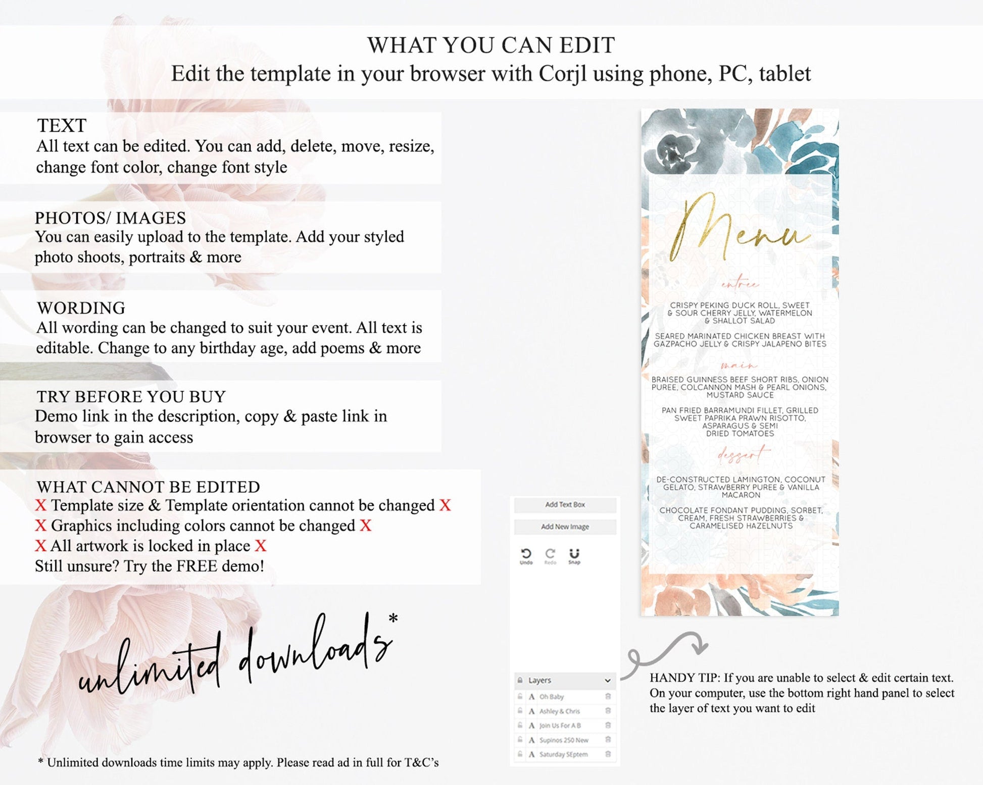 • Template size & orientation cannot be changed. Please use the demo link to confirm this product suits your needs.