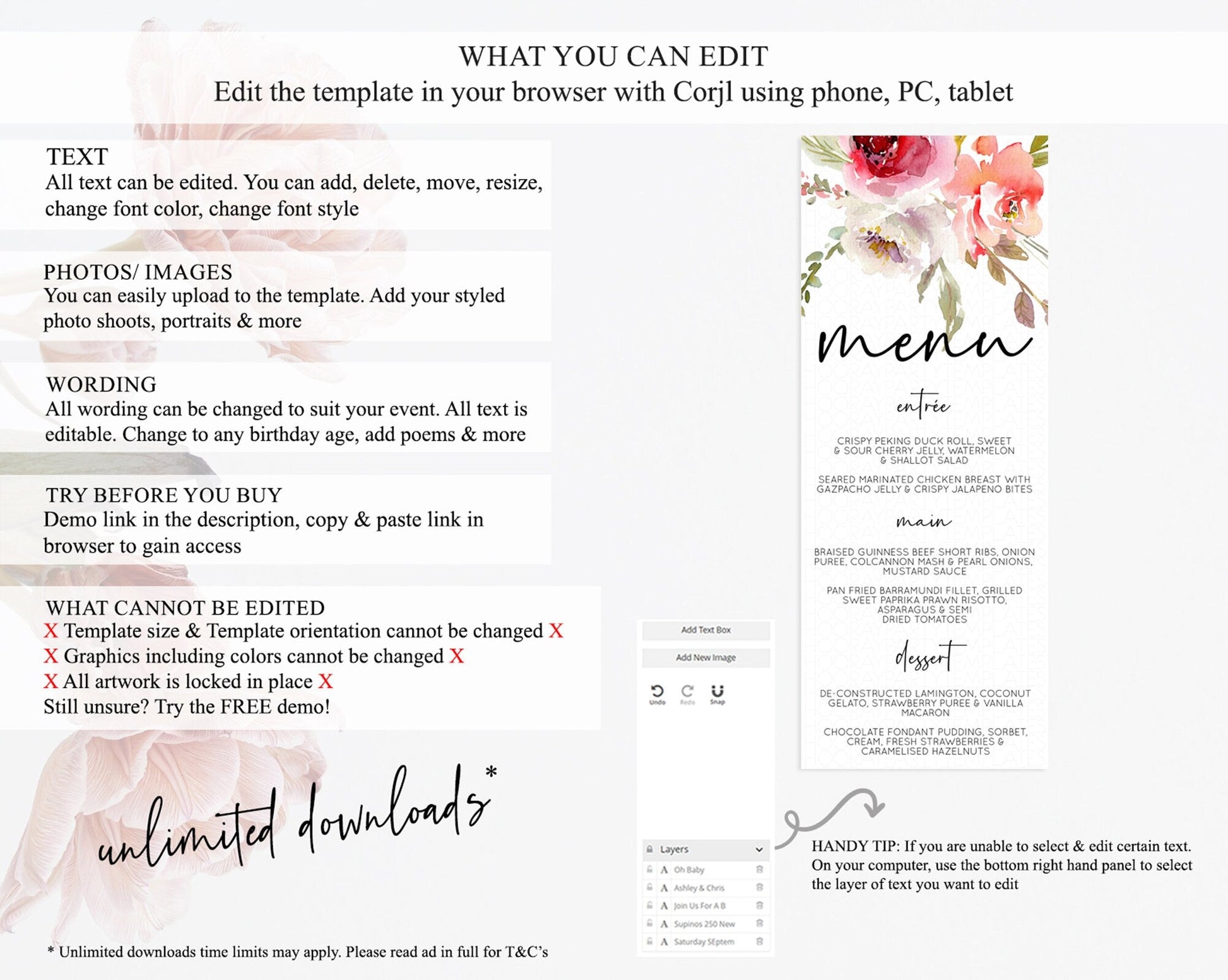 • Template size & orientation cannot be changed. Please use the demo link to confirm this product suits your needs.