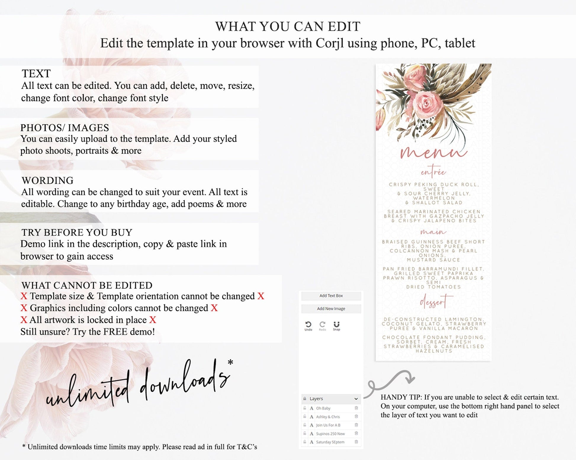 • Template size & orientation cannot be changed. Please use the demo link to confirm this product suits your needs.