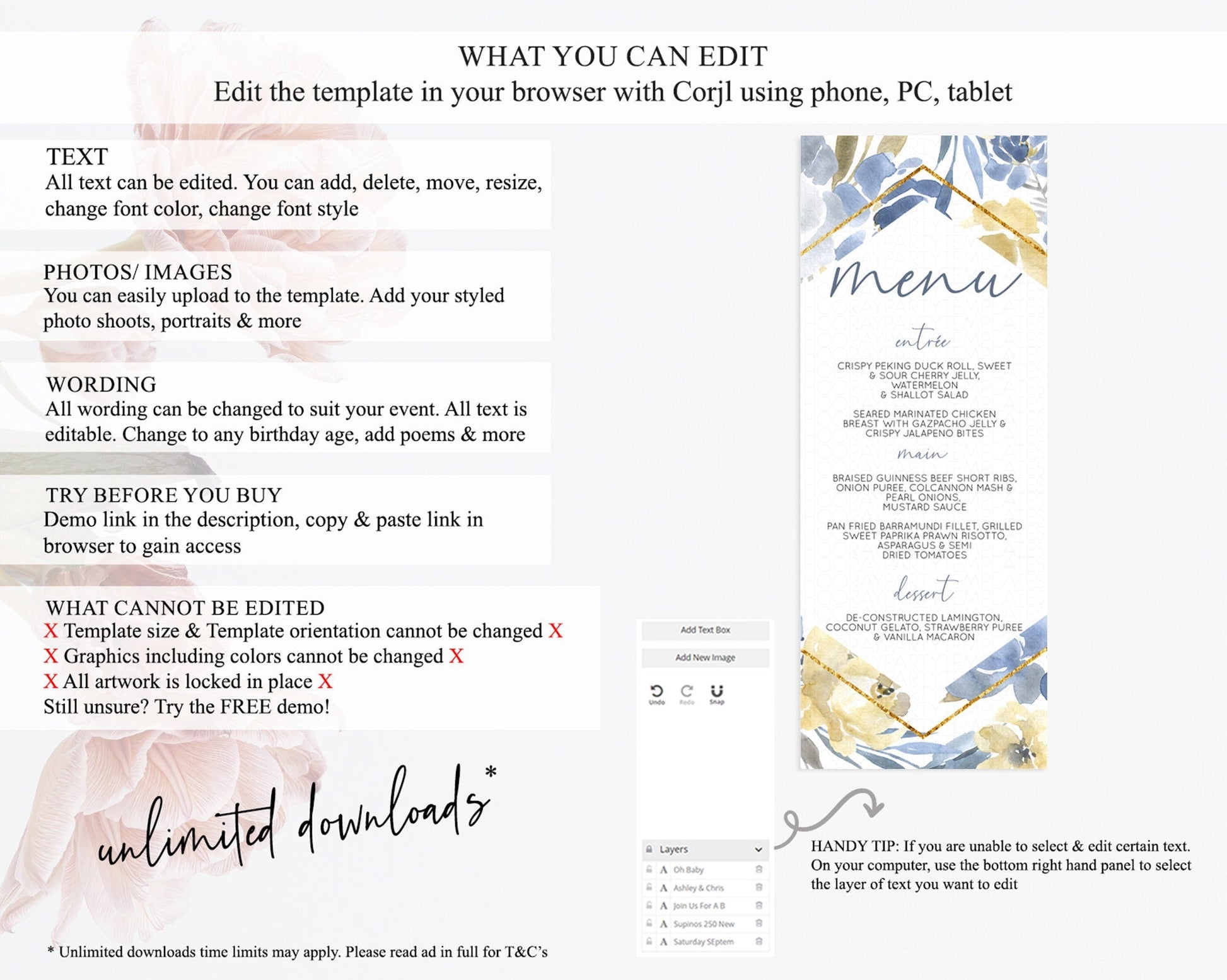• Template size & orientation cannot be changed. Please use the demo link to confirm this product suits your needs.