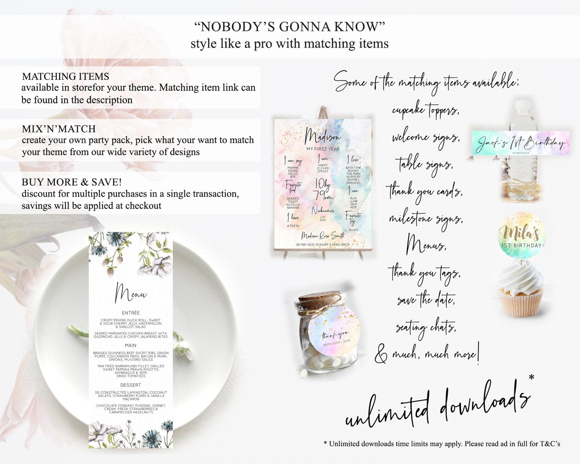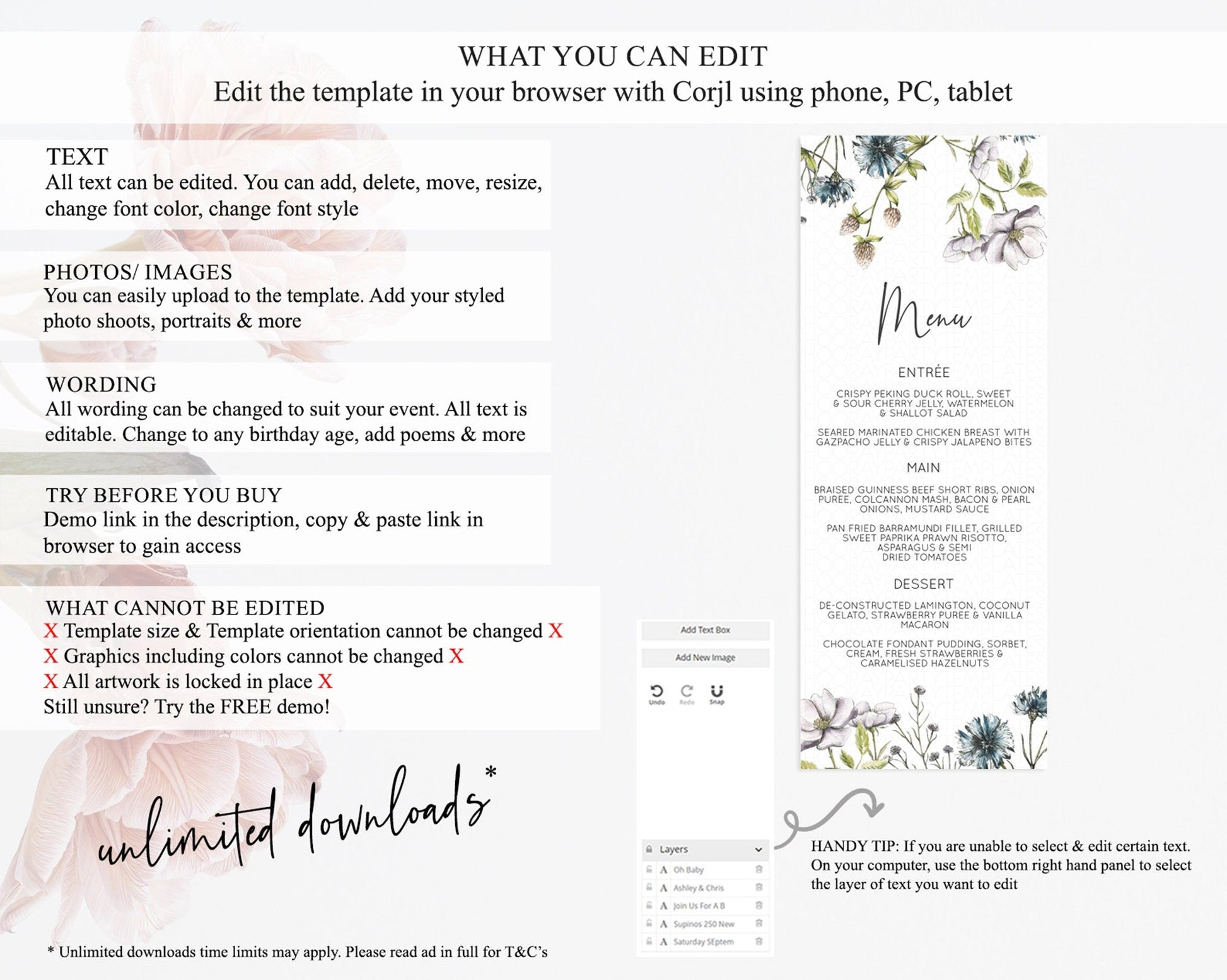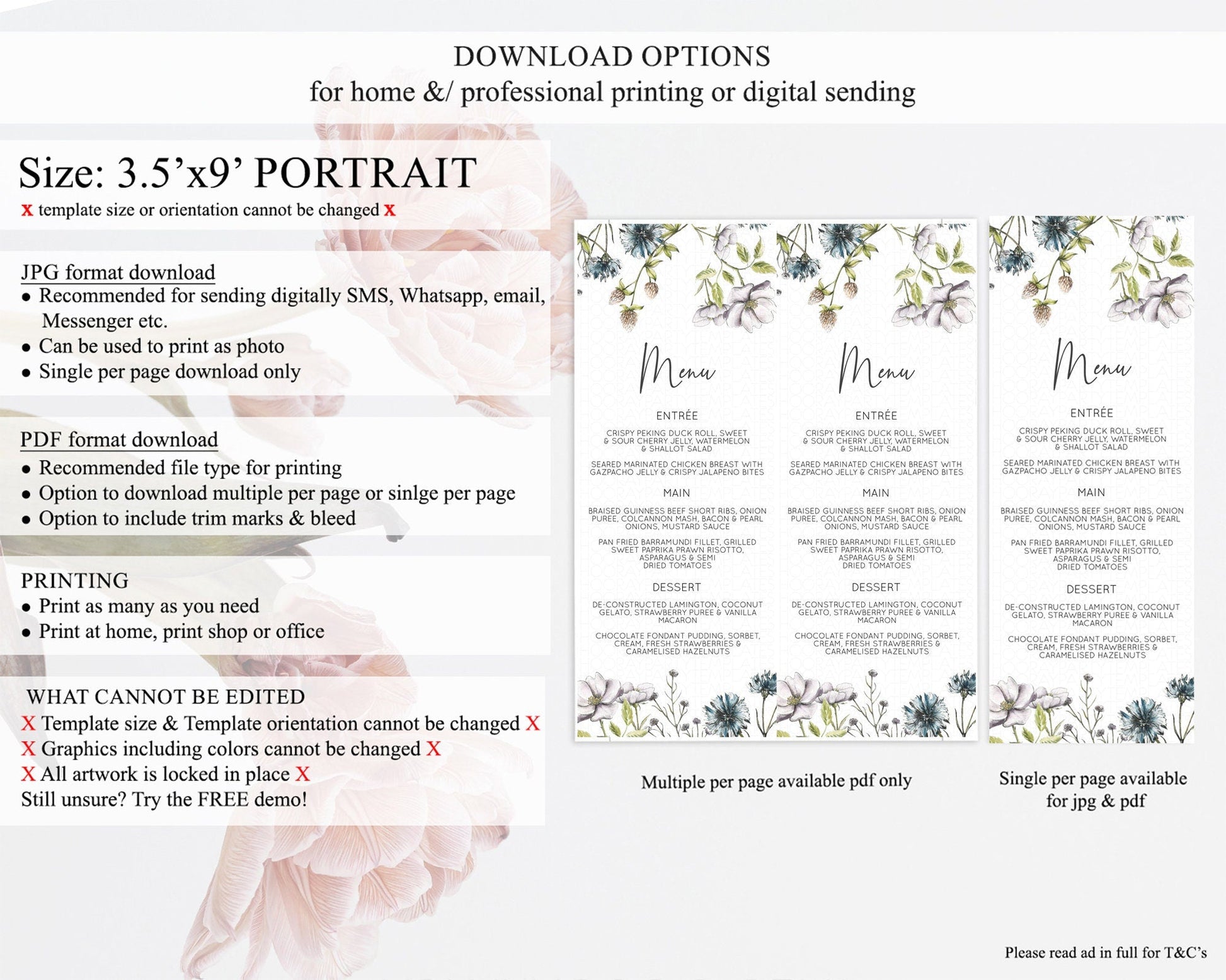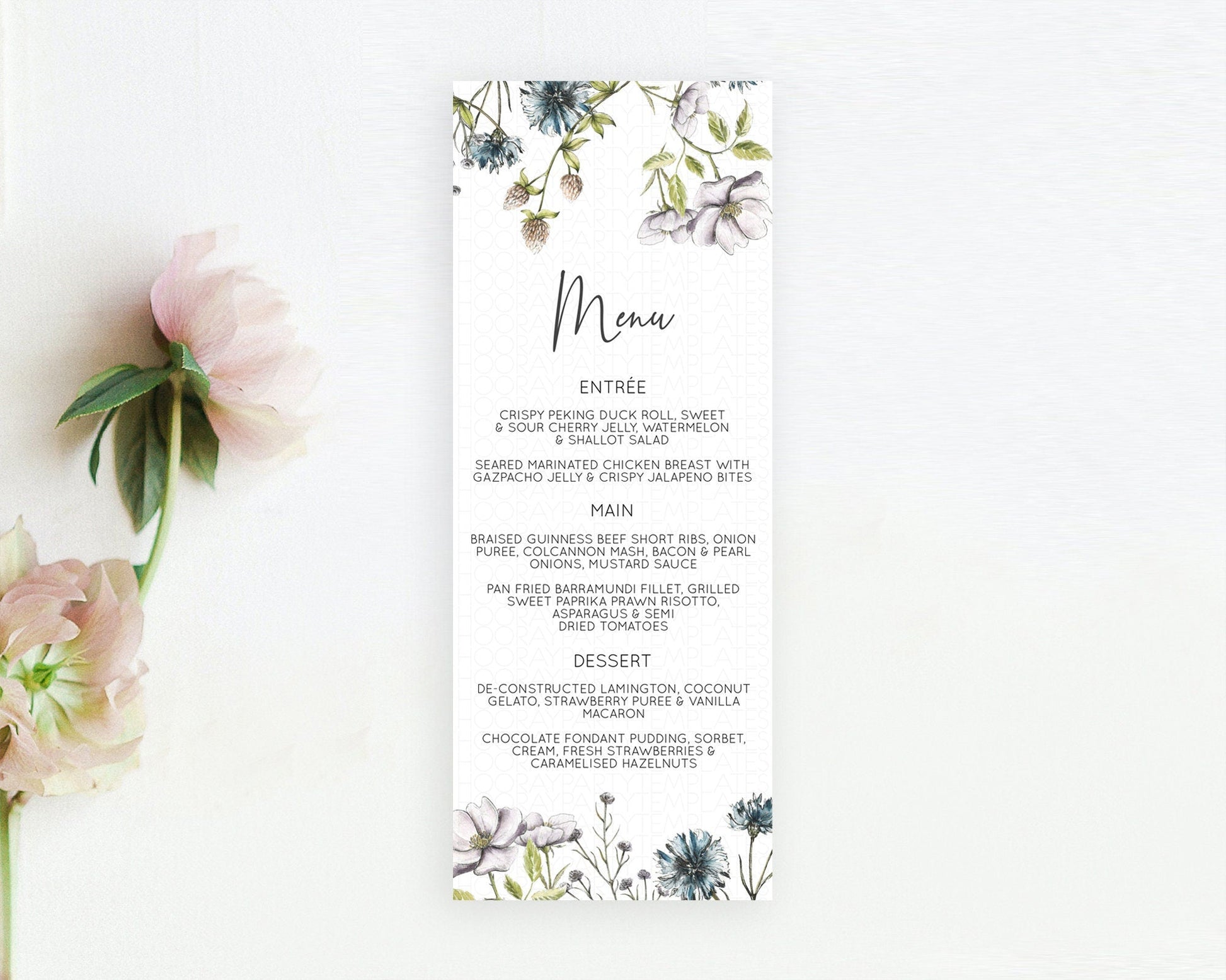 Secret Garden Menu Wildflower Menu Template Pastel Flower Garden Table Decor Boho Floral Dinner Dessert Floral Party Food Menu D11002