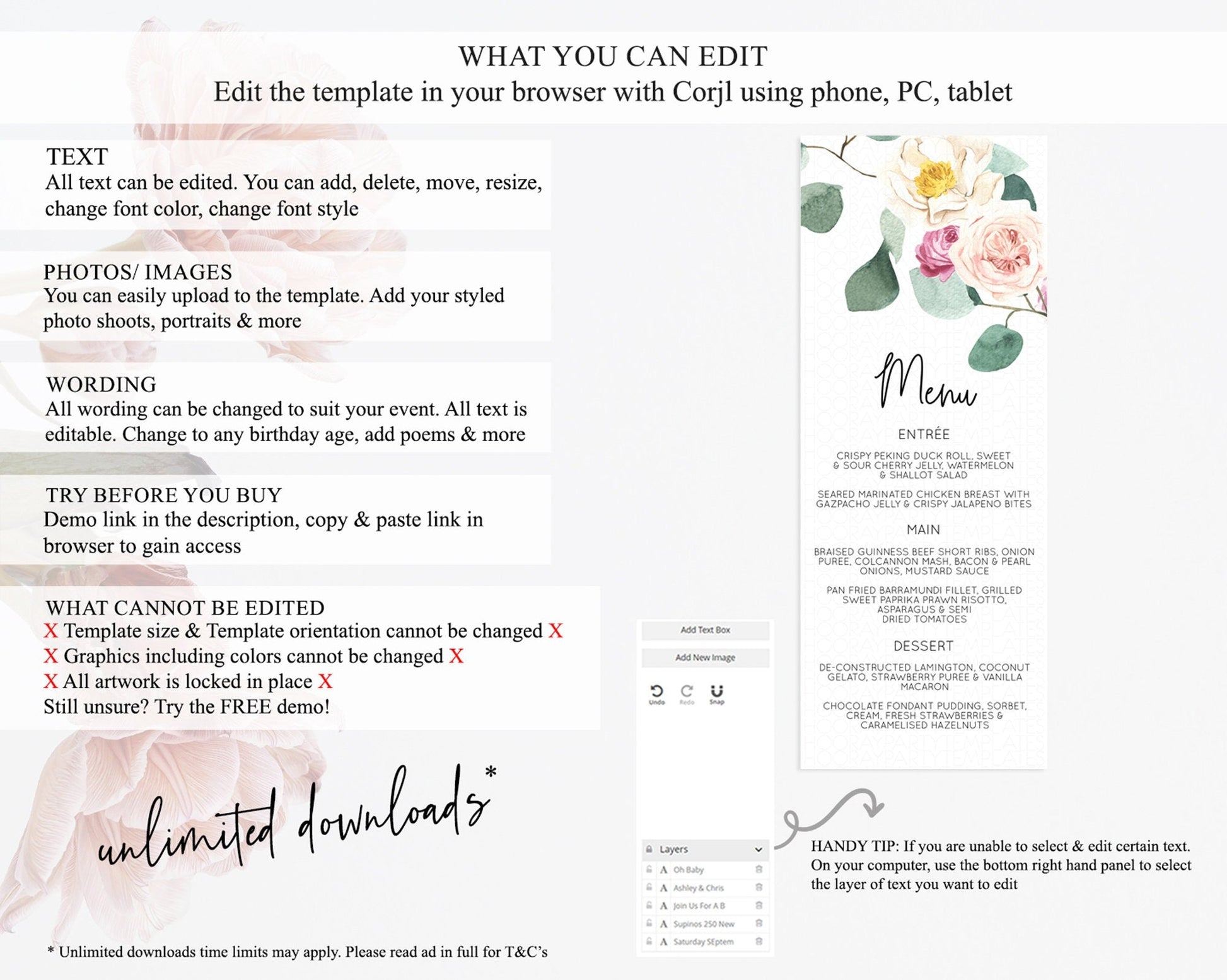 • Template size & orientation cannot be changed. Please use the demo link to confirm this product suits your needs.
