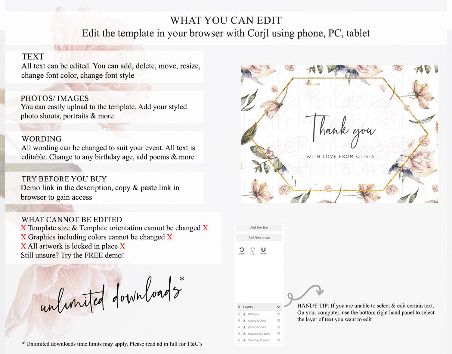• Template size & orientation cannot be changed. Please use the demo link to confirm this product suits your needs.