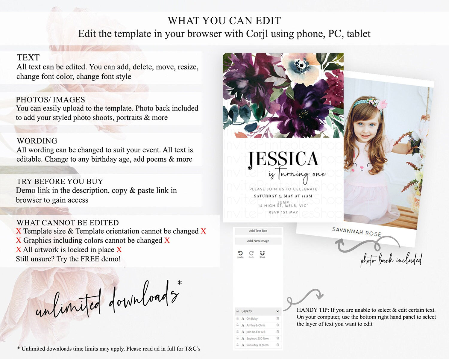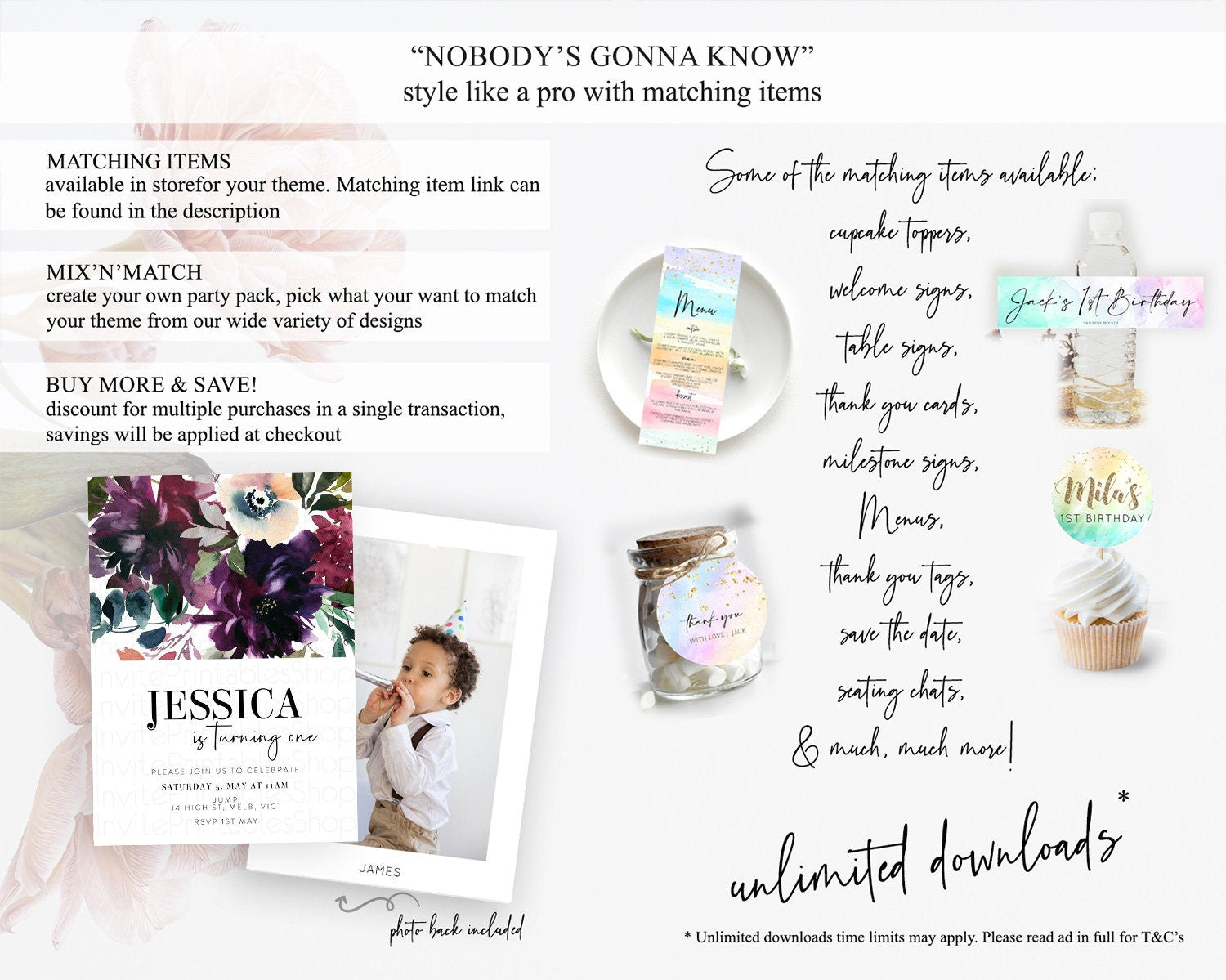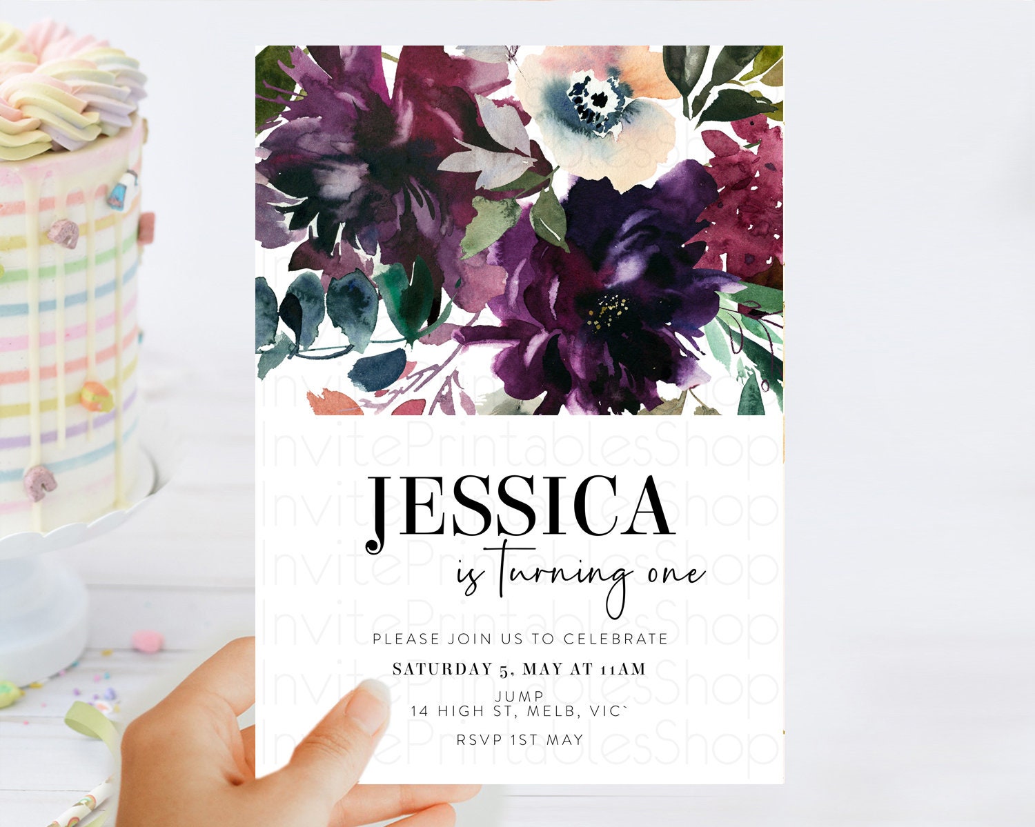 Secret Garden Wildflower Birthday Invitation, Pastel Burgundy Flowers, Boho Floral, 1st, 2nd, 3rd Birthday, D11062