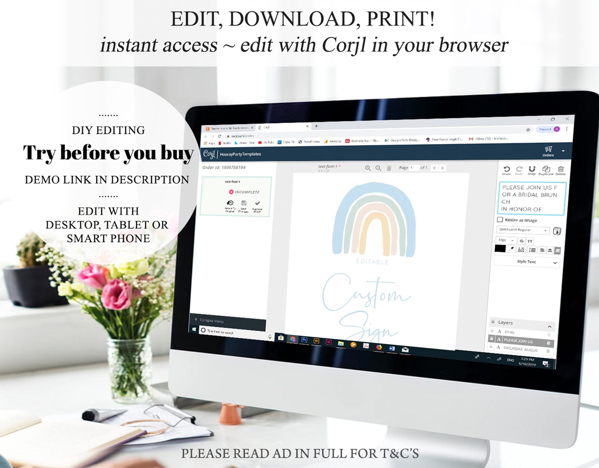 •Try before you buy! • DEMO LINK- https://www.corjl.com/d/8APEC Matching Items: https://etsy.me/3mSN8x4 PLEASE READ AD IN FULL!! •Digital file. No physical item will be shipped •Do it yourself Editing. Edit online with Corjl or Edit with your mobile ITEM DETAILS Sign size: 8’x10’ File type: PDF, JPEG Resolution: 300DPI PDF FILE OPTIONS: •Recommended for printing •Option to include bleed/ trim marks JPG FILE OPTIONS: •Can be used to print as photo •Option to include bleed/ trim marks EDITING • Do it yourself editing • Mobile editing is available • Google chrome is the recommend browser for Corjl. Please download here for FREE: https://www.google.com/chrome/ • Using other browsers may not show all of Corjl's editing features • Editing on a desktop/ laptop computer is recommended to access all of Corjl features • Mobile editing is available, please use a desktop/ laptop computer to access all of Corjl features DOWNLOADS & EXPIRY •Maximum 3 downloads on the same edit •Link expires 30 days after purchase DOWNLOAD NOTICE •Once you have reached your download limits &/ “approve proof” in Corjl. You will not be able to request further downloads on your design. Further download requests are not permitted WHAT IS EDITABLE •Text - colours, fonts, size, move, delete & rotation. •Upload photos to the design •Please see demo link for what you can and can’t do WHAT YOU CAN’T EDIT •Template size •Template orientation •Graphics CAN NOT BE deleted, moved, or changed in colour •Please see demo link for what you can and can’t do HOW TO 1. Choose design template & checkout on Etsy. 2. Email will be sent from Corjl. Follow link to access template 3. Edit, save & print INSTRUCTIONS •Instructions on how to edit your design have been written by Corjl and will be available with your purchase. PRINTING •Colours can vary depending on the monitor, printer & cardstock •Can be printed at home •Home printing will require you to select the high quality print settings, select appropriate paper thickness & click "Actual size" prior to you printing •This design was test printed on 100 gsm paper •Can be printed at local print shop. Please check printing requirements & any printing restrictions prior to purchase PERSONAL USE ONLY. This item cannot be shared, re-sold, or used commercially for profit. REFUND POLICY •We are unable to provide a refund/ exchange on commenced & completed work, instant downloads or self-editing link templates. Please use the demo link to work out if this product is right for you. Copyright © 2018 by InvitePrintablesShop PTY LTD All rights reserved. This file or any portion thereof may not be reproduced or resold without the express written permission of the publisher (including edits to the design). Our files are provided as high-resolution PDFs – the end result is dependent upon the printer and paper used. If using a professional printing company, InvitePrintablesShop are not responsible for their specific printing requirements, paper or colour quality. Any changes required to the template are not included with your purchase – the files come as described in the listing only and cannot be changed. Thank you for visiting Invite Printables Shop:)