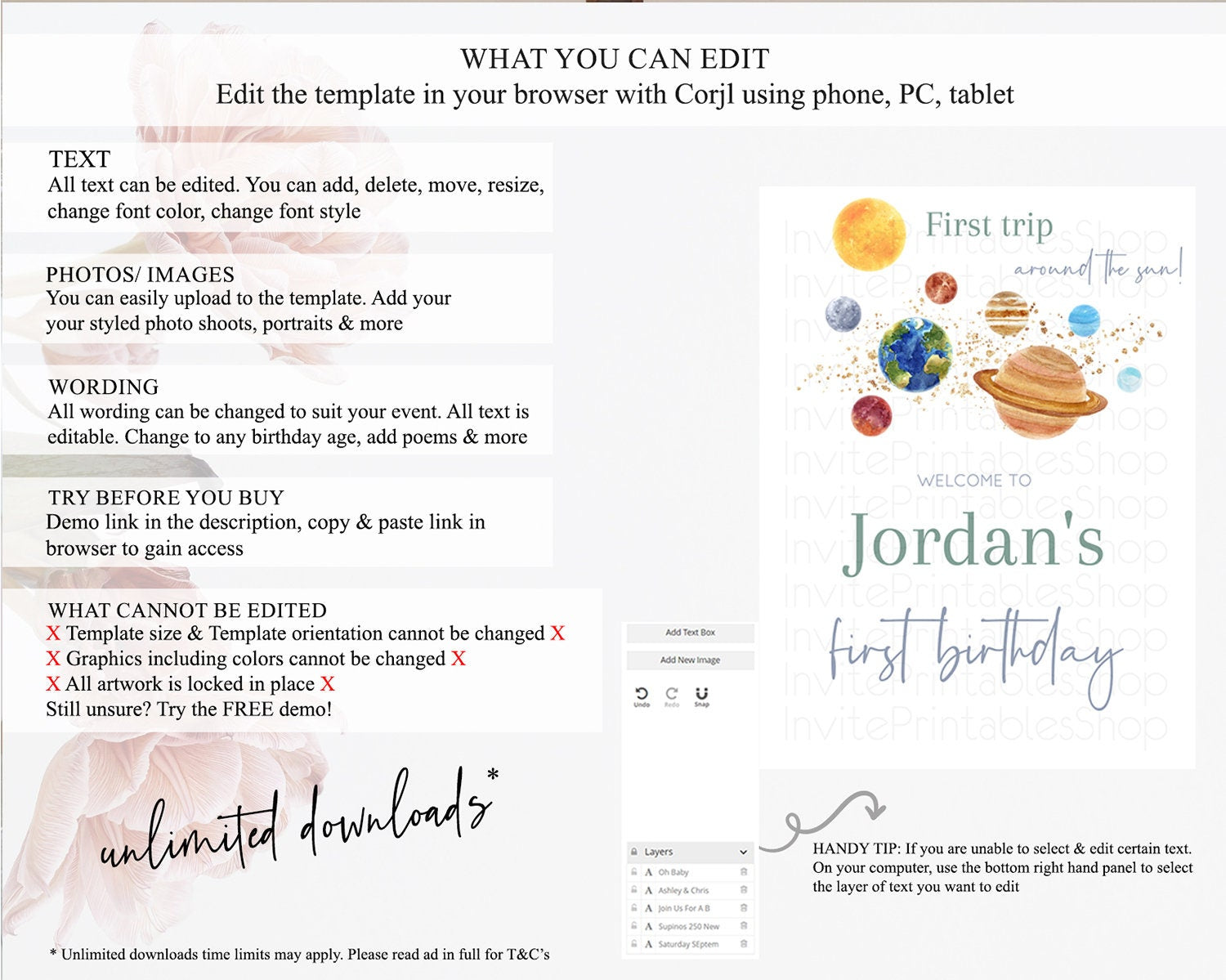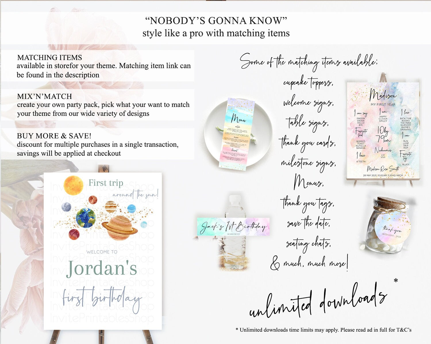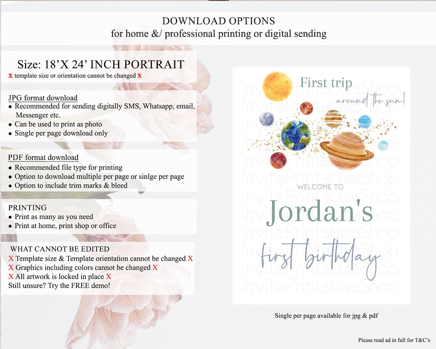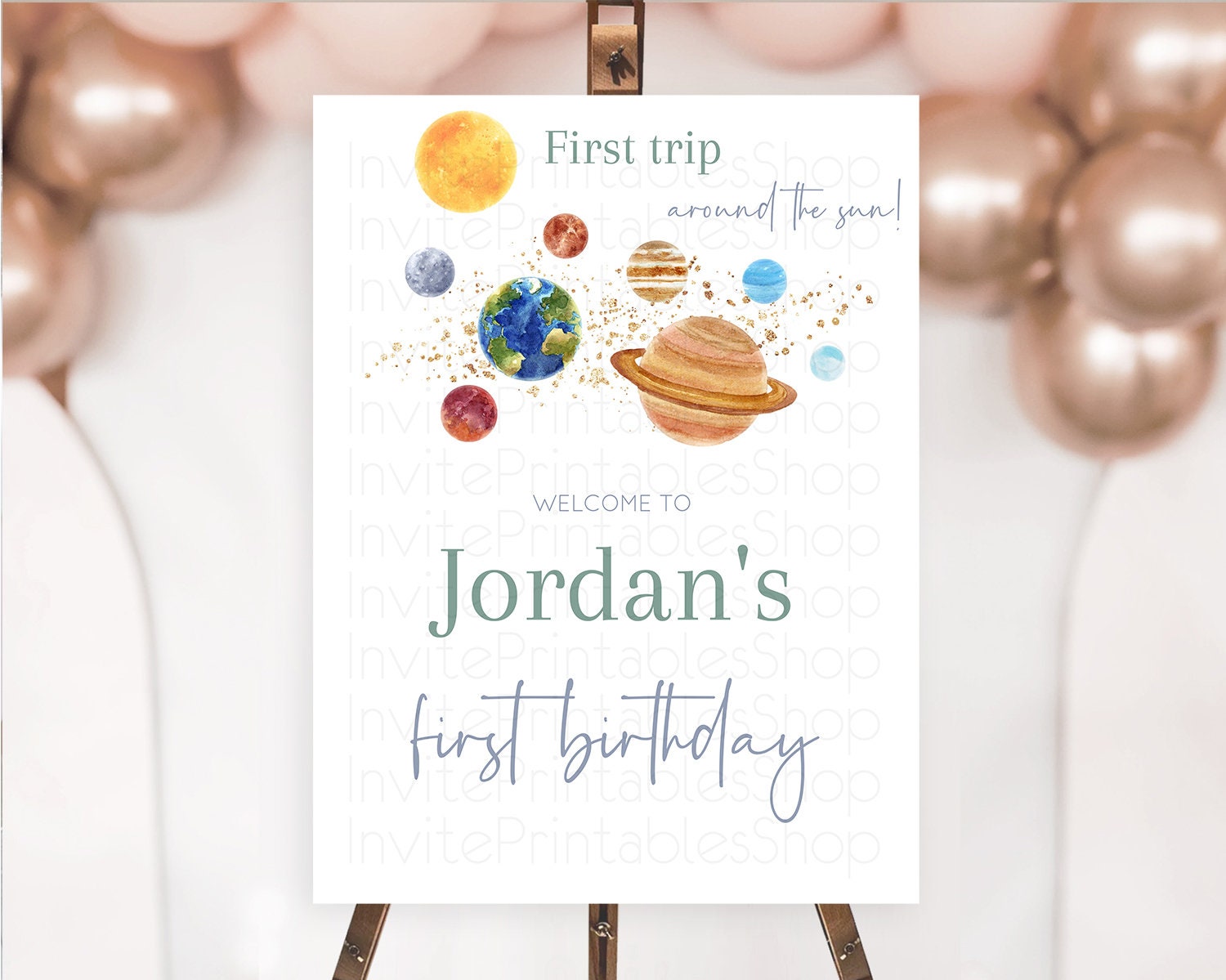Space Birthday Welcome Sign Space Welcome Board First Trip Around the Sun Welcome Poster Planets Solar System ONE year Birthday Sign D10598
