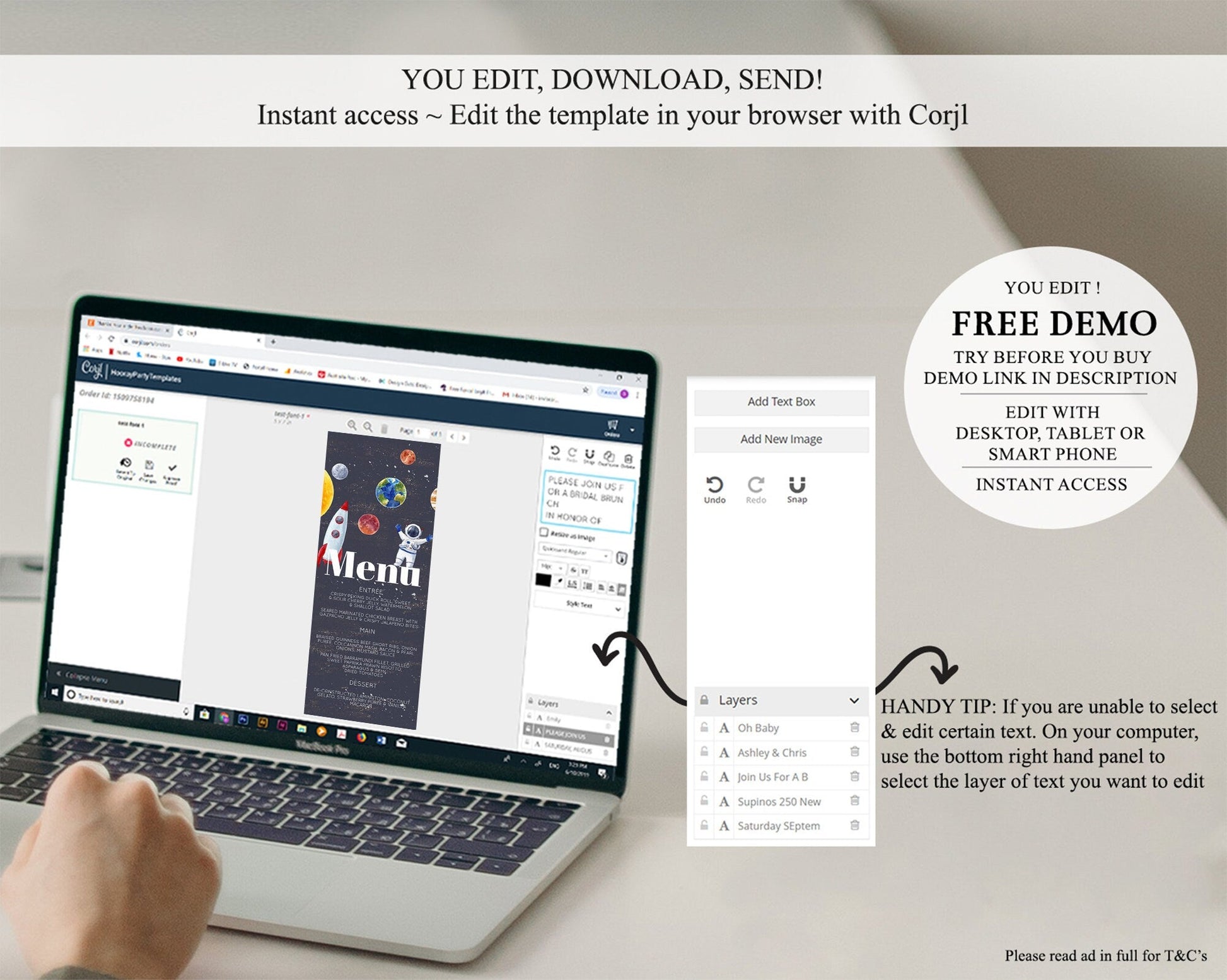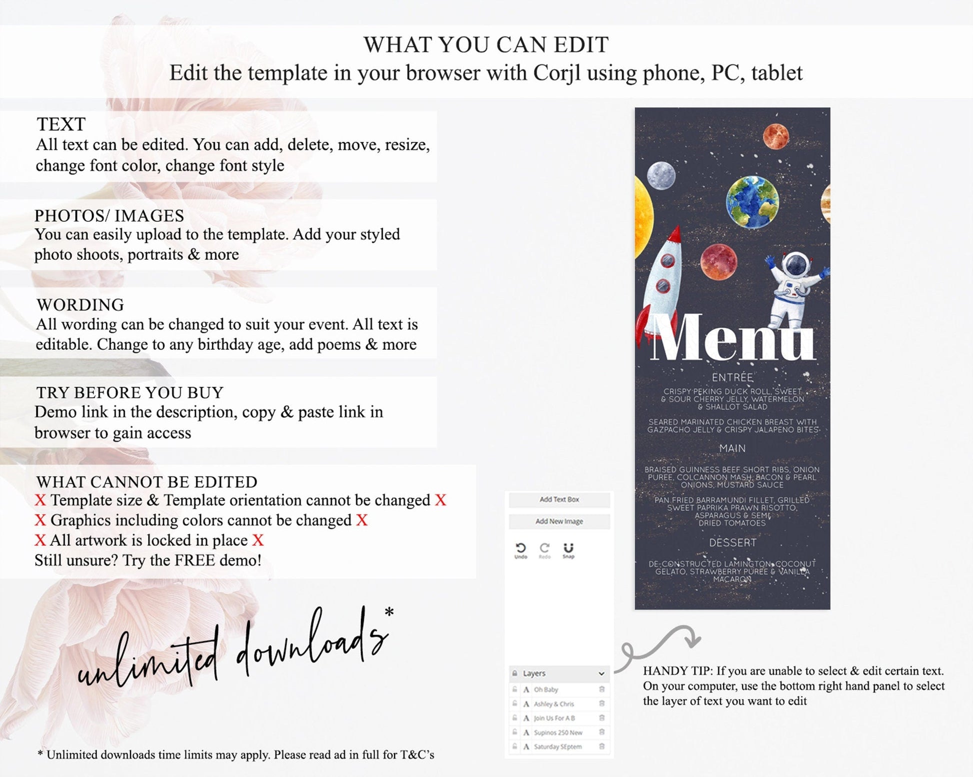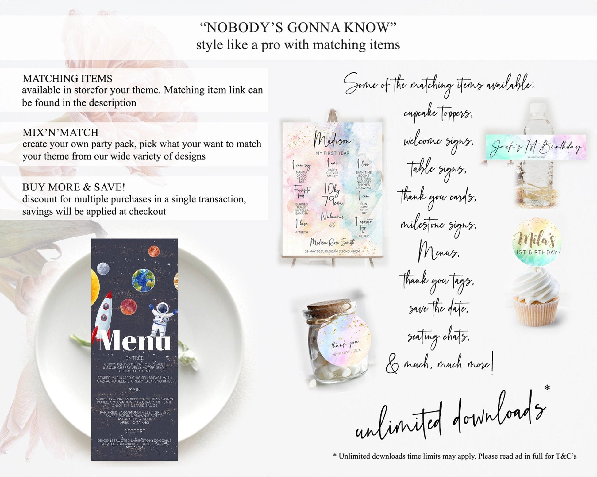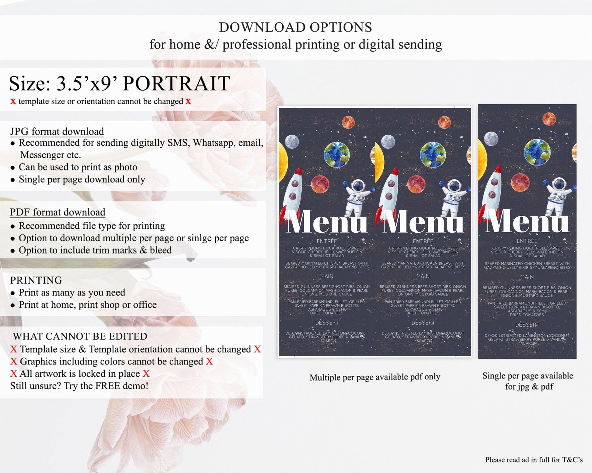 Space Menu Space Menu Template First Trip Around the Sun Table Decor Planets Solar System ONE year Food Menu Dinner Dessert Menu D10144