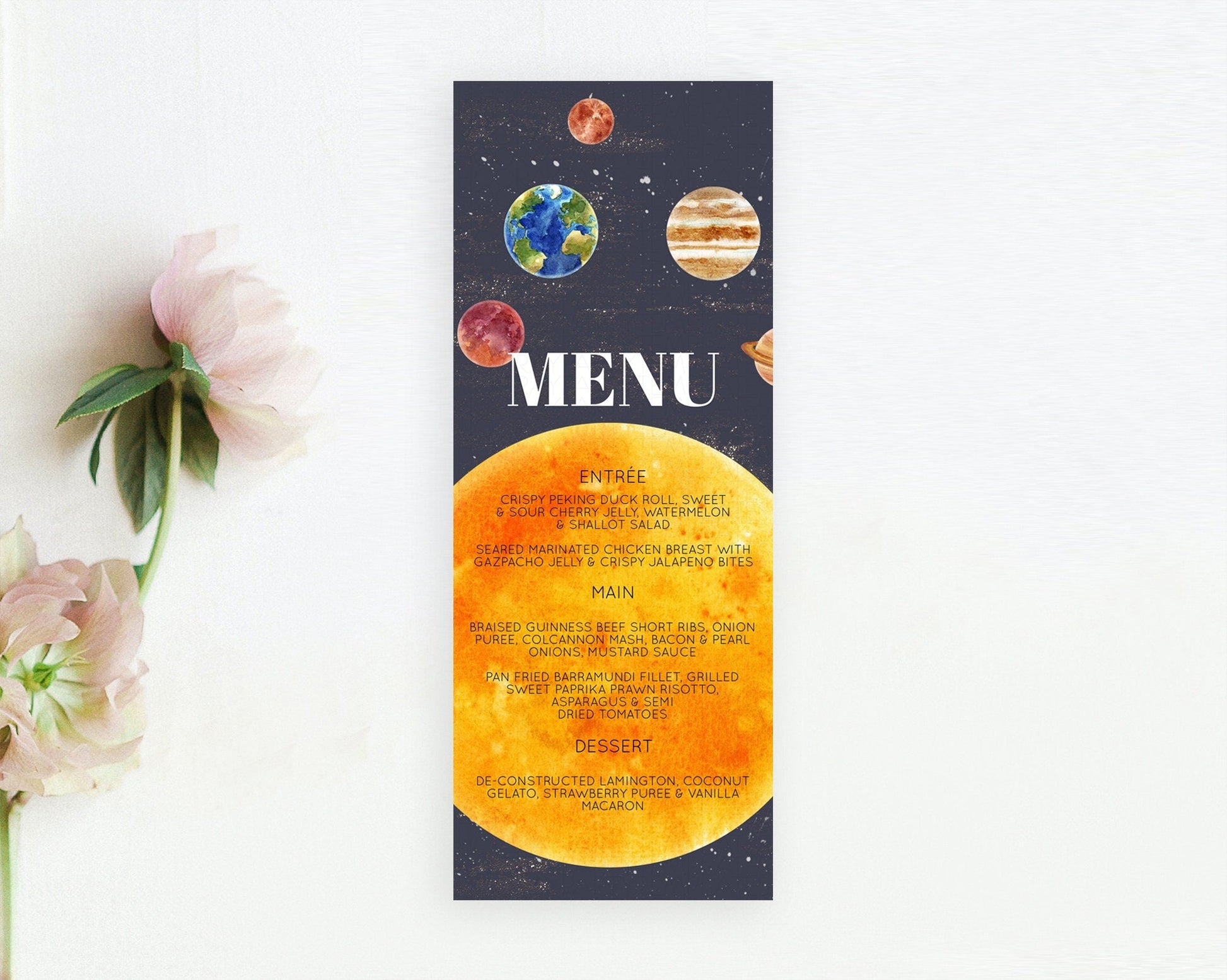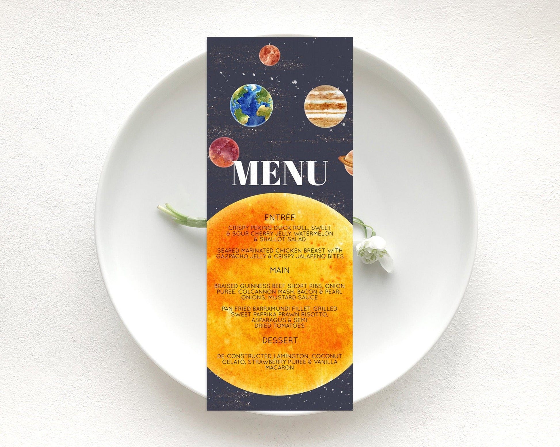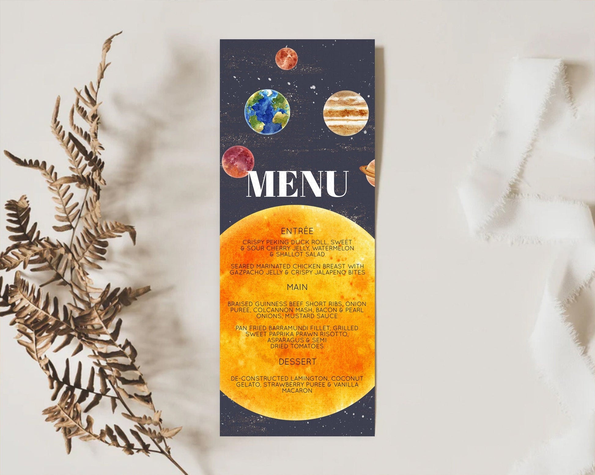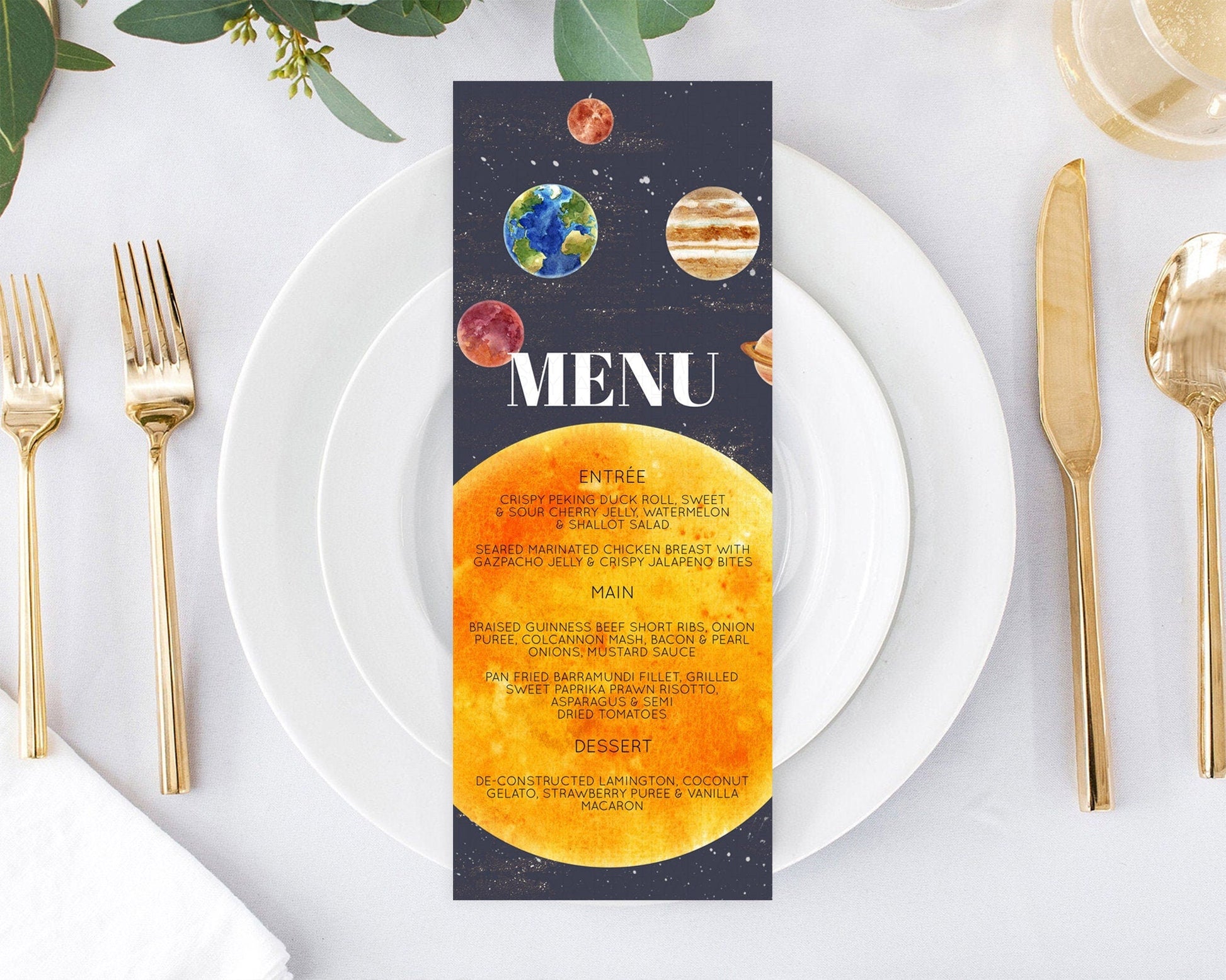 Space Menu Space Menu Template First Trip Around the Sun Table Decor Planets Solar System ONE year Food Menu Dinner Dessert Menu D10430