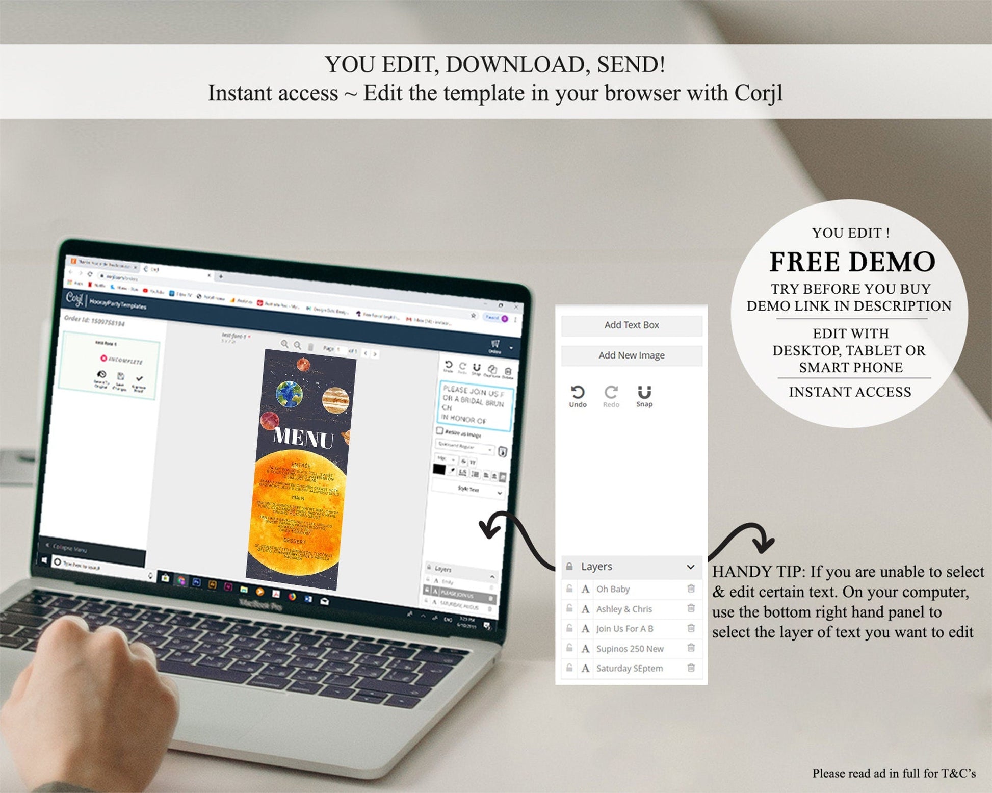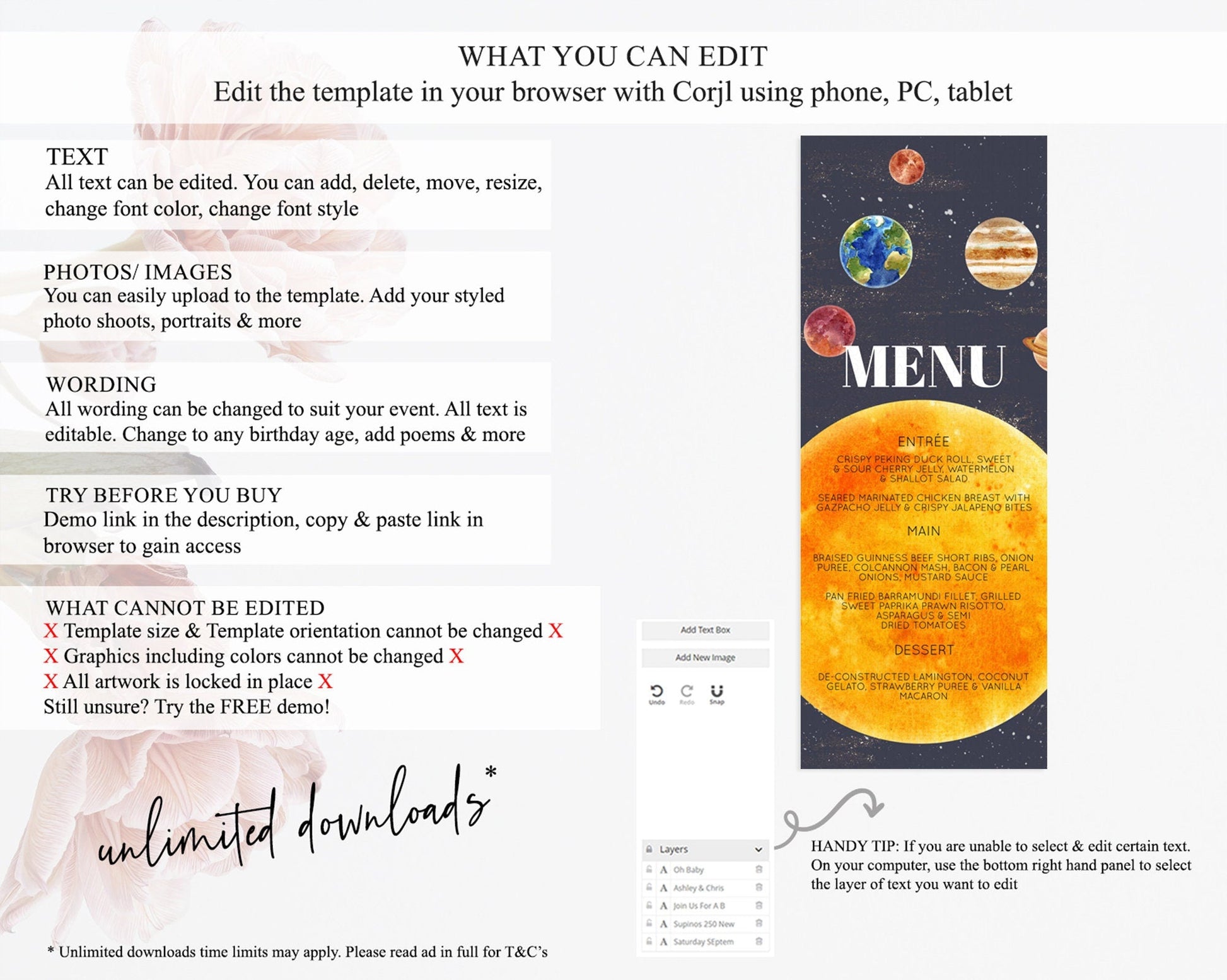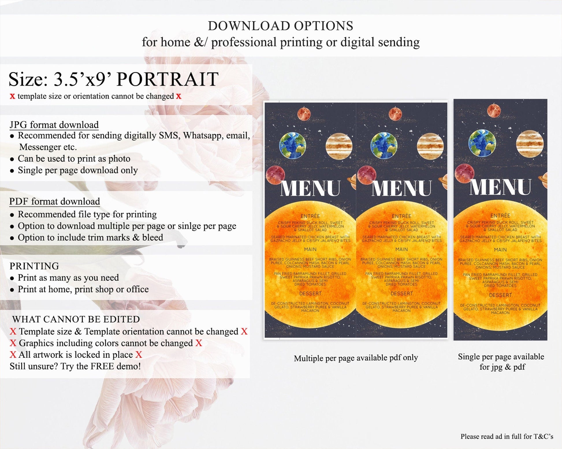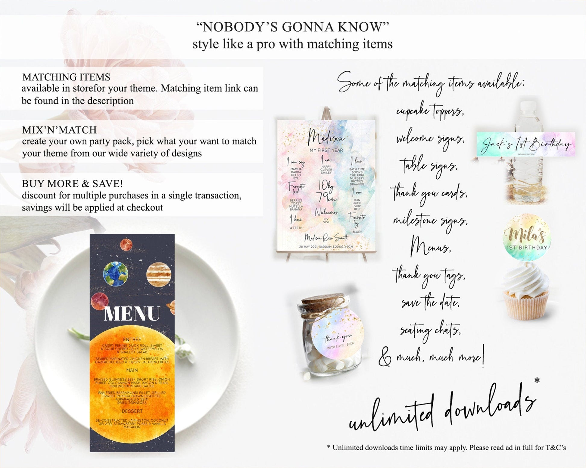 Space Menu Space Menu Template First Trip Around the Sun Table Decor Planets Solar System ONE year Food Menu Dinner Dessert Menu D10430