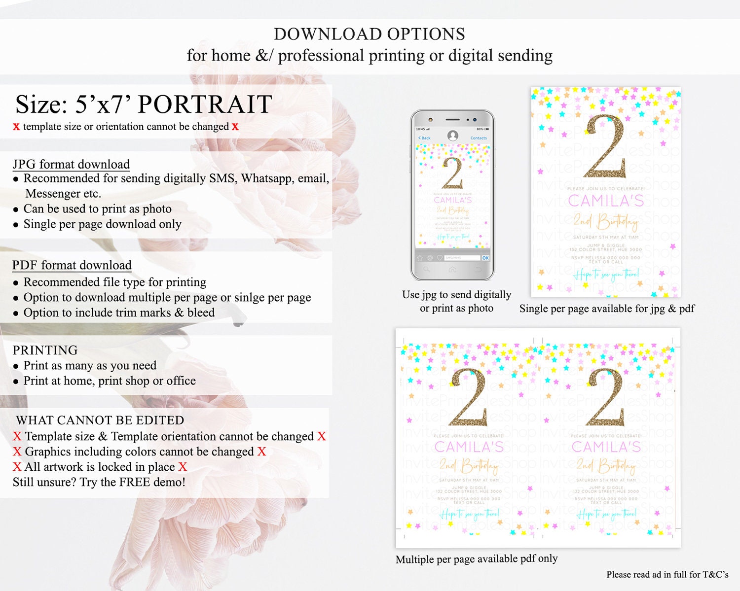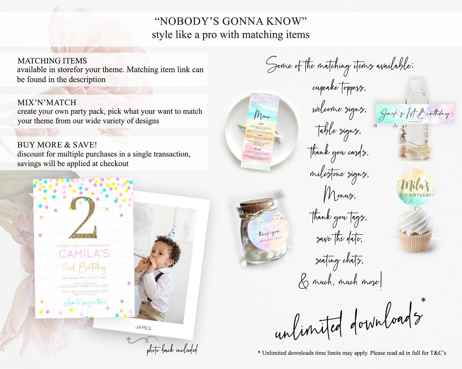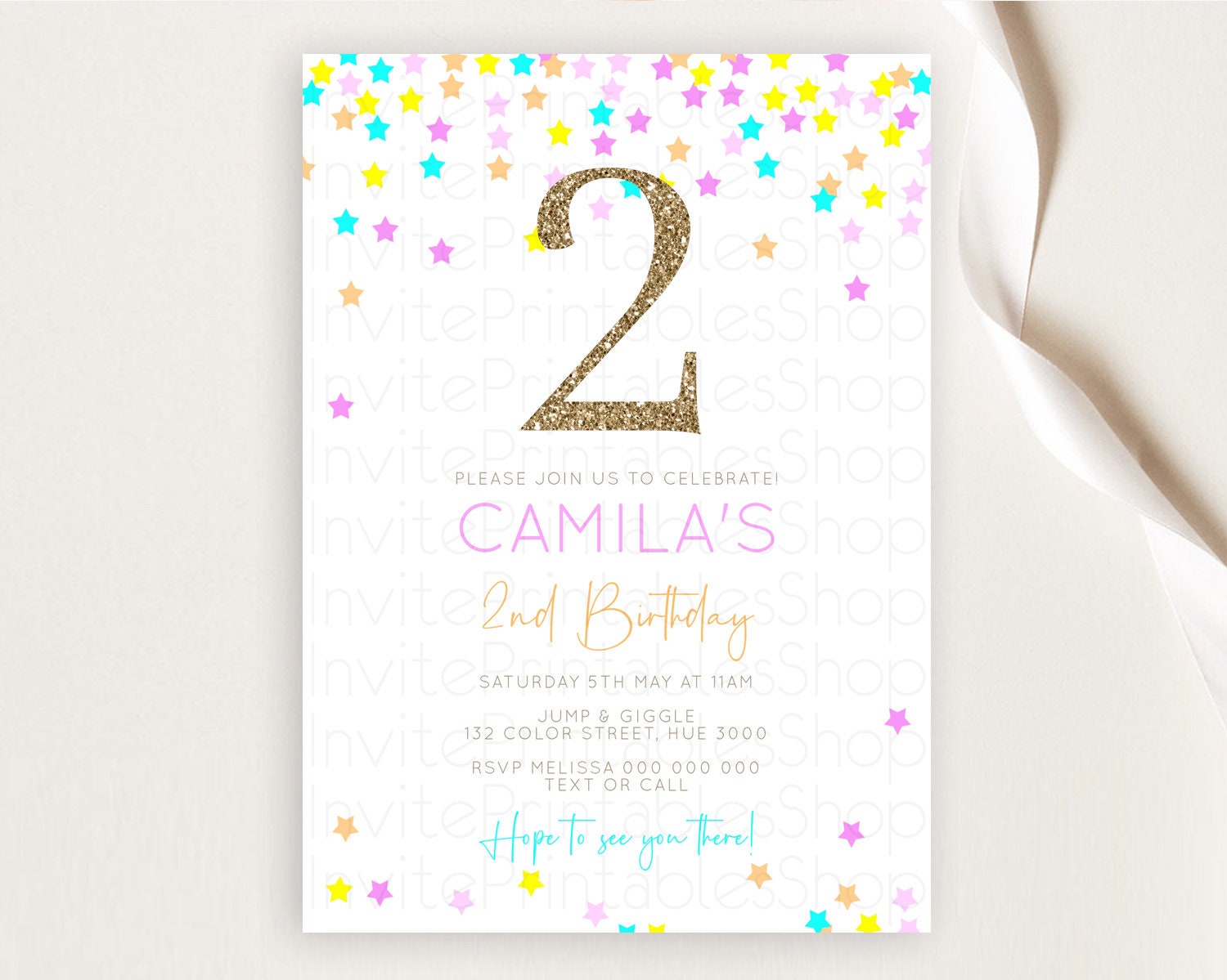Star Birthday Invitation Pastel Stars Invite Shooting Star Party Rainbow Colorful Confetti Twinkle Little Star 2nd First Birthday D10397