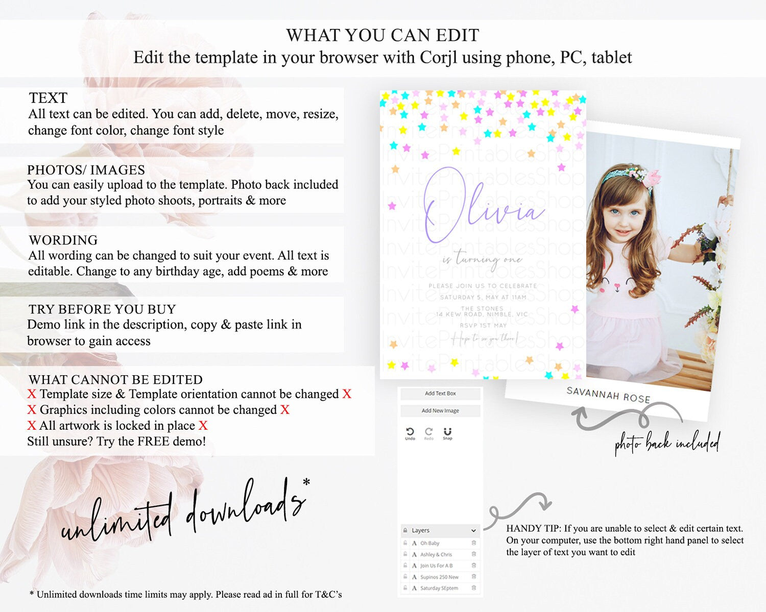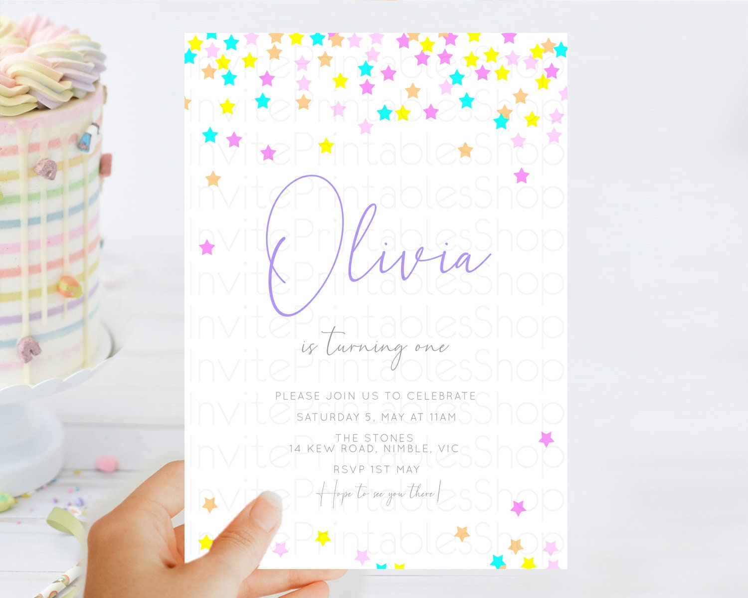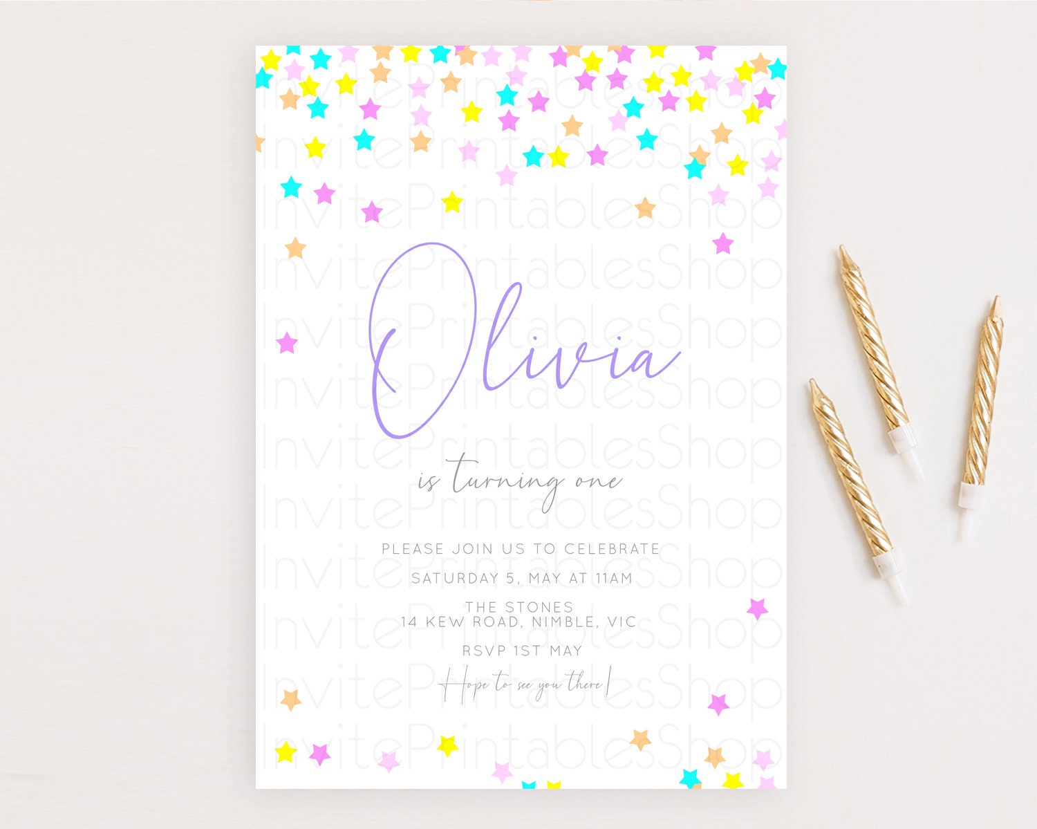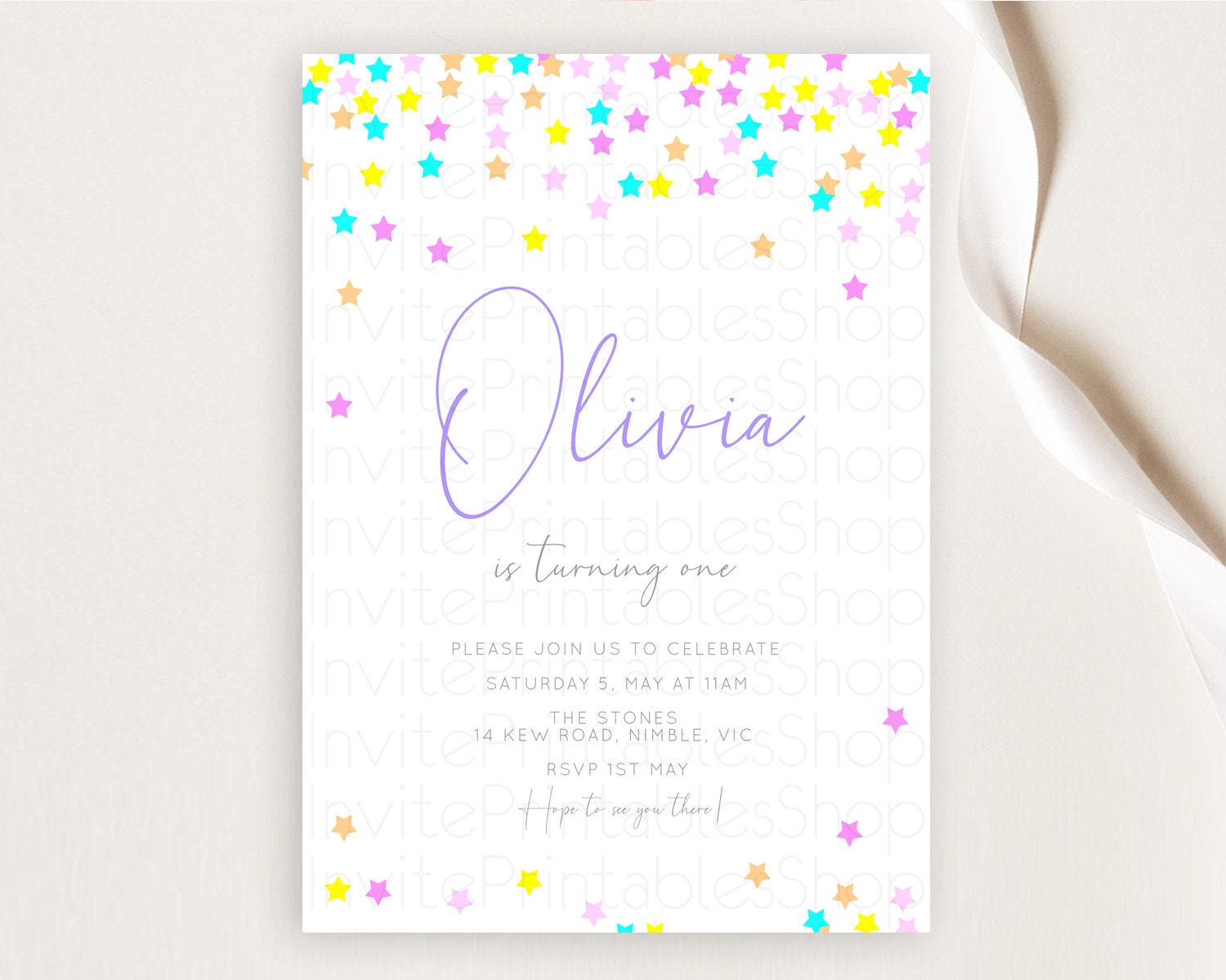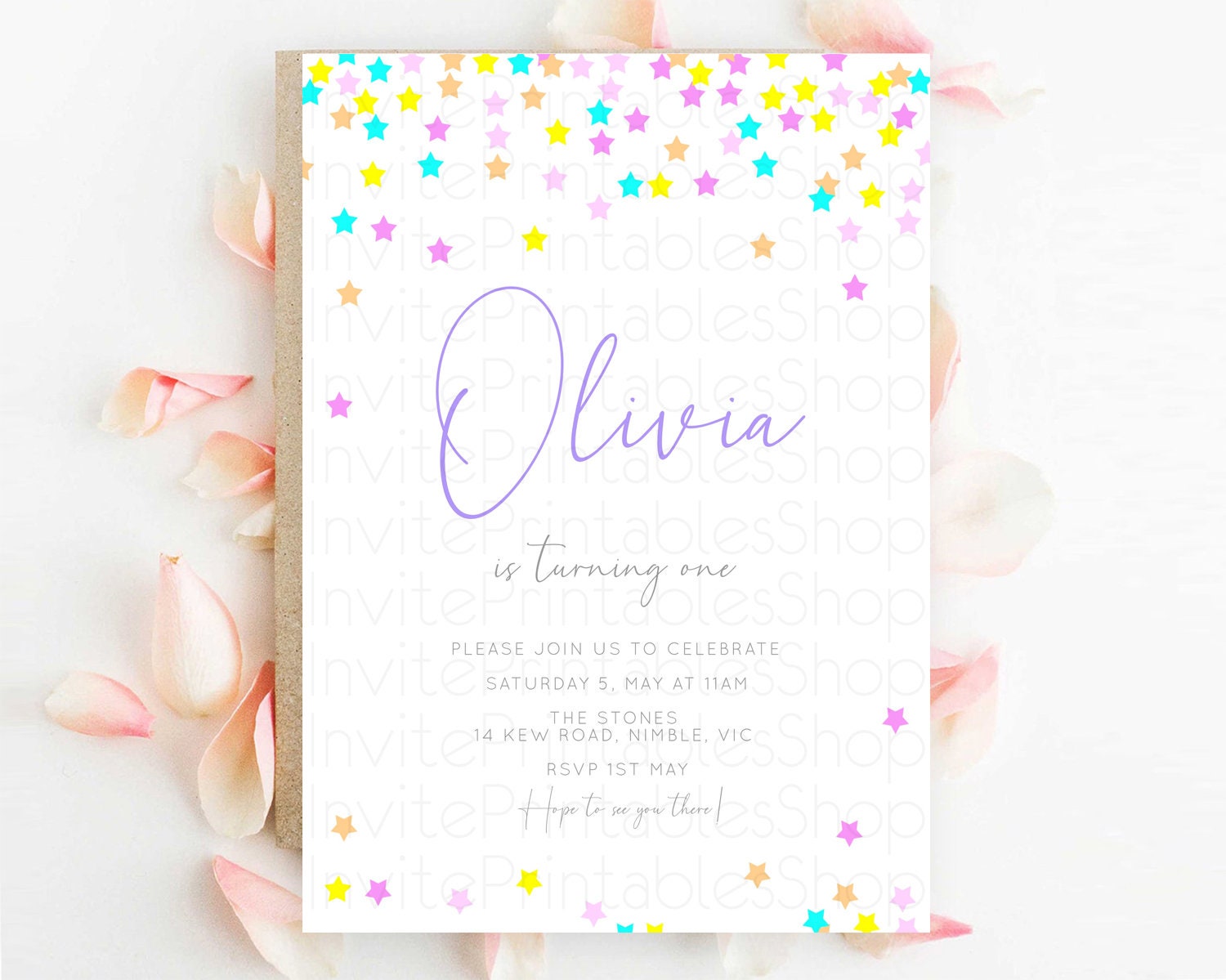 Star Birthday Invitation Pastel Stars Invite Shooting Star Party Rainbow Colorful Confetti Twinkle Little Star 2nd First Birthday D10397