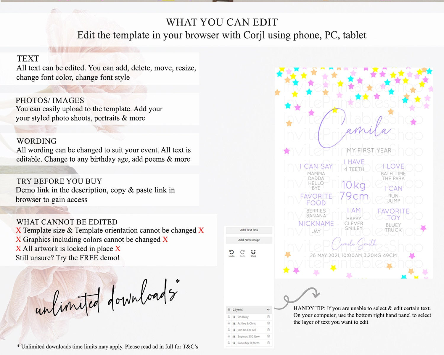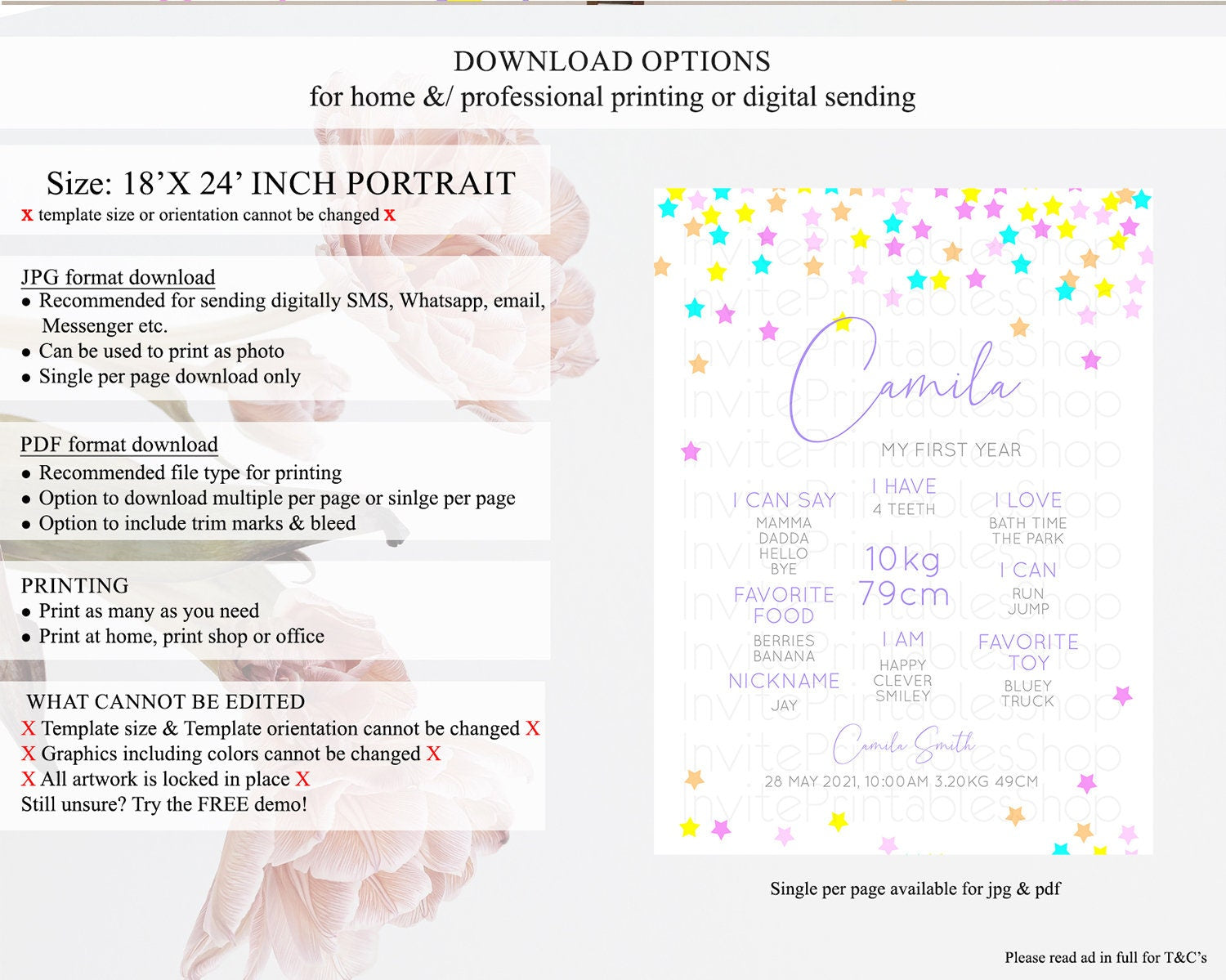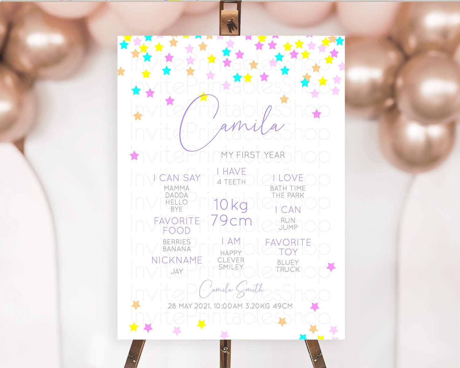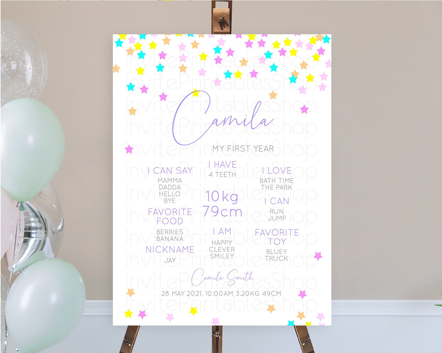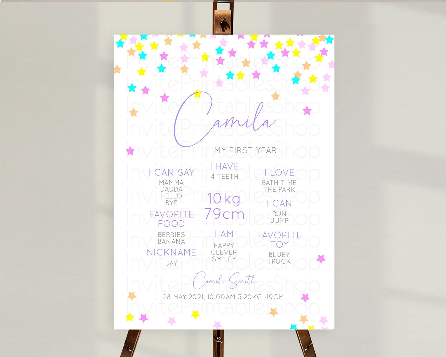 Star First Birthday Milestone Poster Pastel Stars Milestone Shooting Star Rainbow Colorful Confetti Twinkle Little Star 1st Birthday D10397
