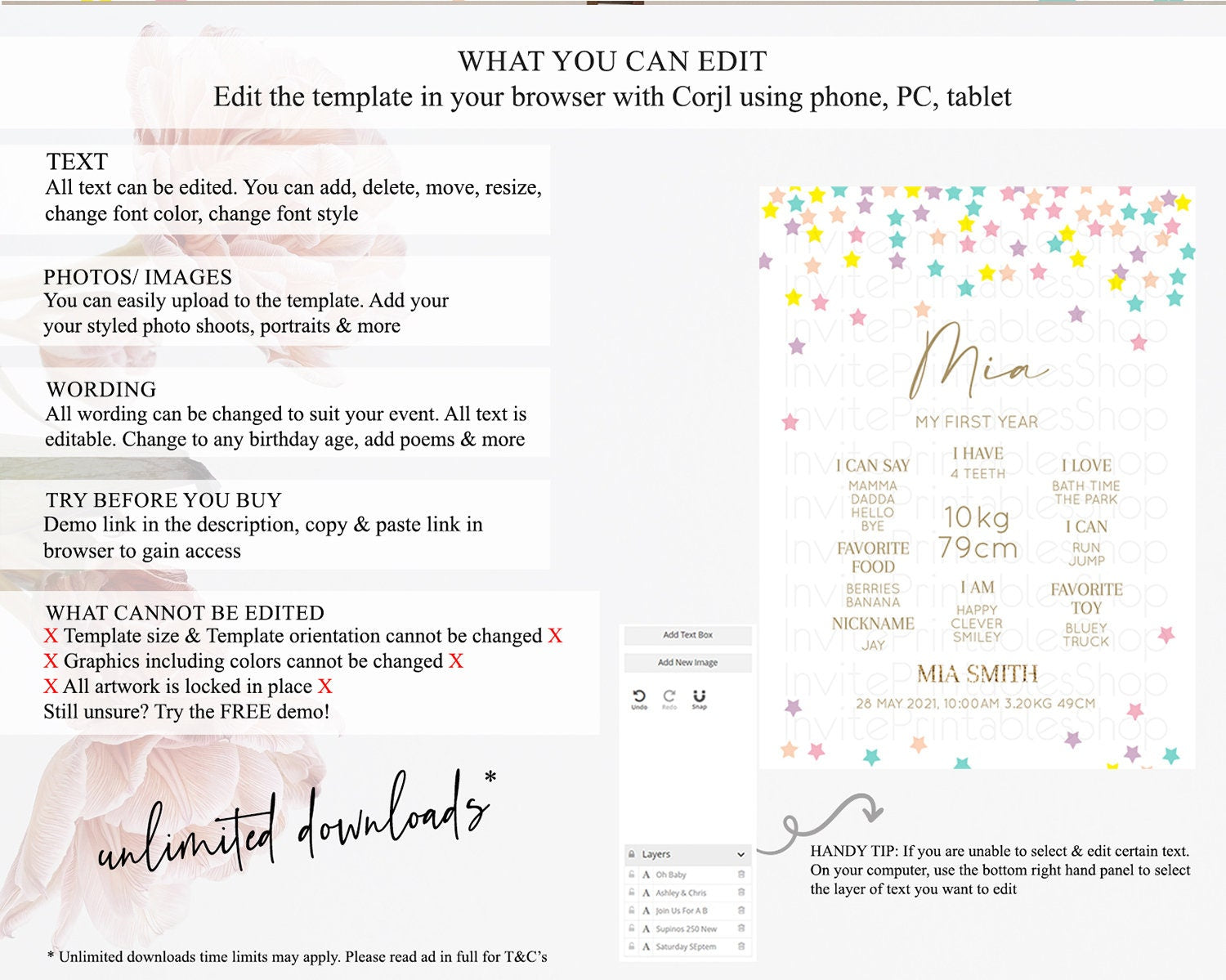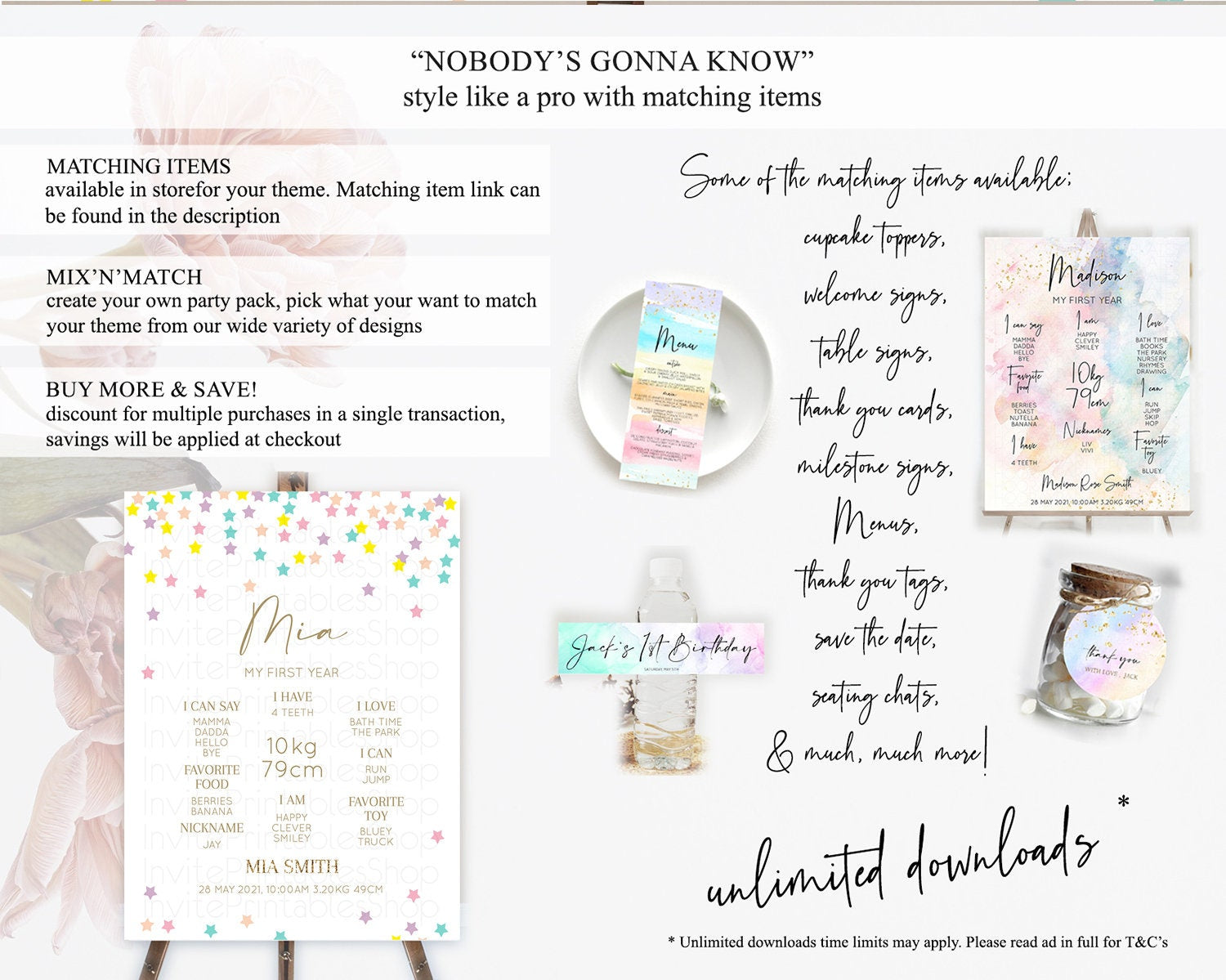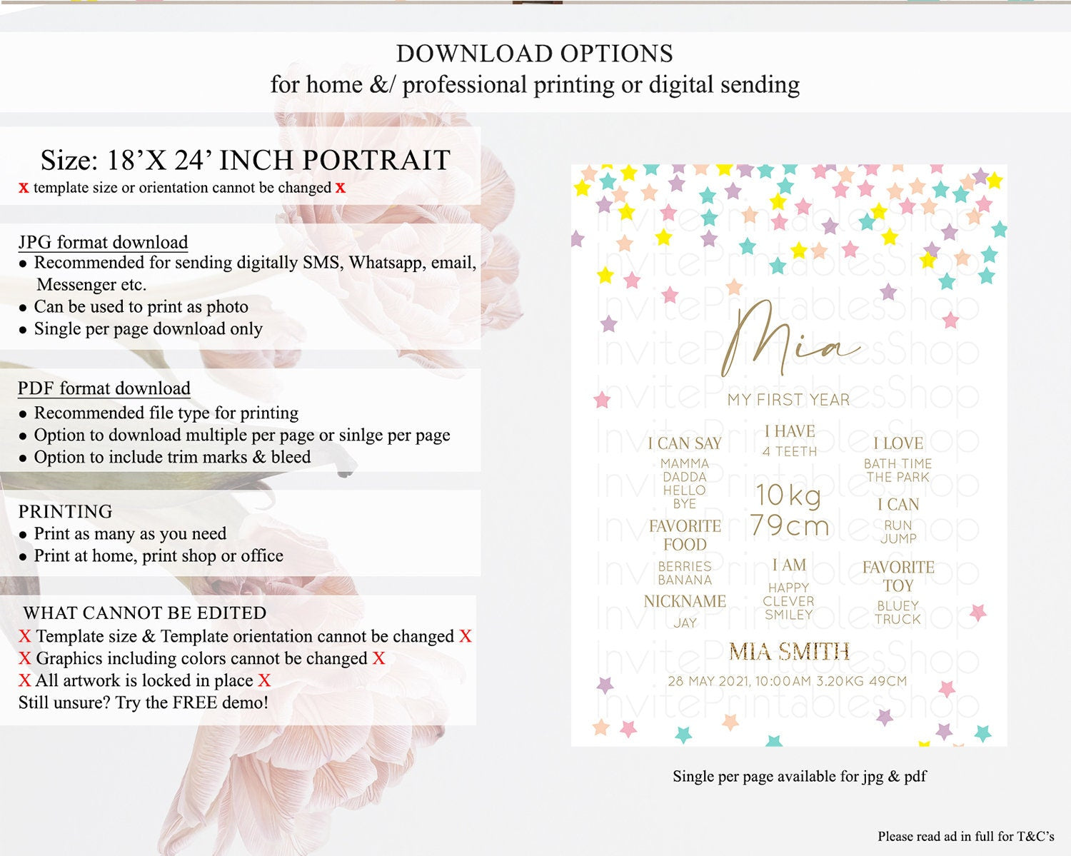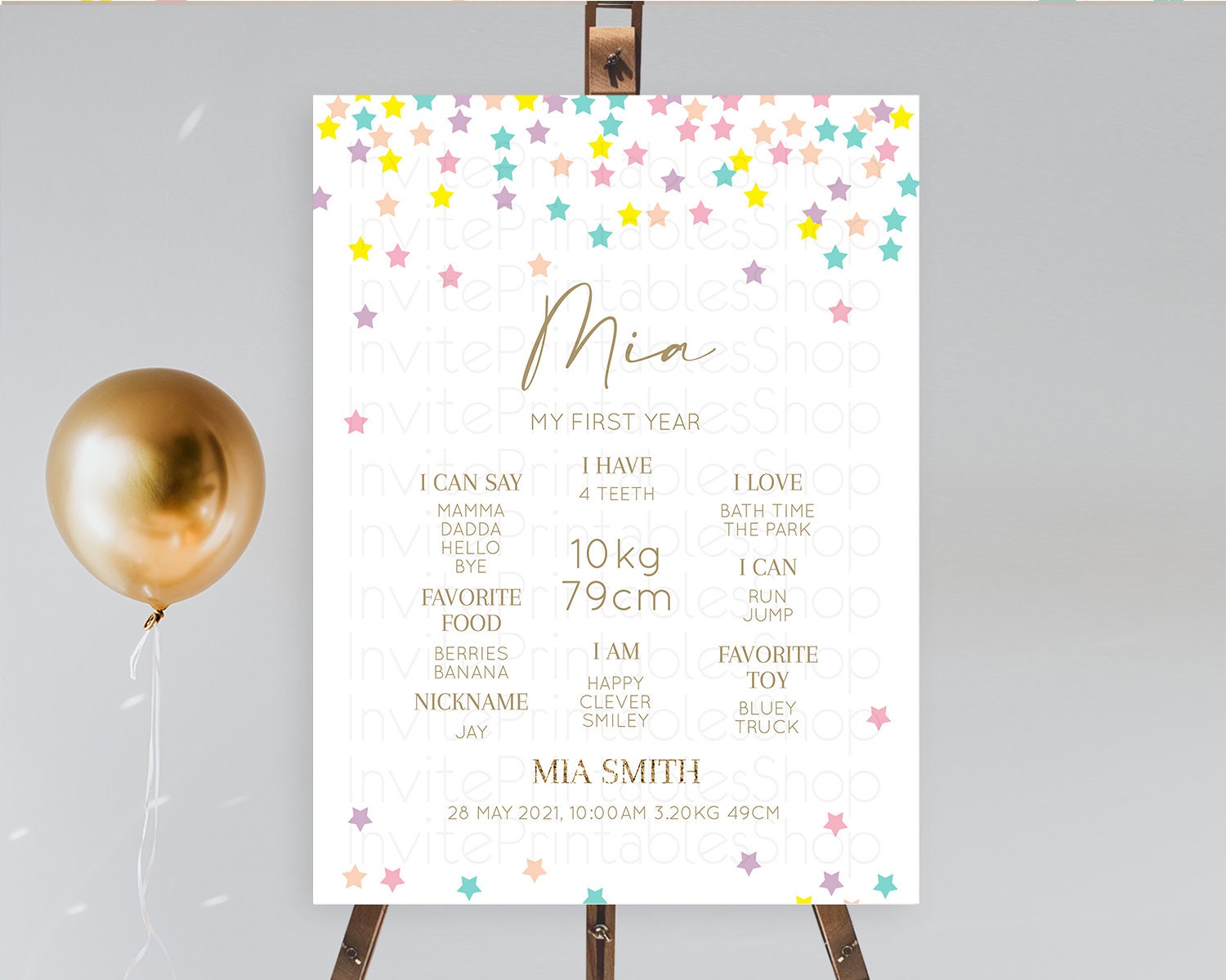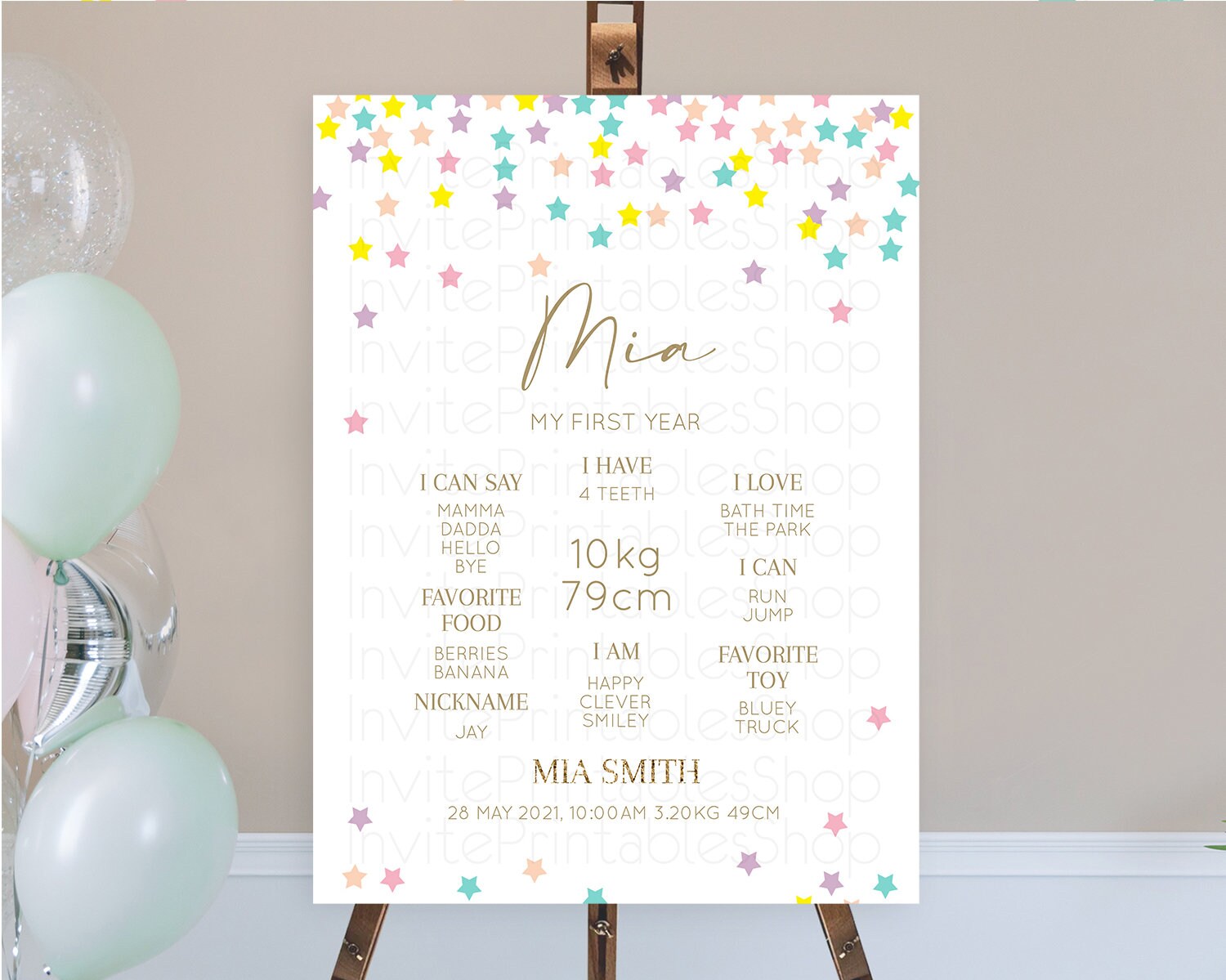 Star First Birthday Milestone Poster Pastel Stars Milestone Shooting Star Rainbow Colorful Confetti Twinkle Little Star 1st Birthday D10601