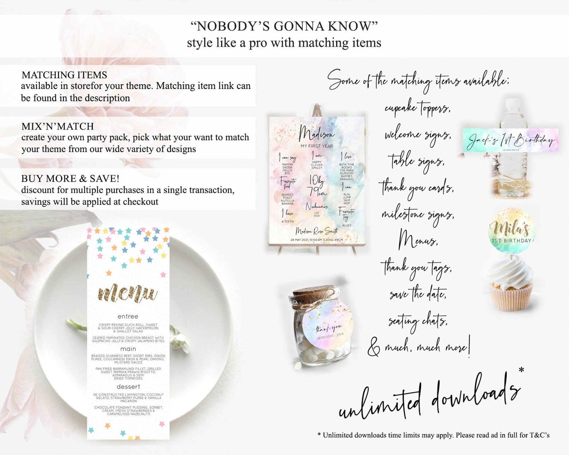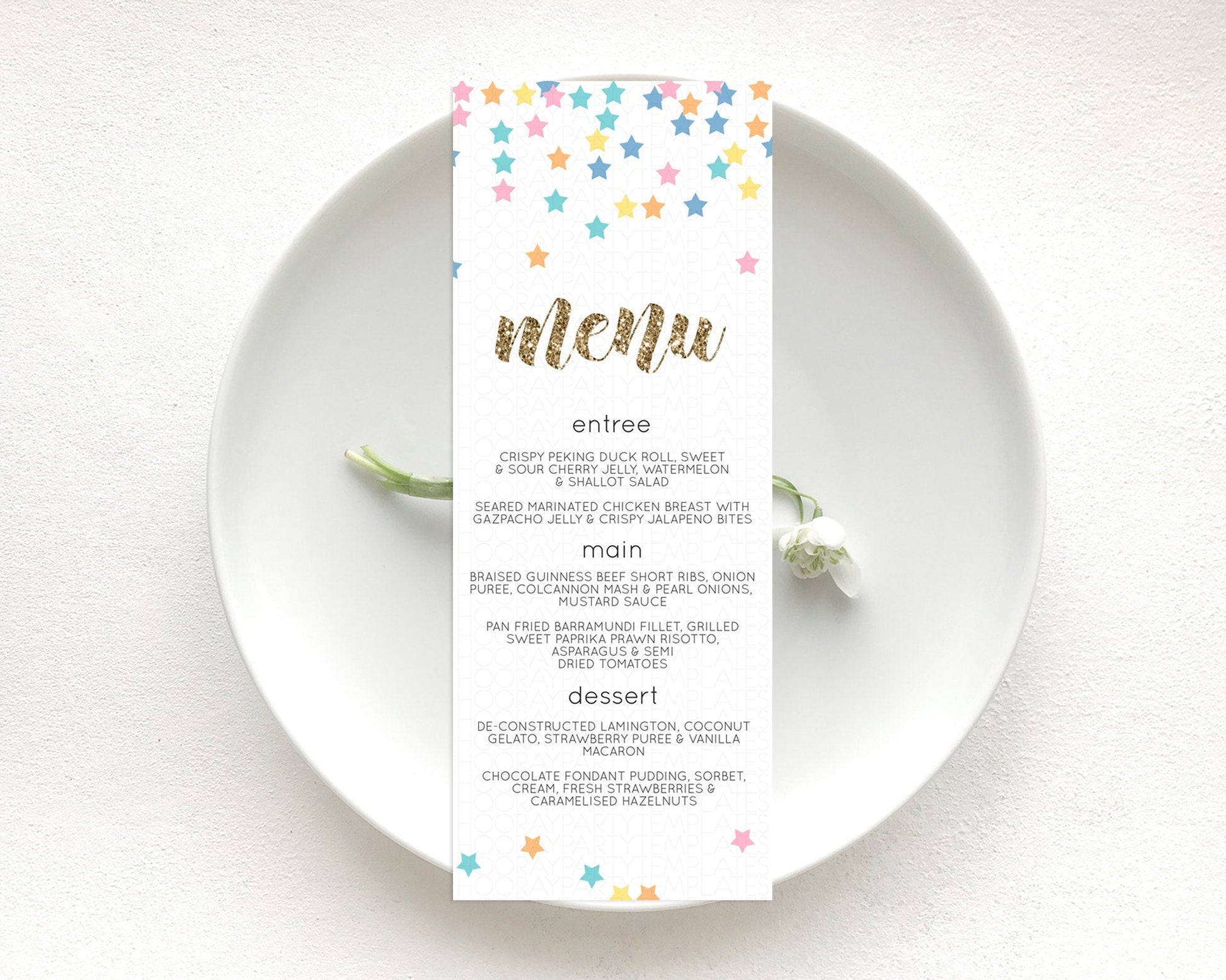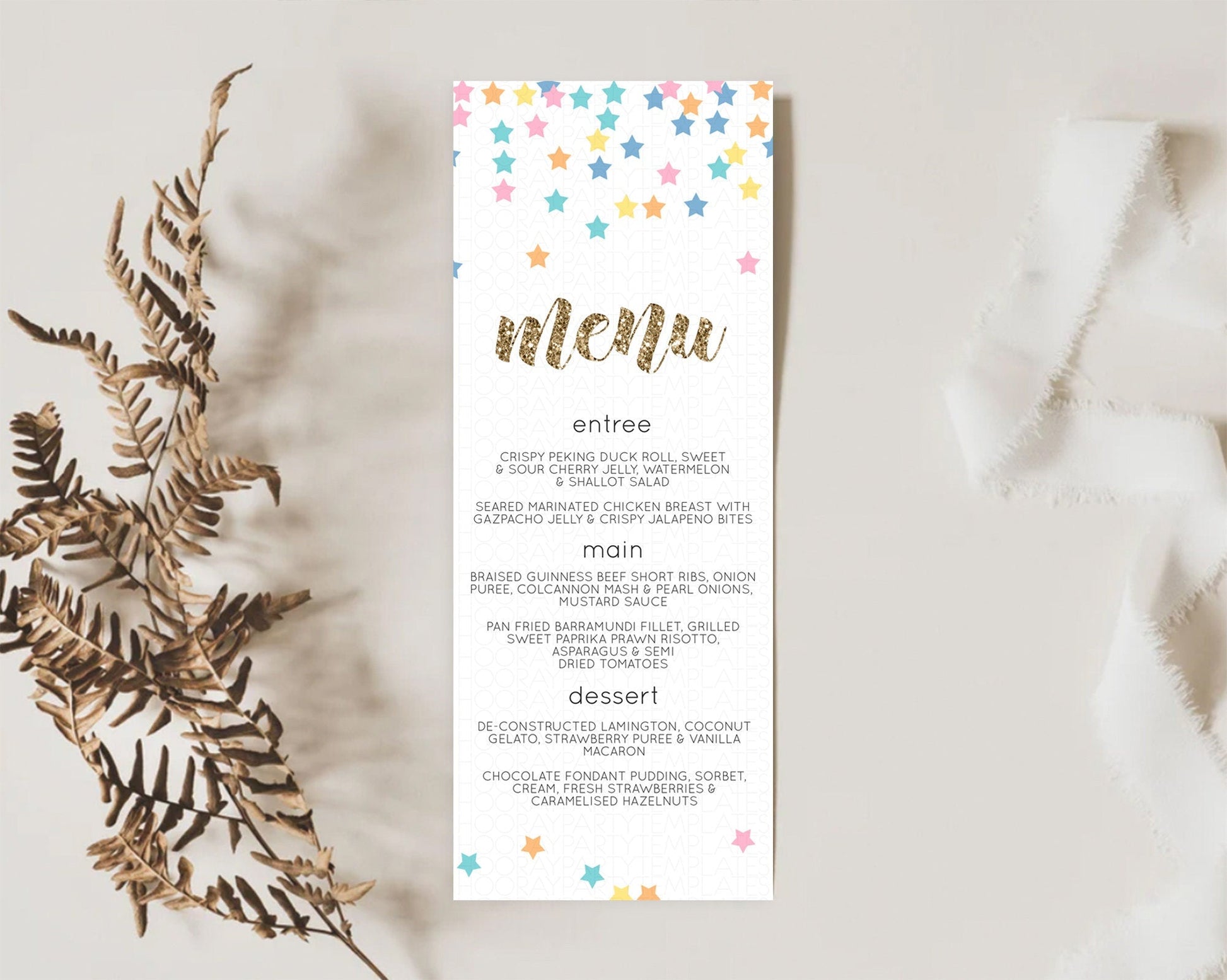 Star Menu Template Pastel Stars Menu Shooting Star Twinkle Little Star Decor Rainbow Colorful Confetti Dinner Dessert Food Menu D10298