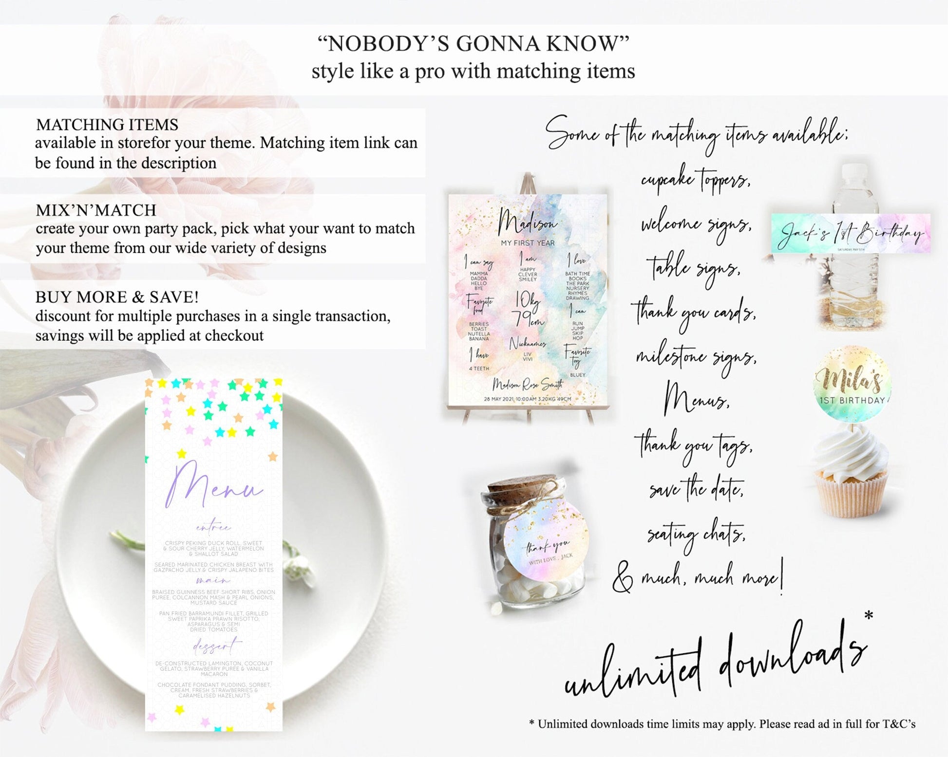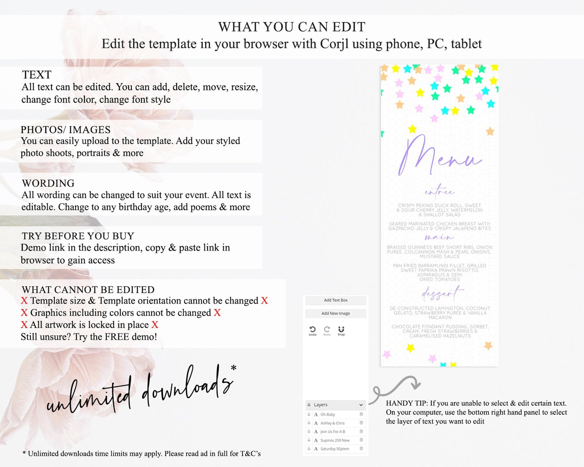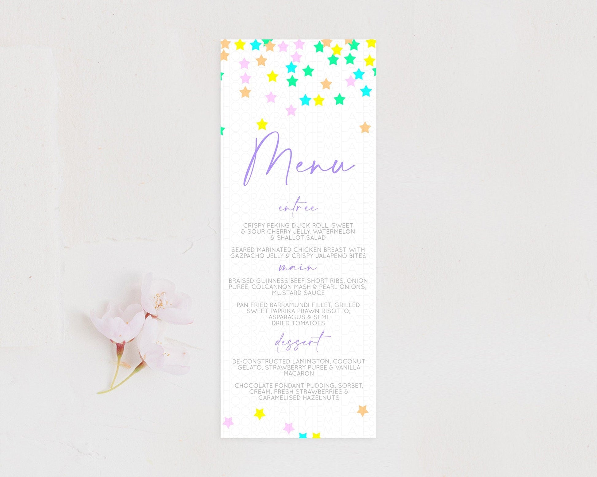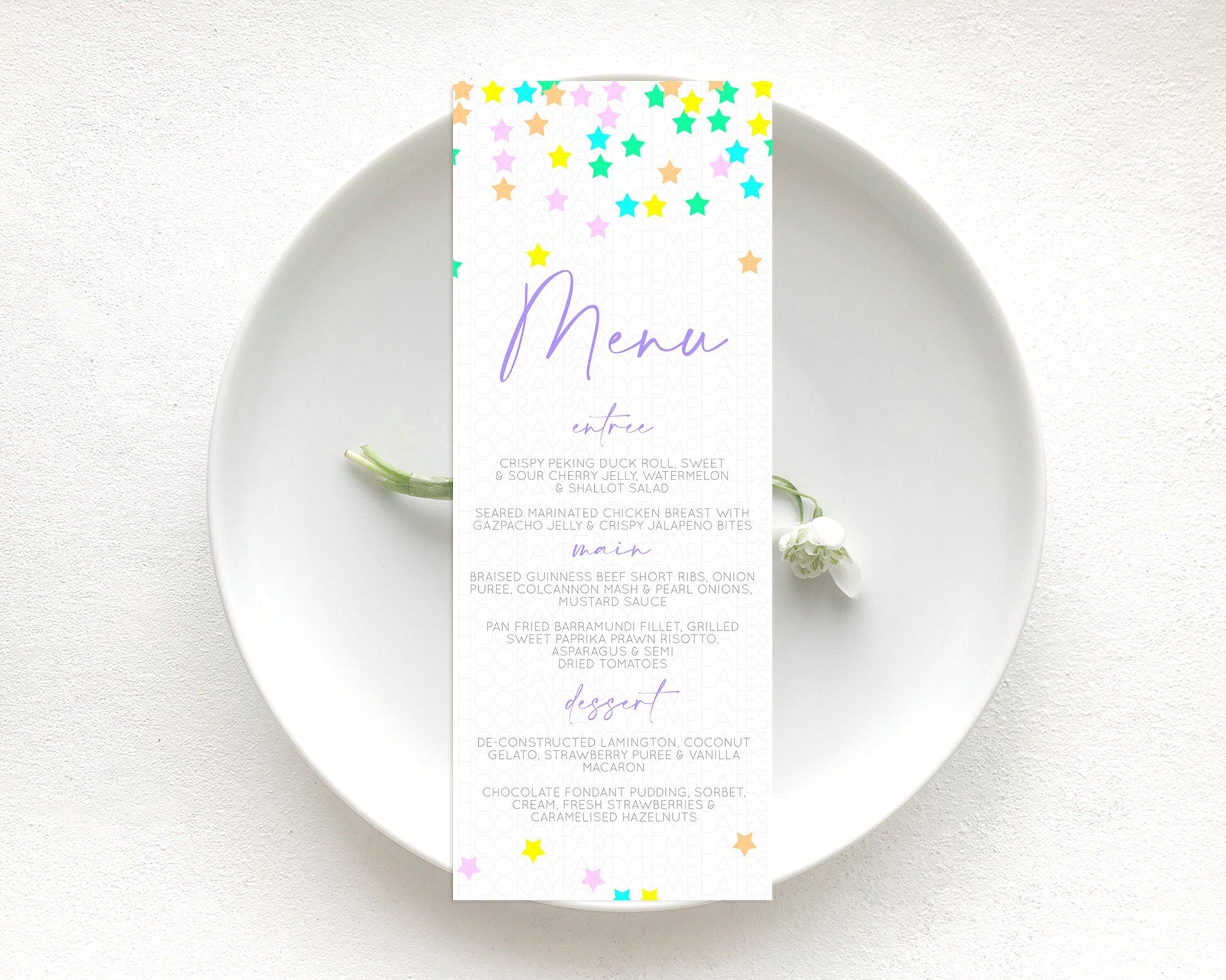 Star Menu Template Pastel Stars Menu Shooting Star Twinkle Little Star Decor Rainbow Colorful Confetti Dinner Dessert Food Menu D10395