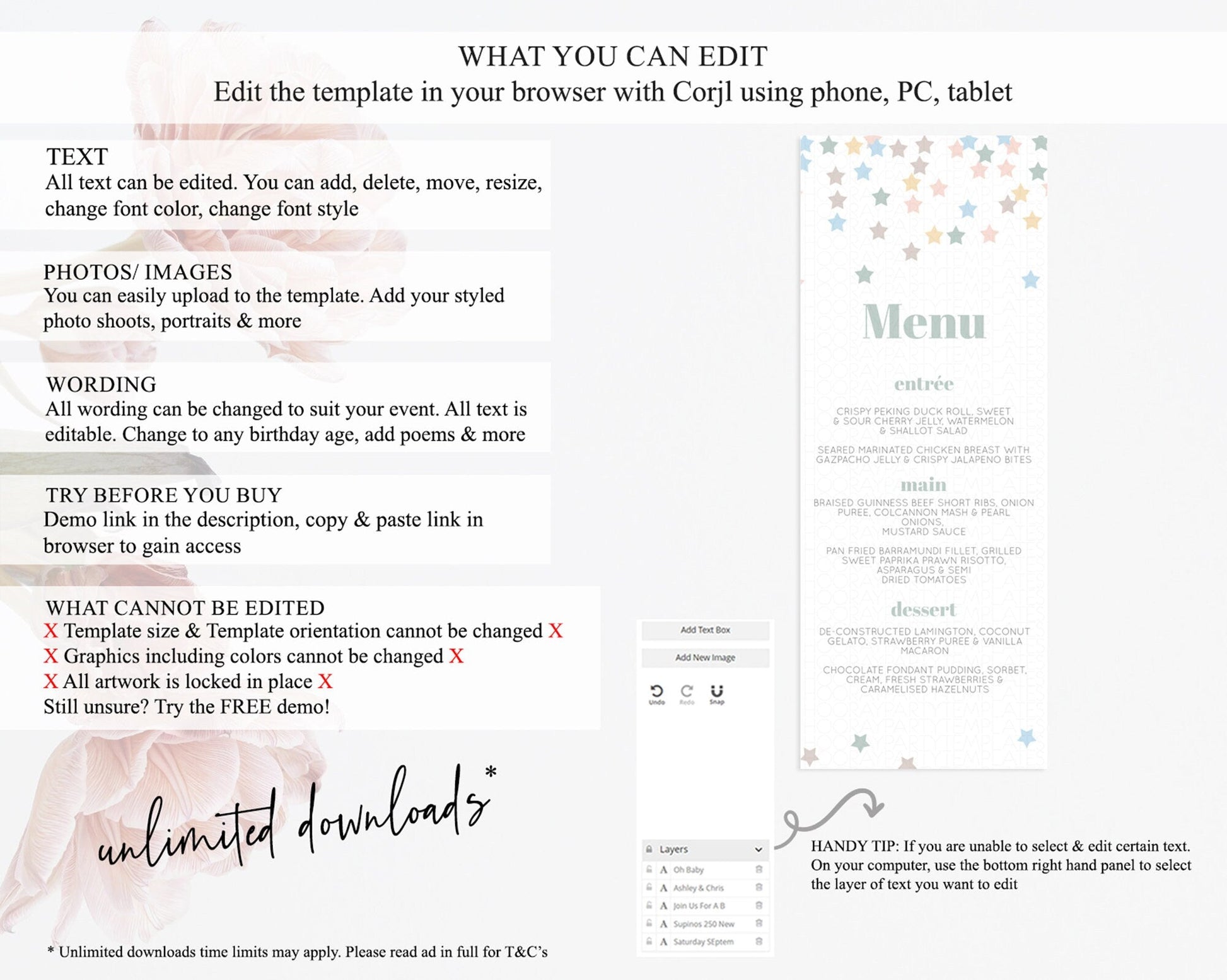 • Template size & orientation cannot be changed. Please use the demo link to confirm this product suits your needs.