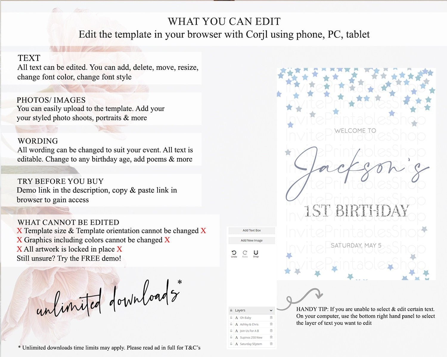 • After purchase, Corjl emails your editing link. Allow up to 15 minutes for delivery.