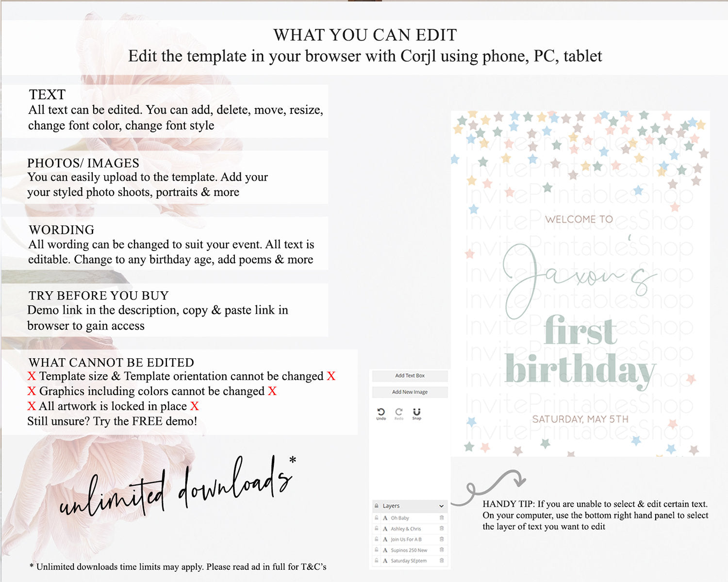 • After purchase, Corjl emails your editing link. Allow up to 15 minutes for delivery.