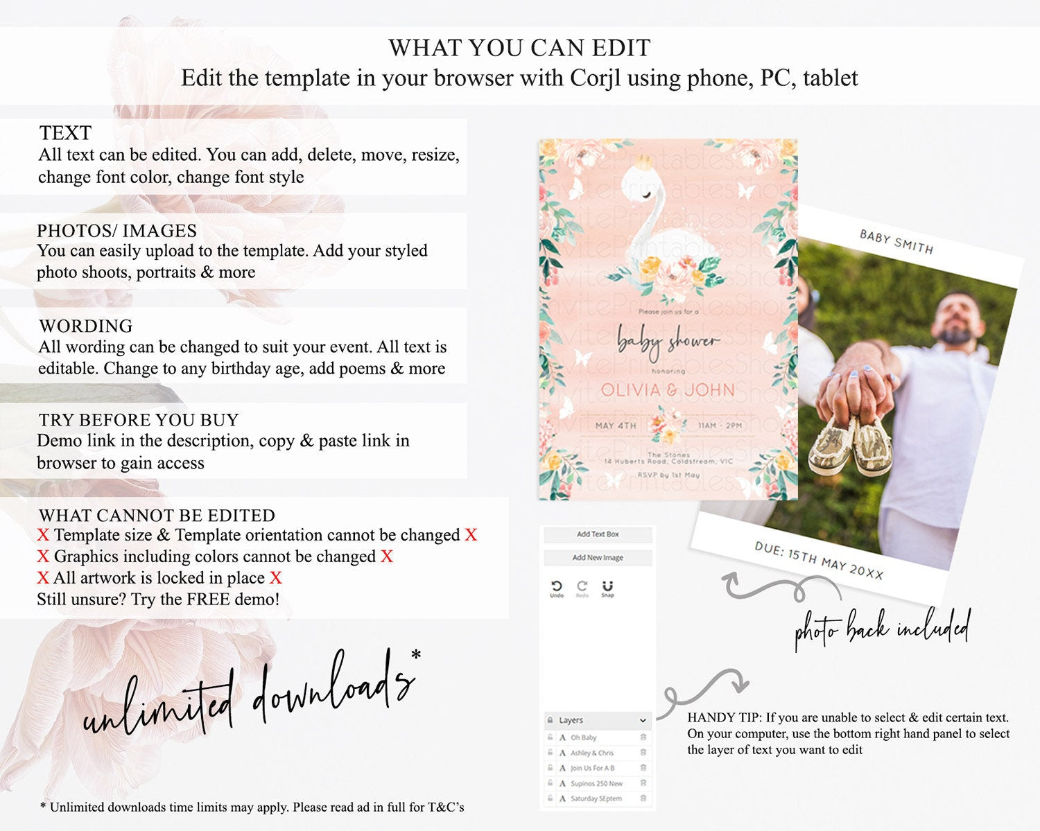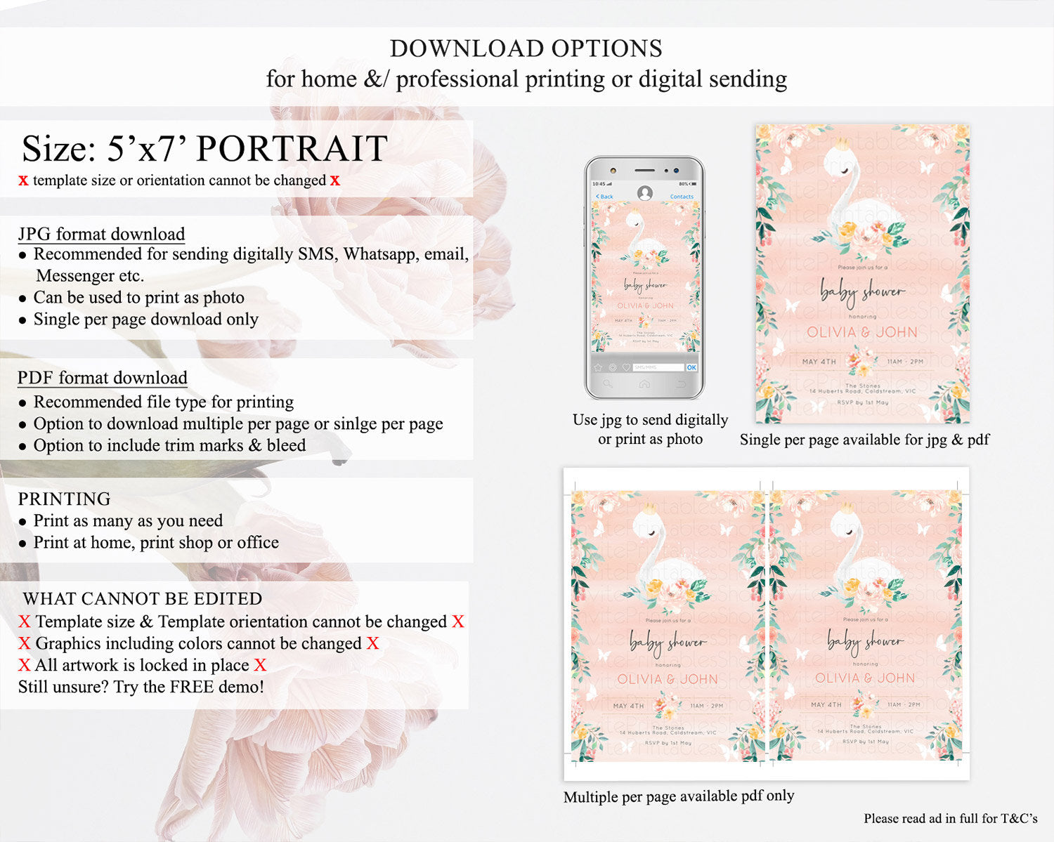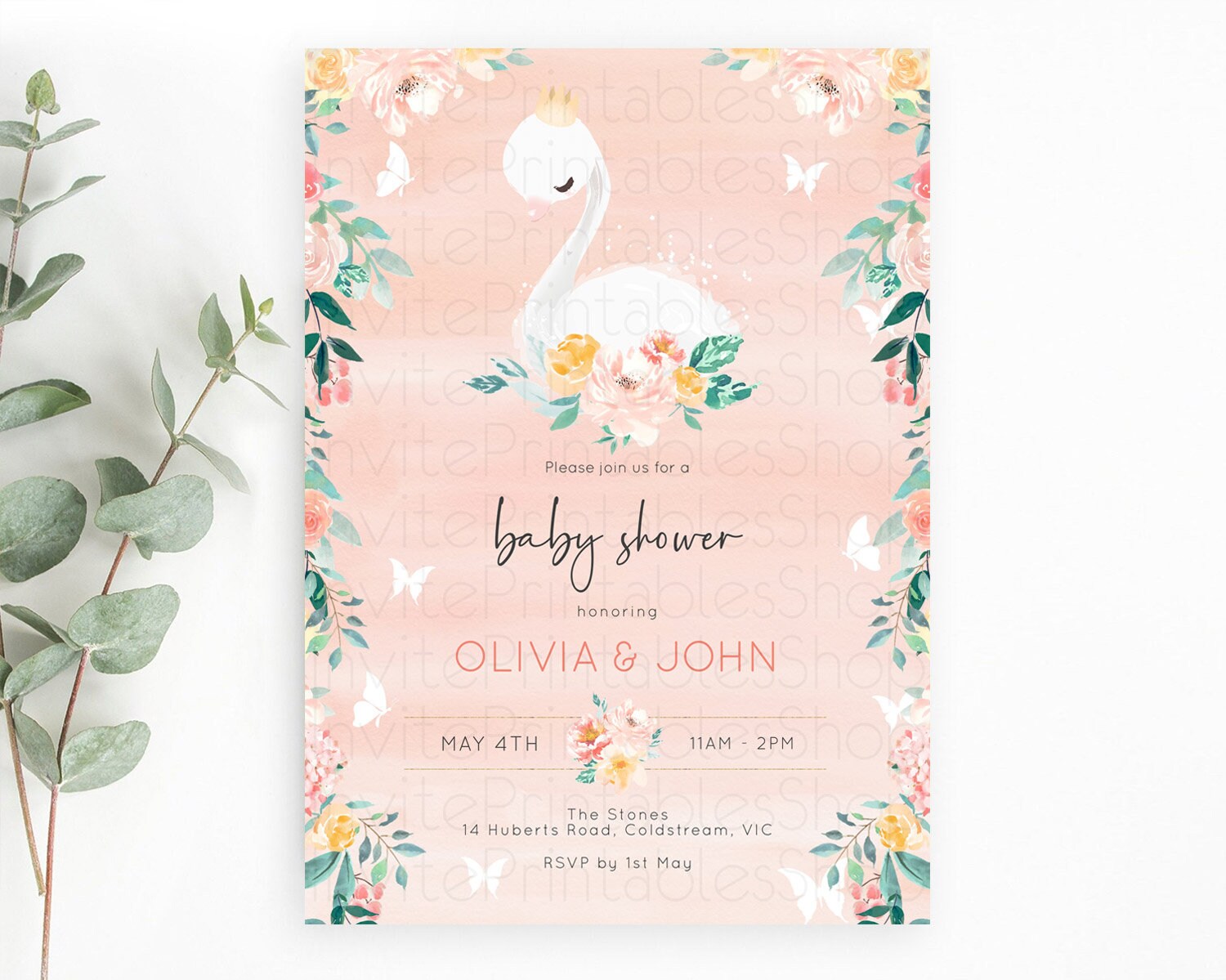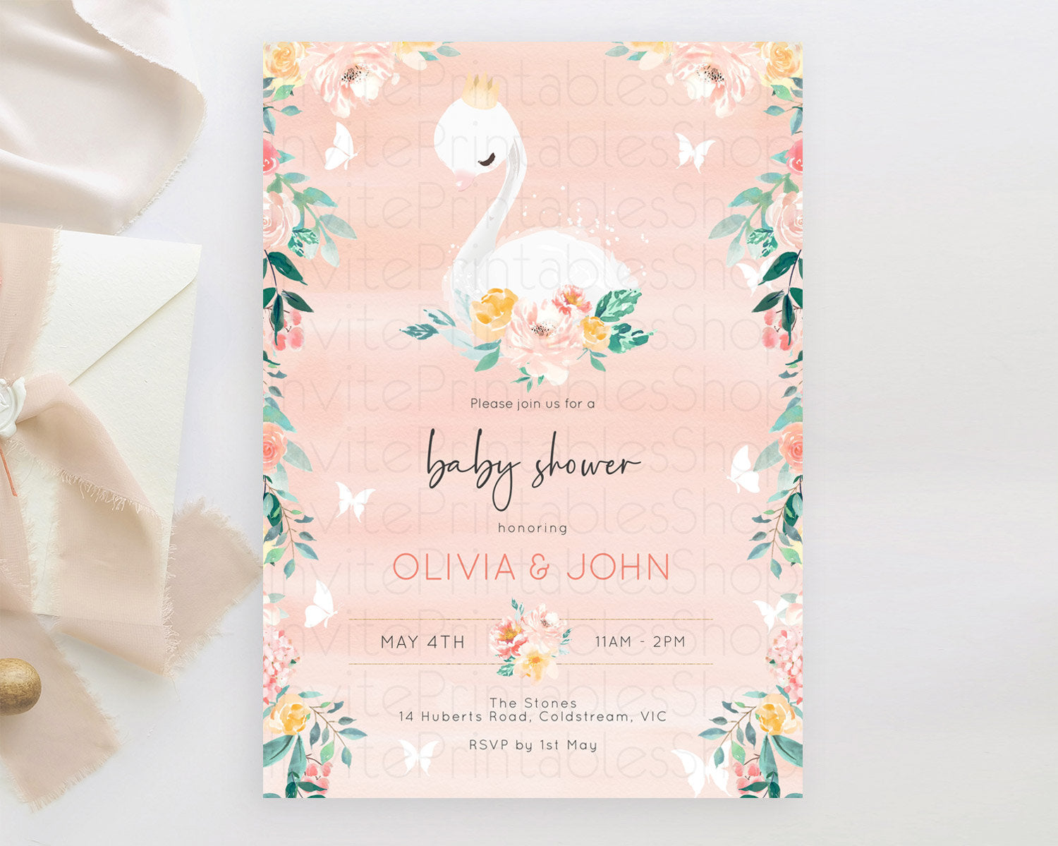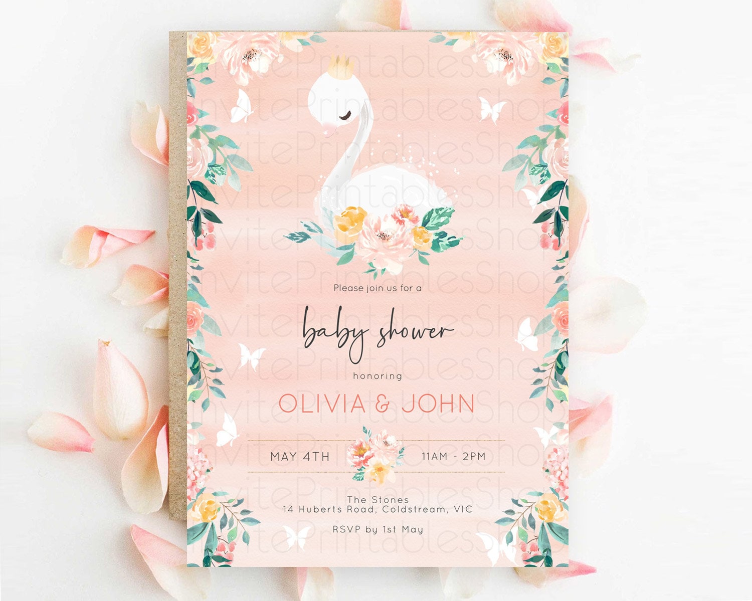 Swan Baby Shower Invitation, Swan Lake Princess Ballet, Secret Garden, Watercolor, Pastel Floral, Pink Orange Flowers, Butterflies D10884