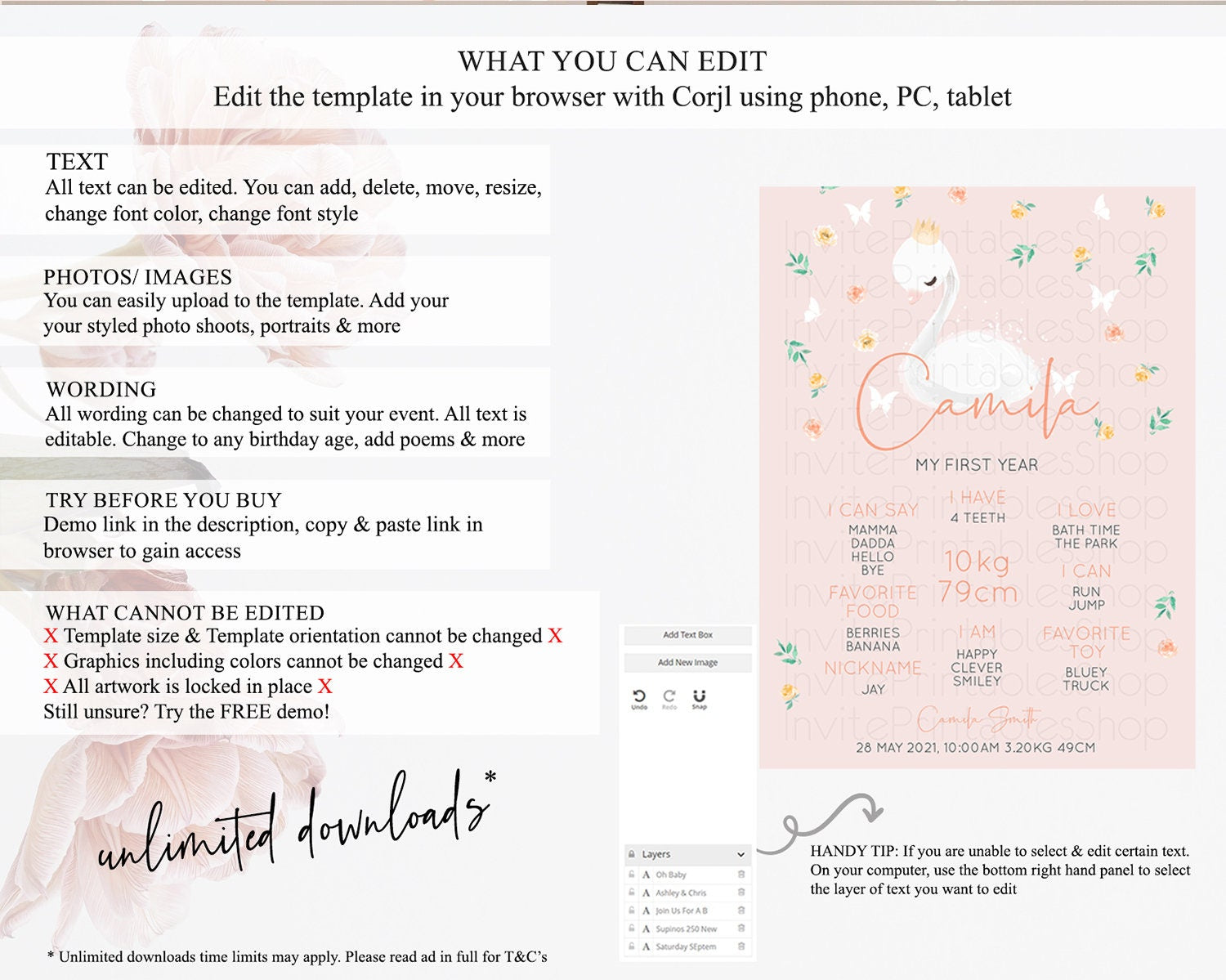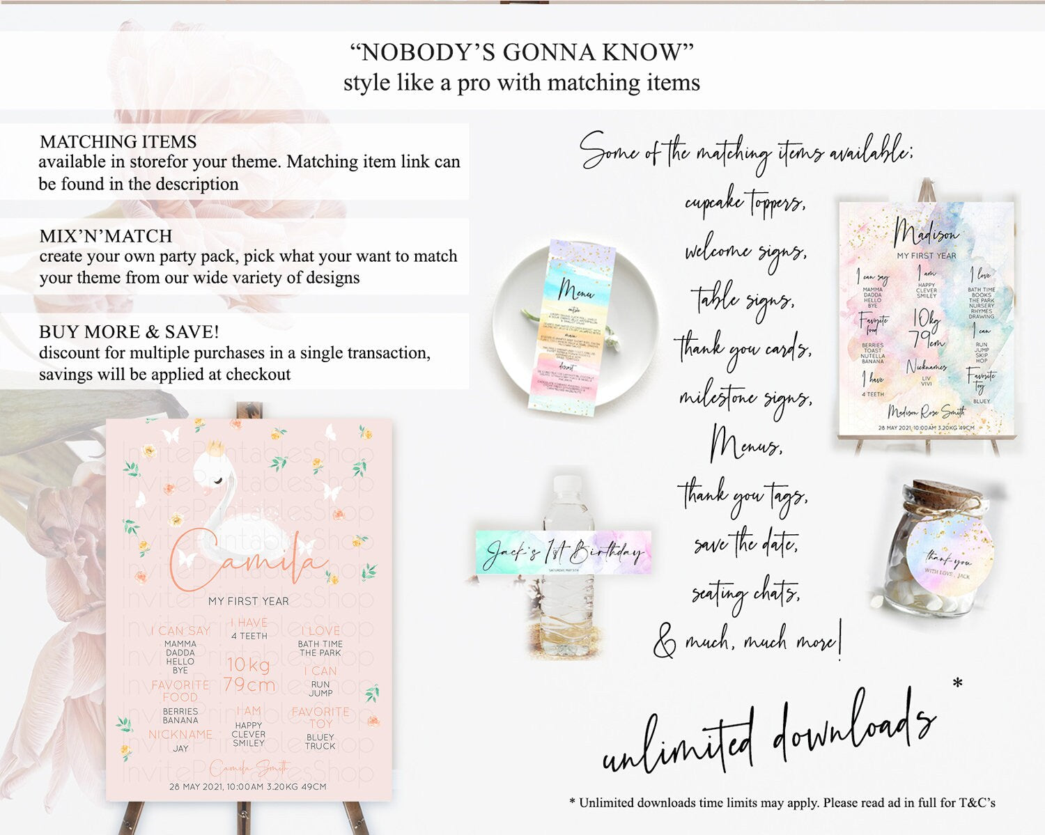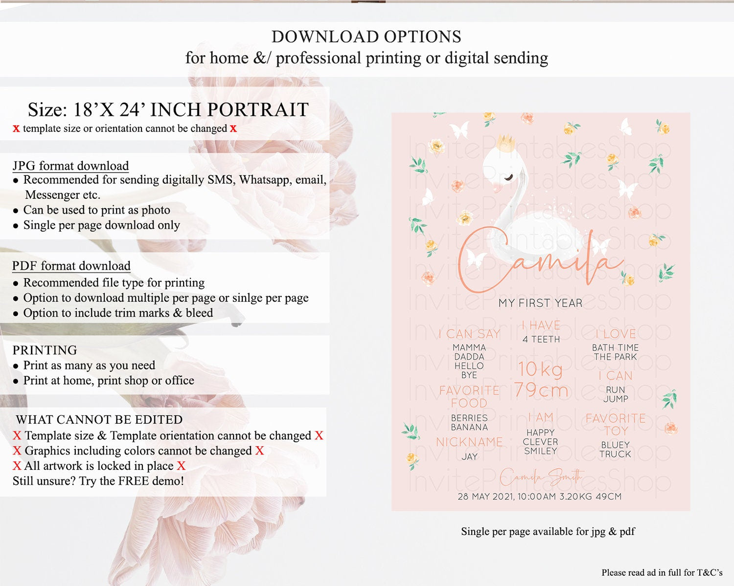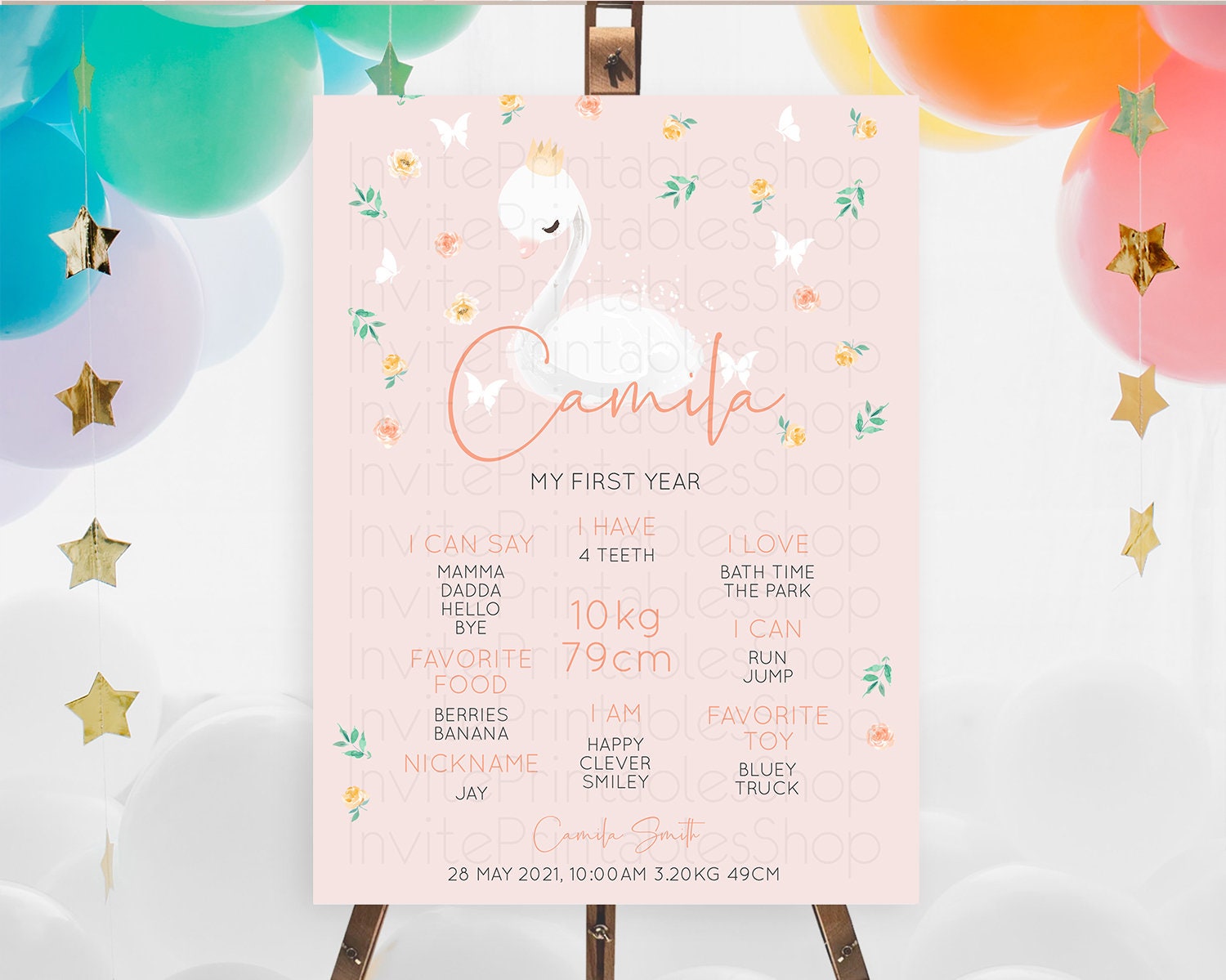 Swan First Birthday Milestone Poster Swan Princess Ballet Milestone Board Enchanted Forest Swan Lake Secret Garden Pastel Floral D10388