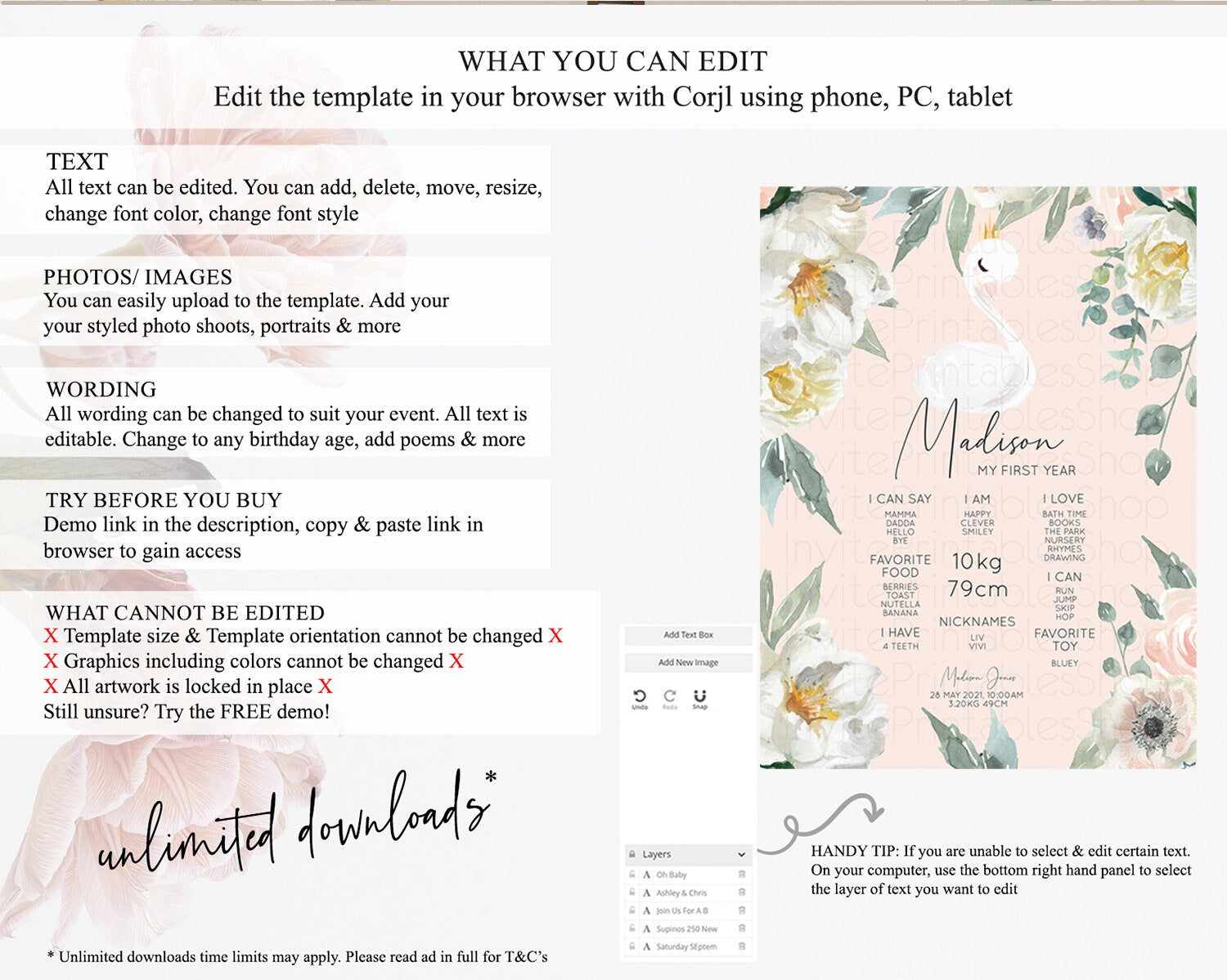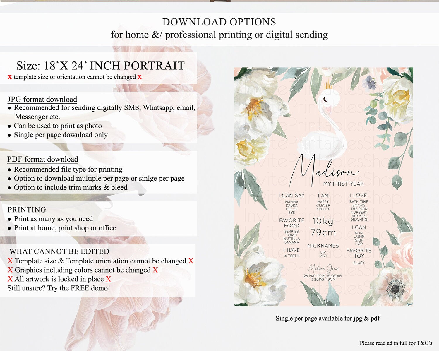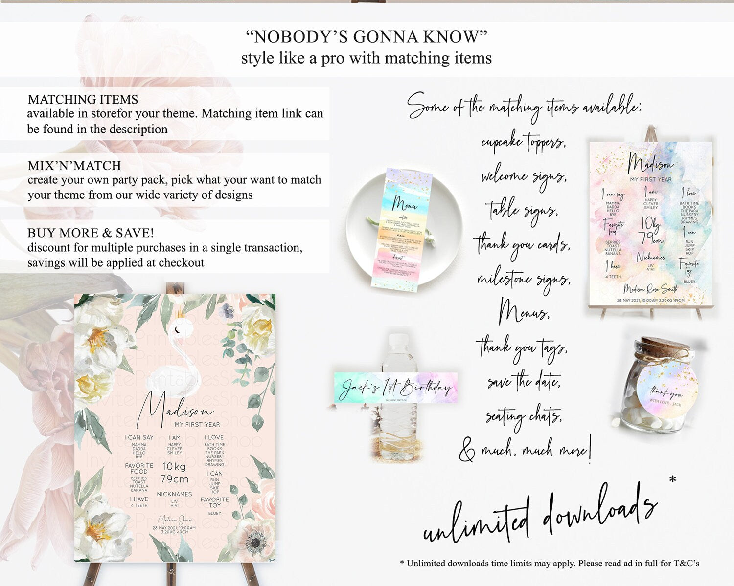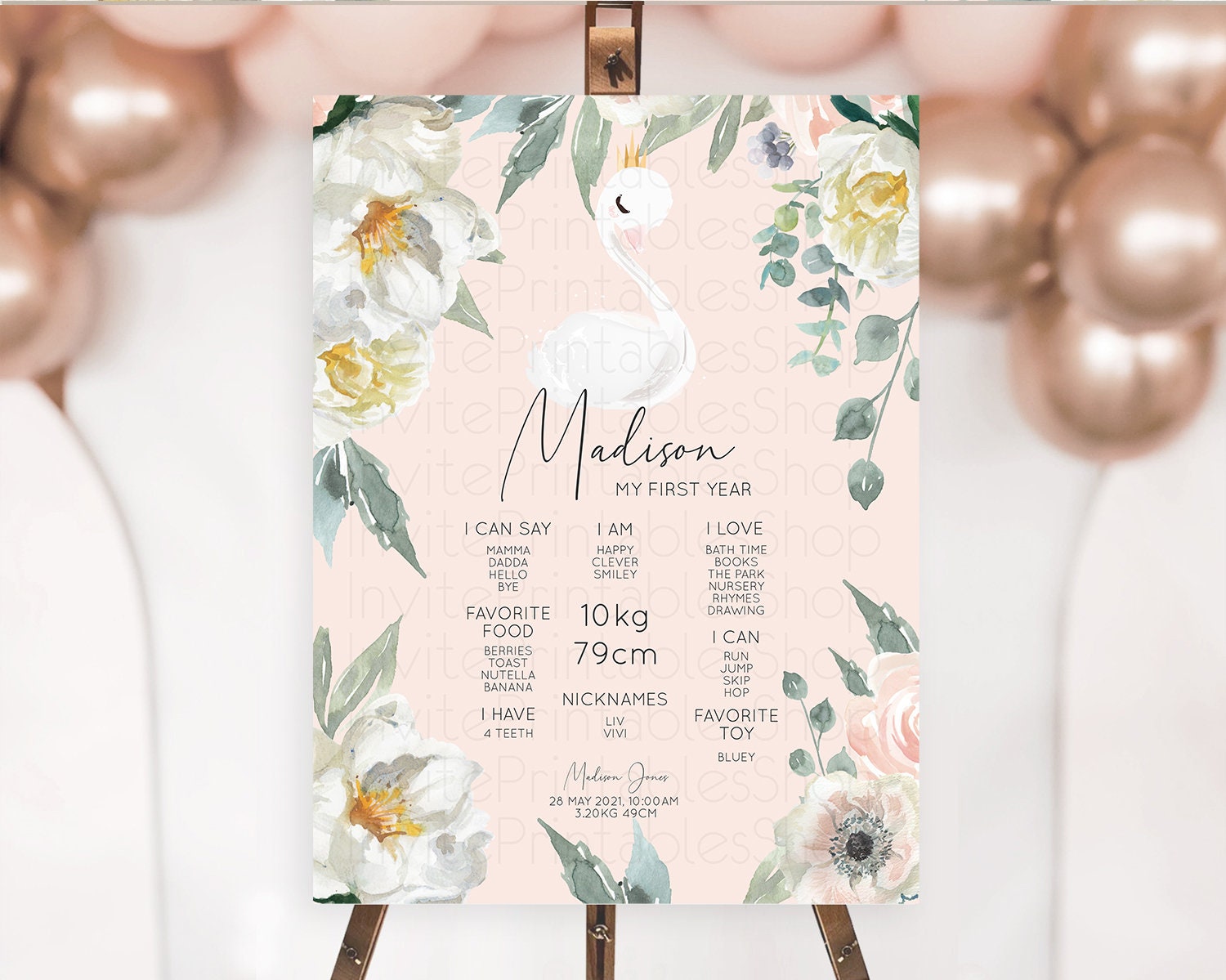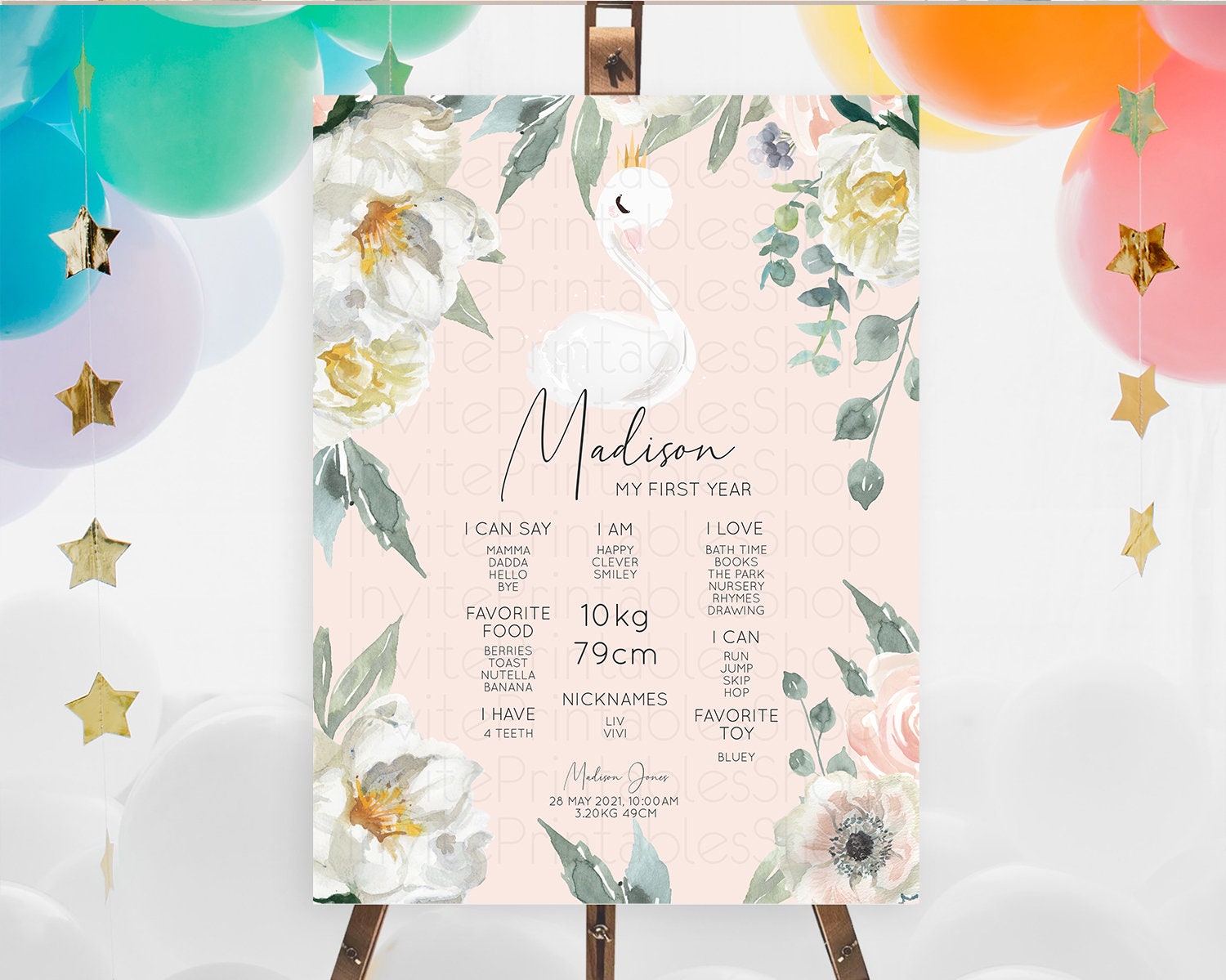 Swan First Birthday Milestone Poster Swan Princess Ballet Milestone Board Enchanted Forest Swan Lake Secret Garden Pastel Floral D10755