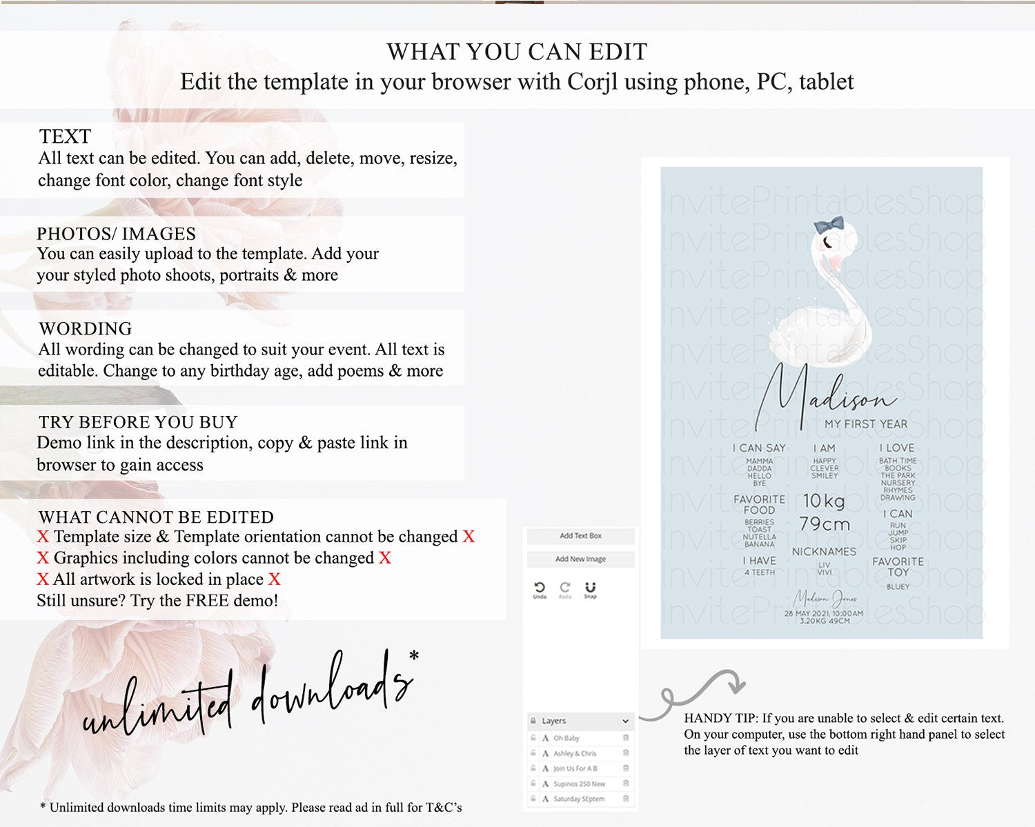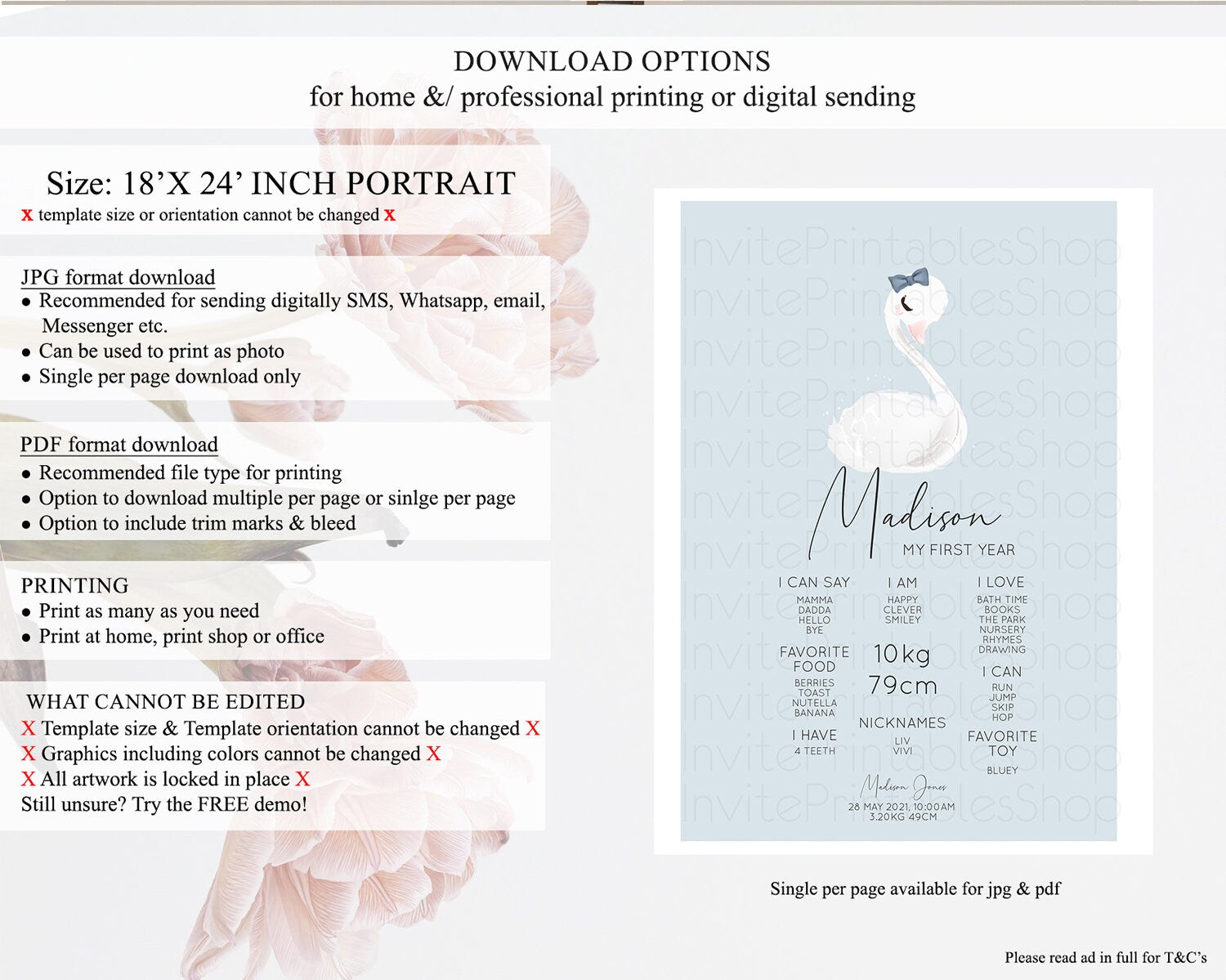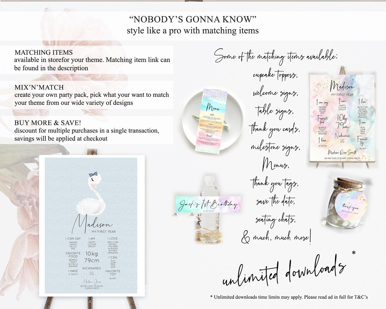 Swan First Birthday Milestone Poster Swan Princess Ballet Milestone Board Enchanted Forest Swan Lake Secret Garden Pastel Floral D10760