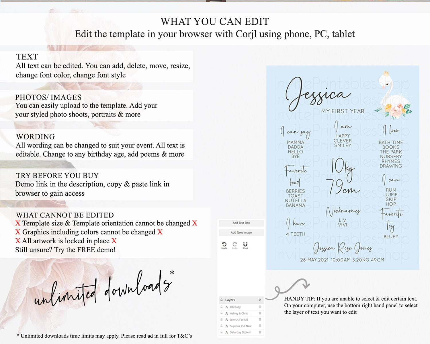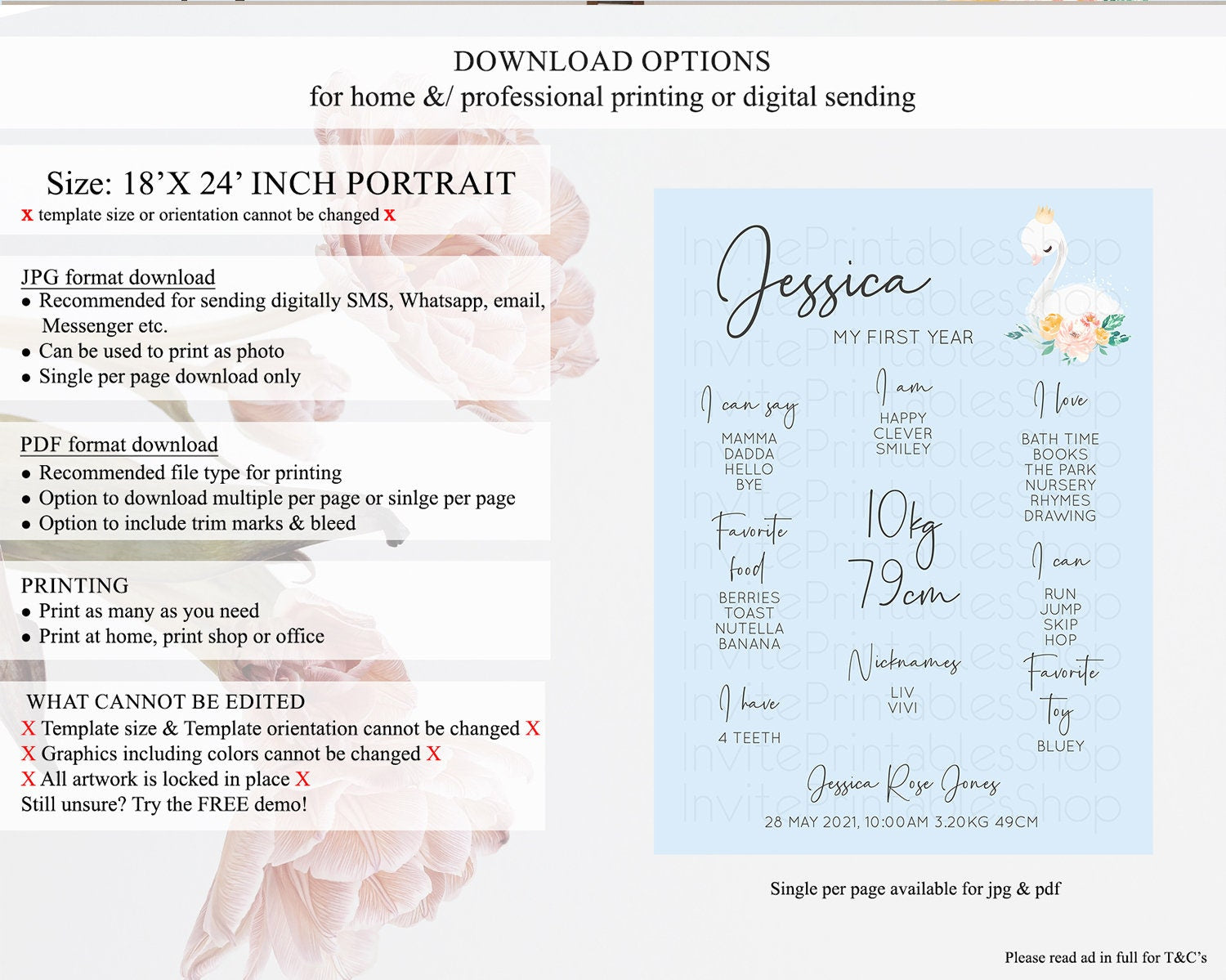 Swan First Birthday Milestone Poster Swan Princess Ballet Milestone Board Enchanted Forest Swan Lake Secret Garden Pastel Floral D10903