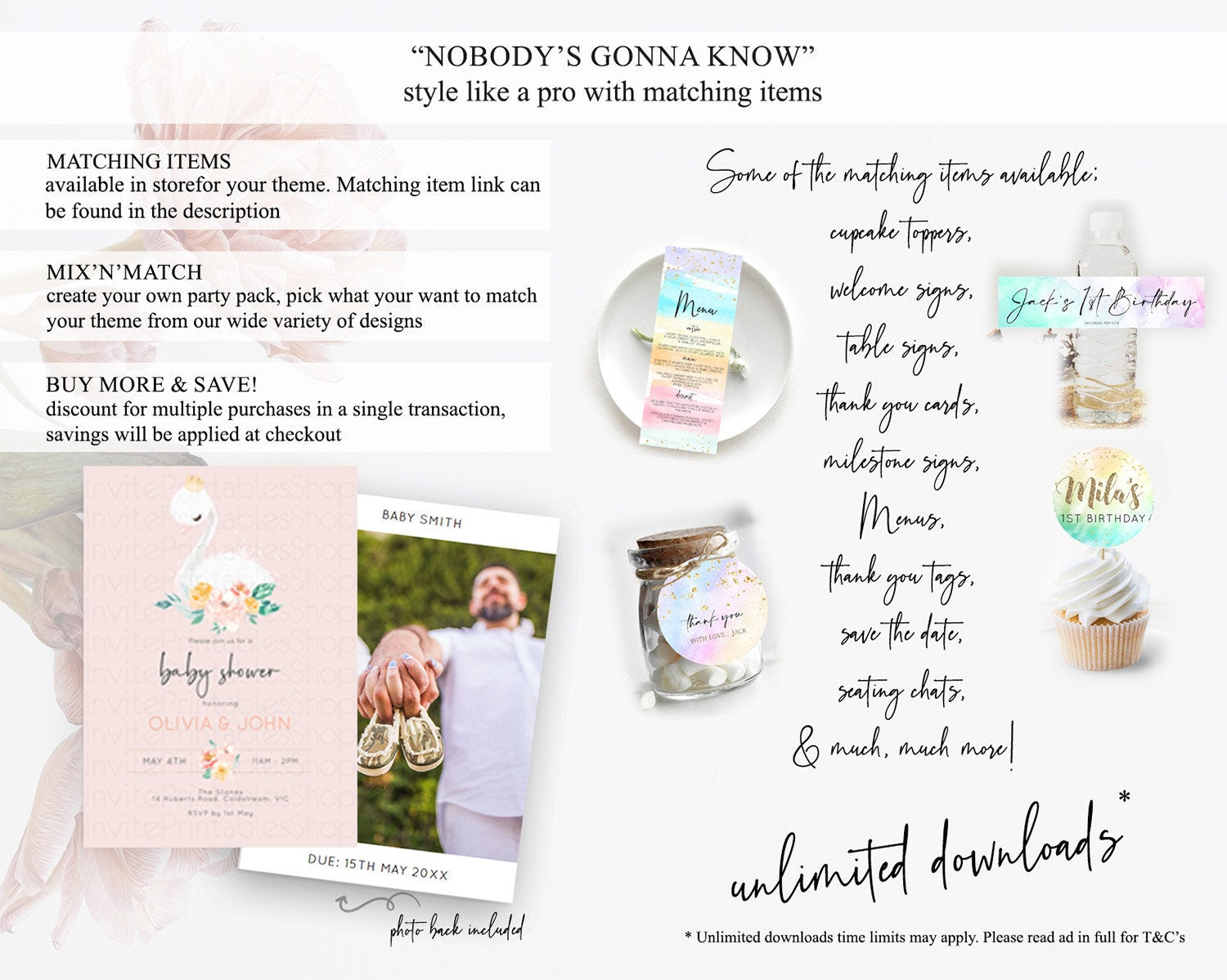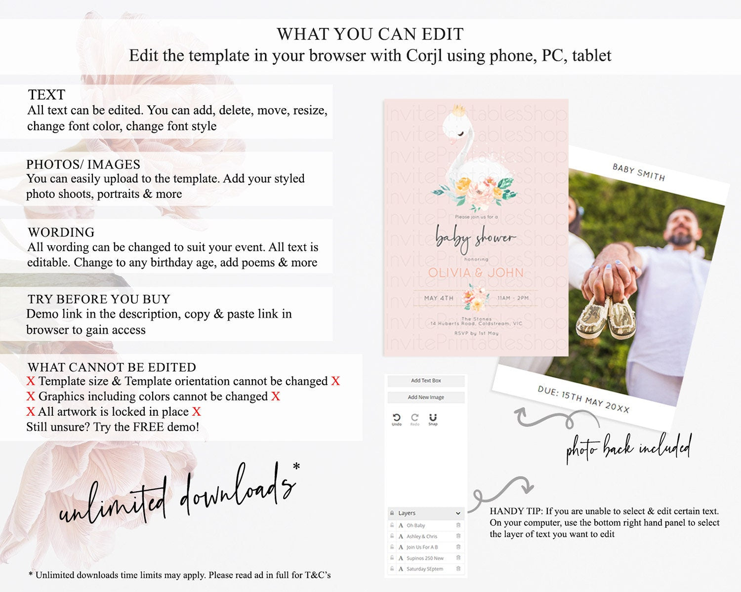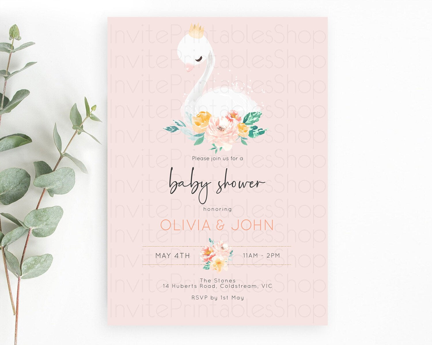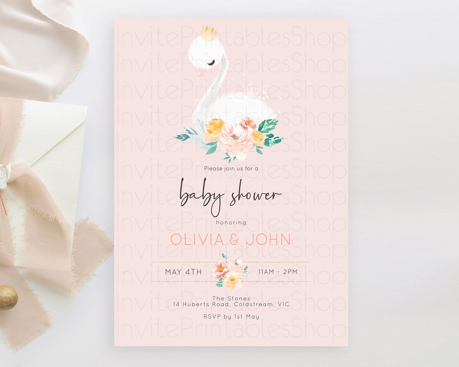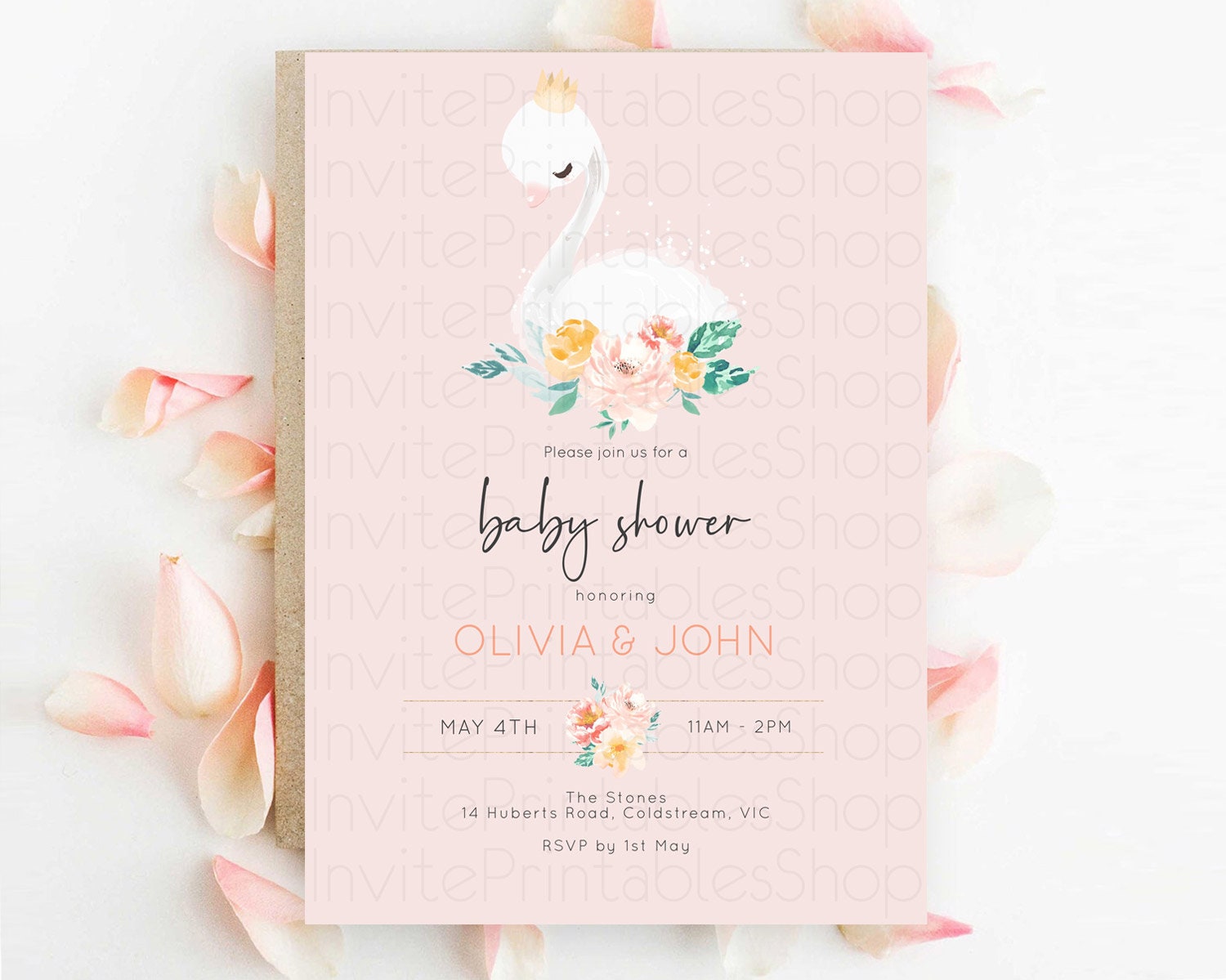 Swan Lake Baby Shower Invitation: Secret Garden, Swan Princess Ballet, Watercolor Pastel Floral, Butterfly Accents, Soft Pink, Green D10388