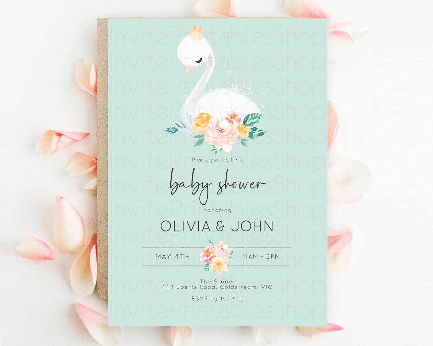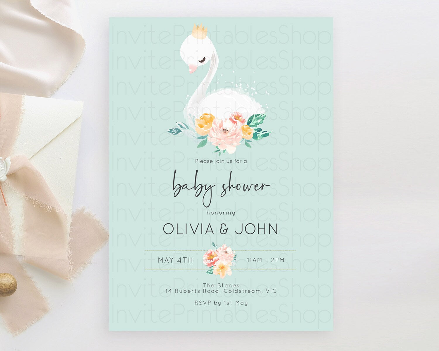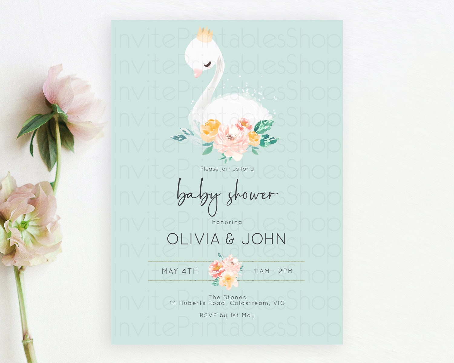 Swan Lake Baby Shower Invitation, Secret Garden, White Swan Princess Ballet, Watercolor Pink Green Floral, Butterflies, Soft Green D10905