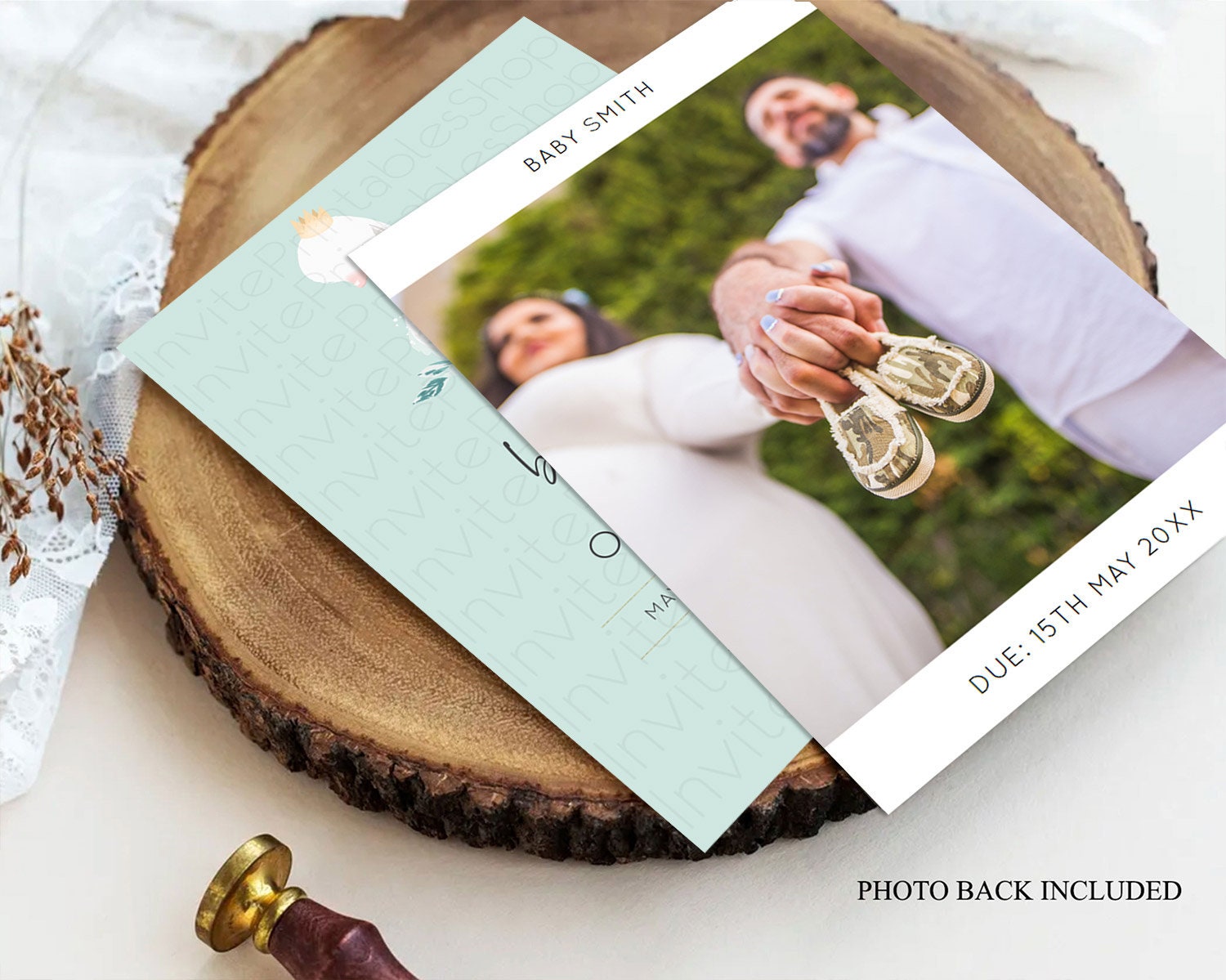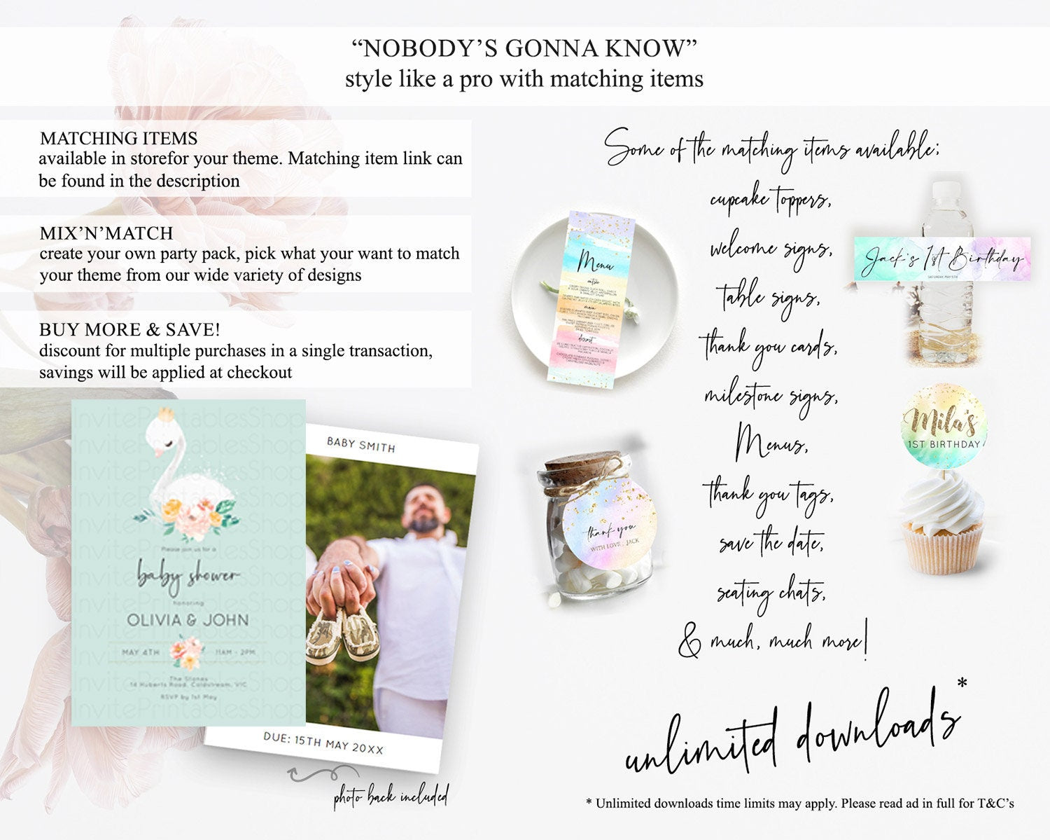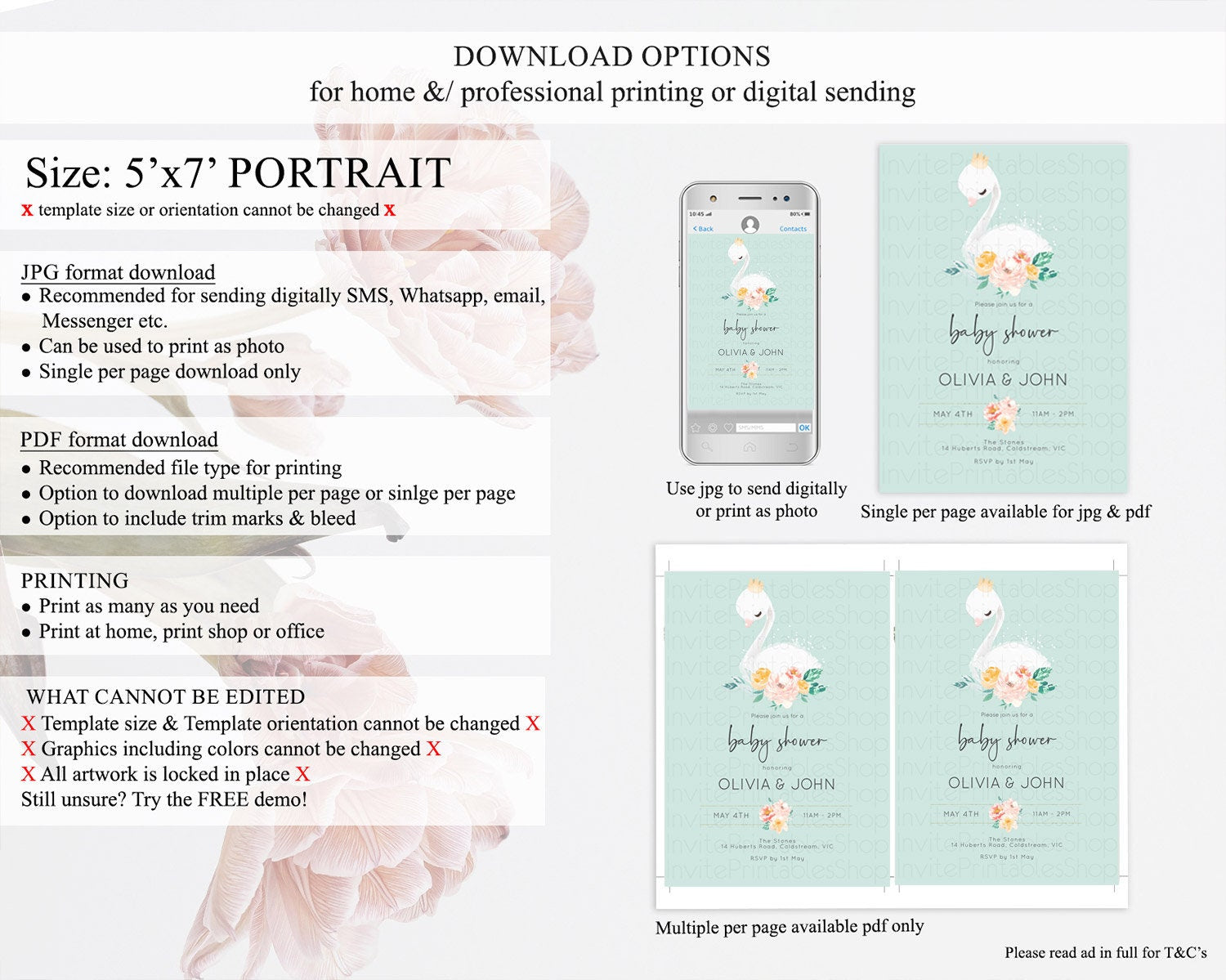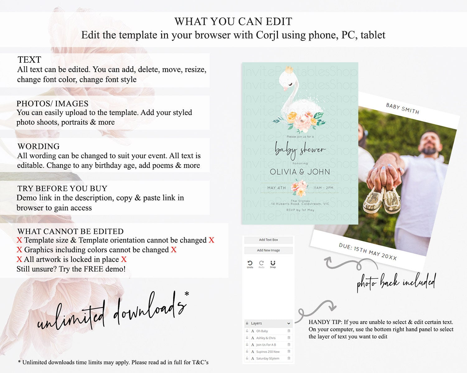 Swan Lake Baby Shower Invitation, Secret Garden, White Swan Princess Ballet, Watercolor Pink Green Floral, Butterflies, Soft Green D10905