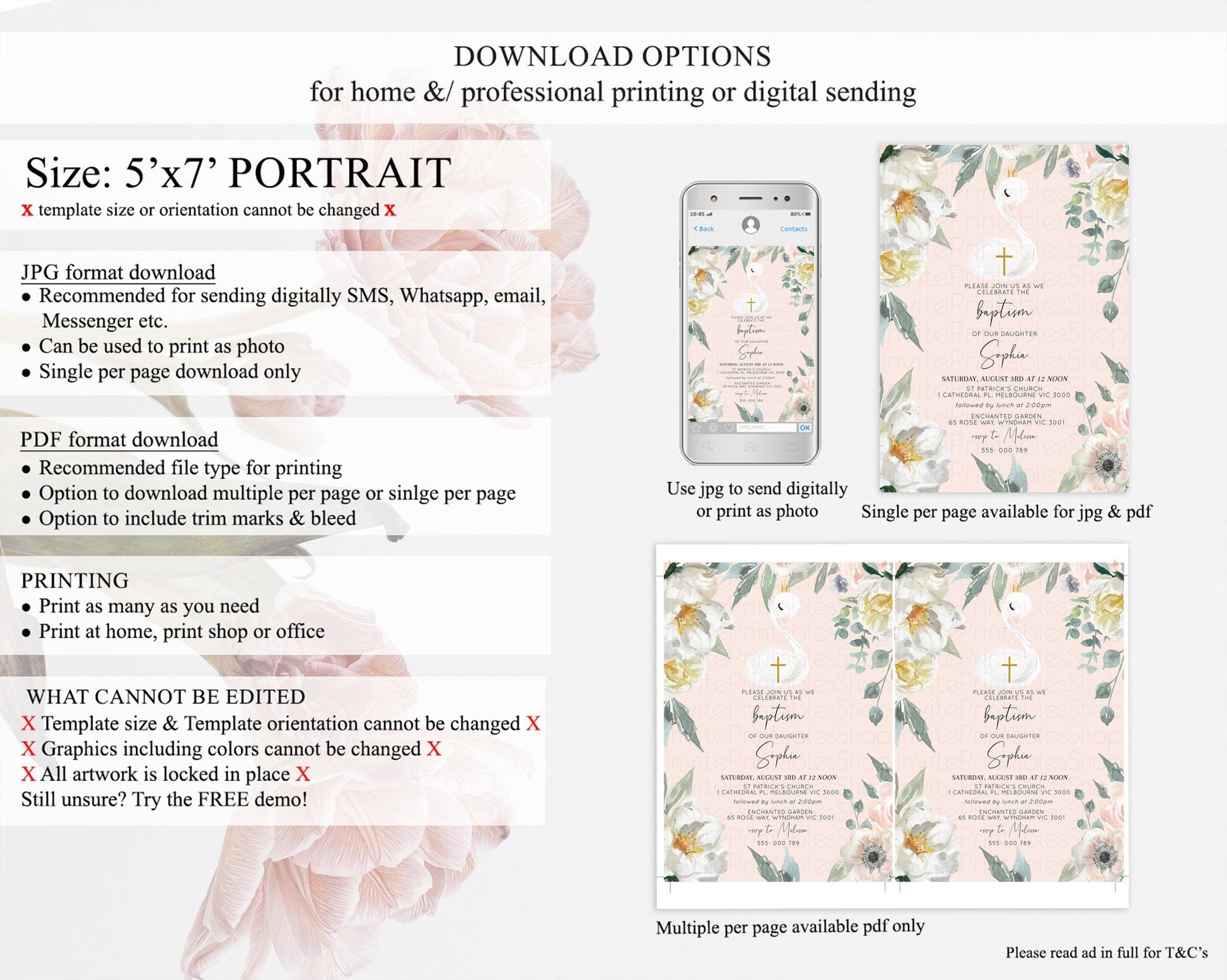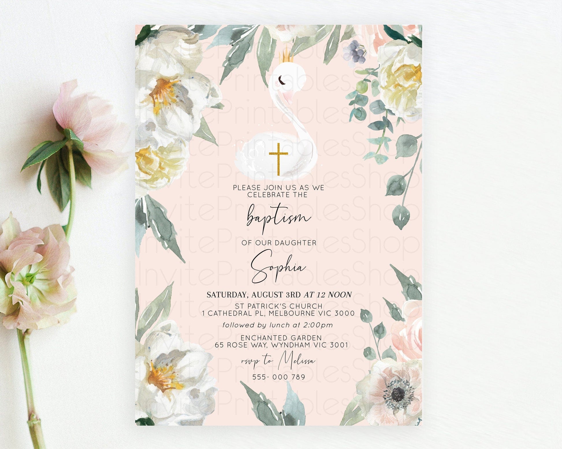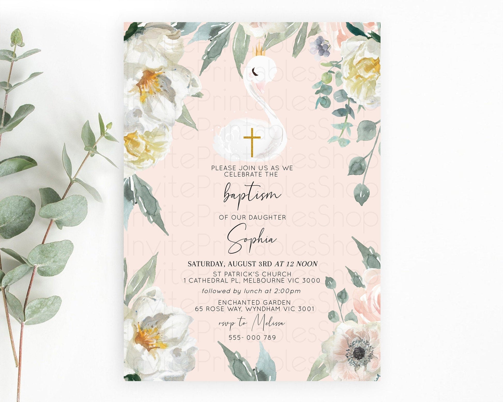 Swan Lake Baptism Invitation Swan Princess Ballet Baptism 1st Birthday Enchanted Forest Secret Garden Watercolour Pastel Floral D10755
