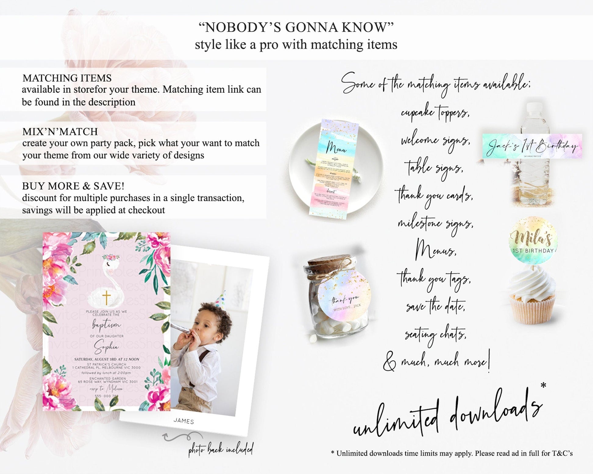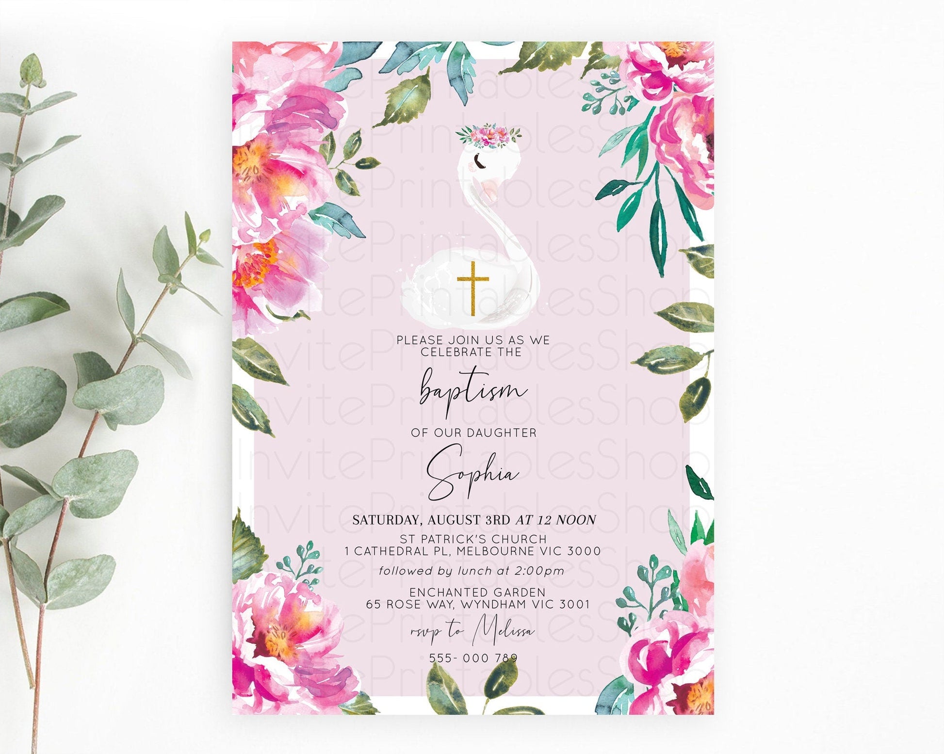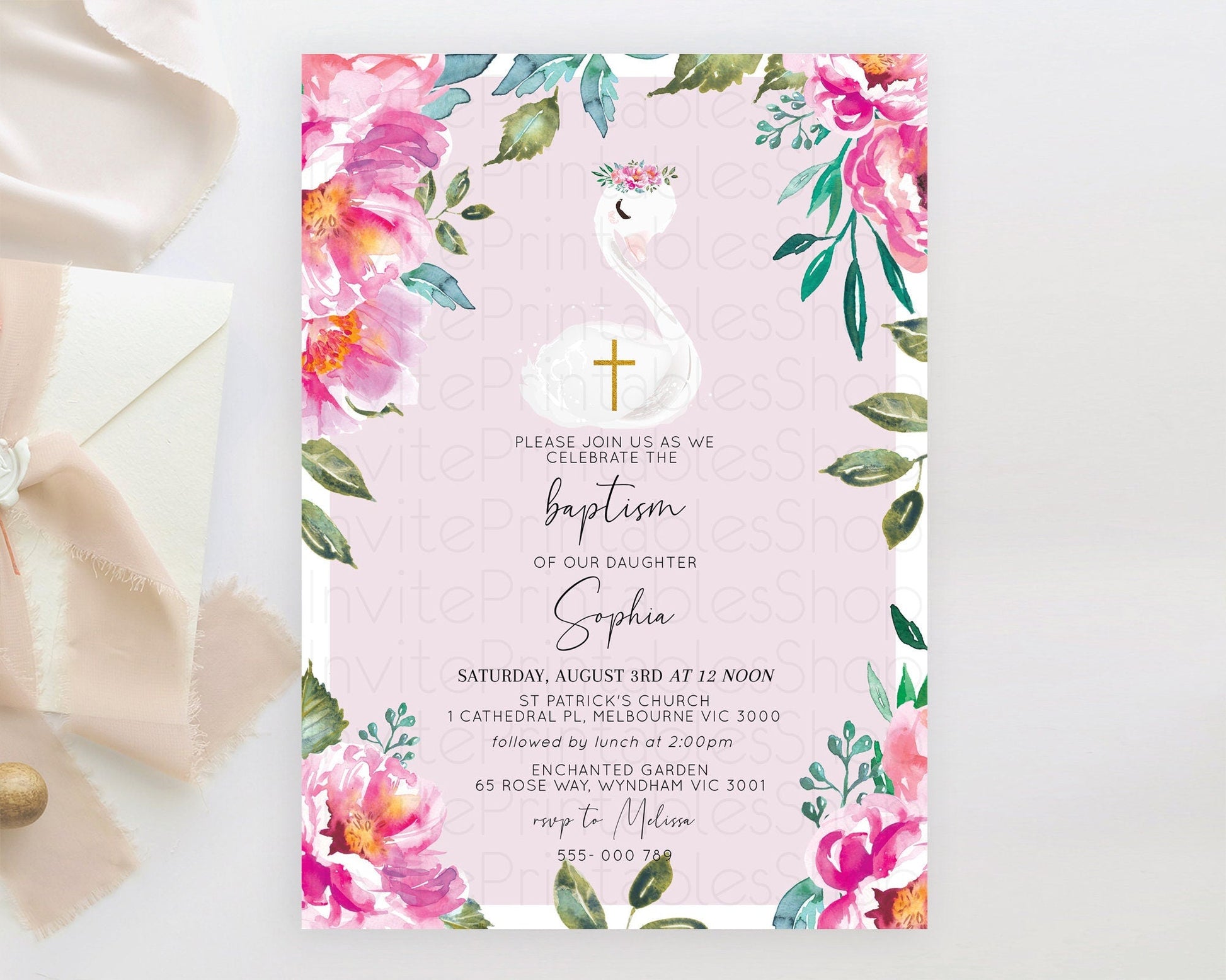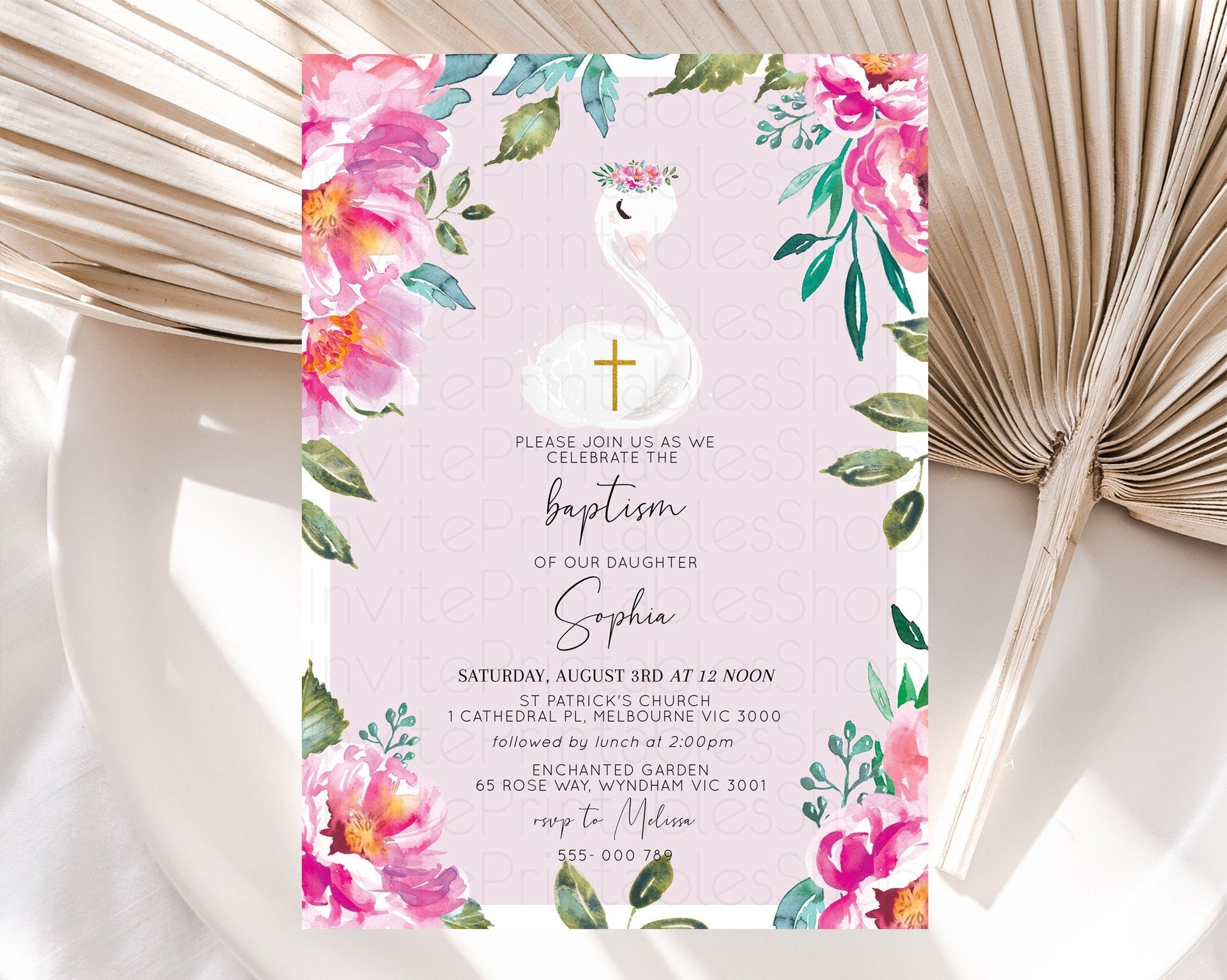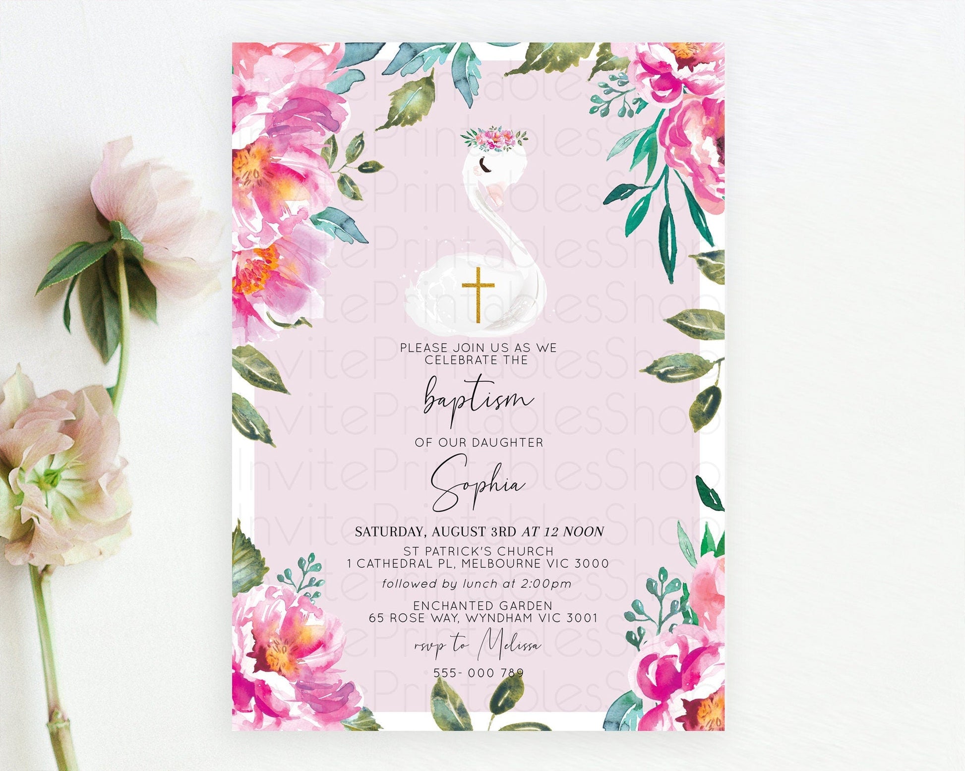 Swan Lake Baptism Invitation Swan Princess Ballet Baptism 1st Birthday Enchanted Forest Secret Garden Watercolour Pastel Floral D10757