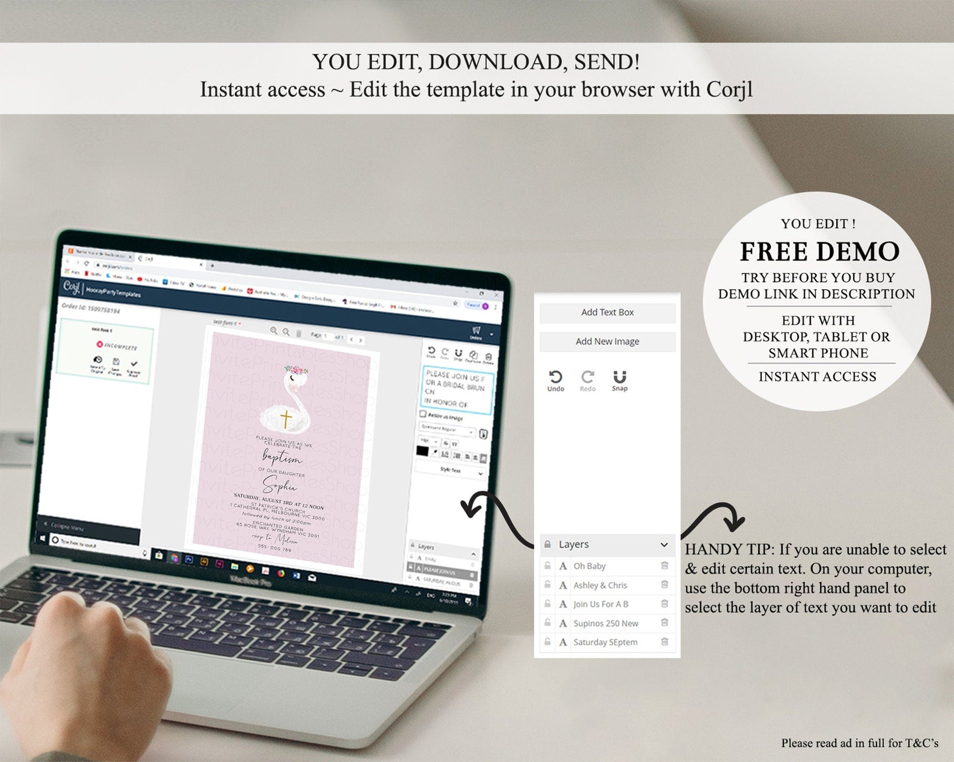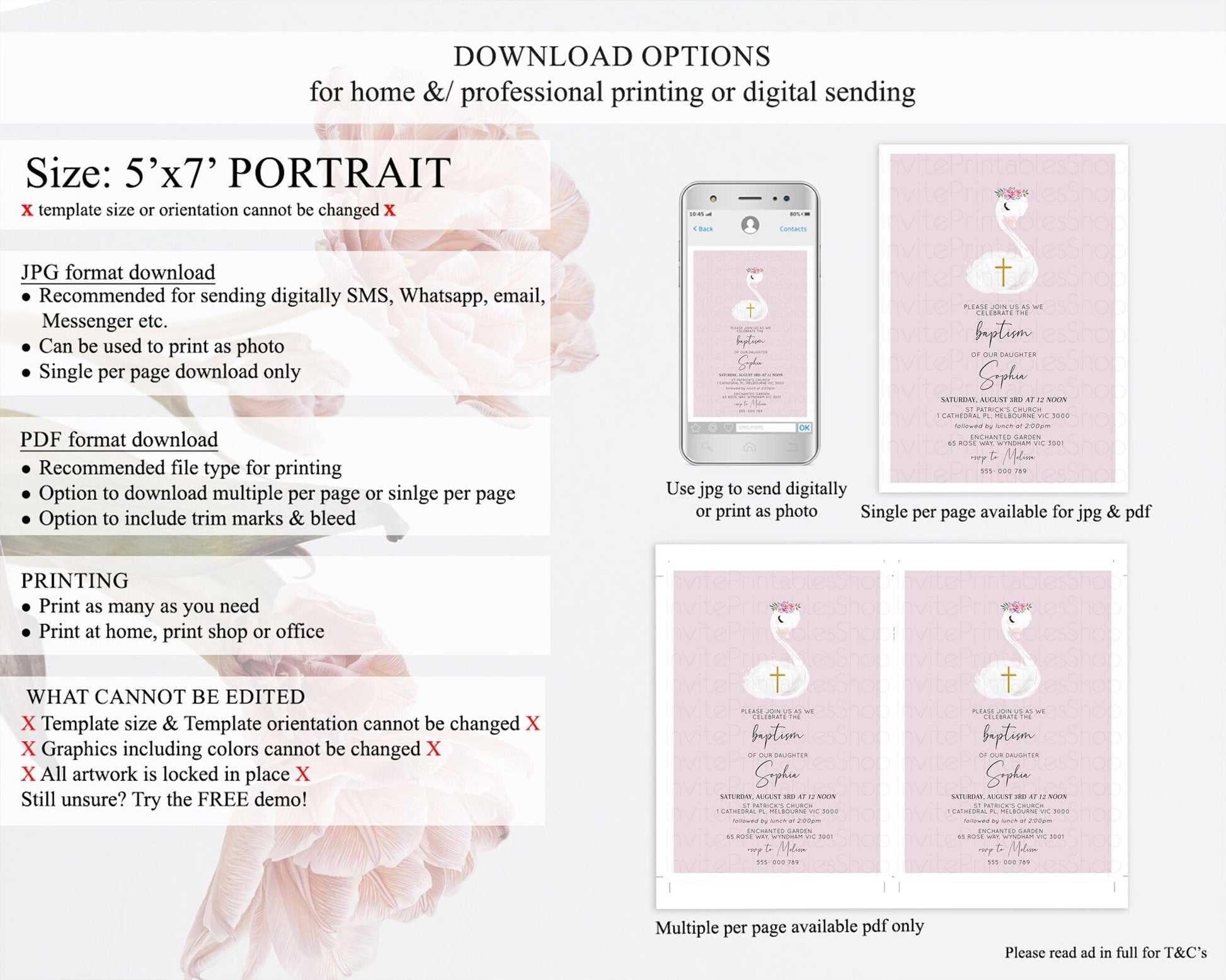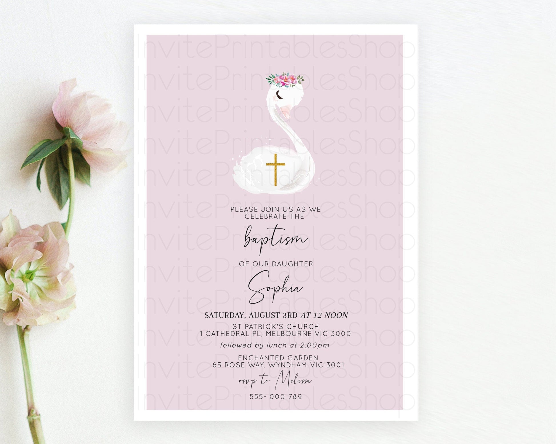Swan Lake Baptism Invitation Swan Princess Ballet Baptism 1st Birthday Enchanted Forest Secret Garden Watercolour Pastel Floral D10758