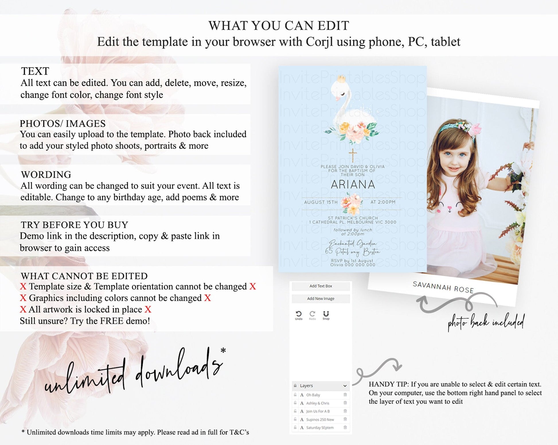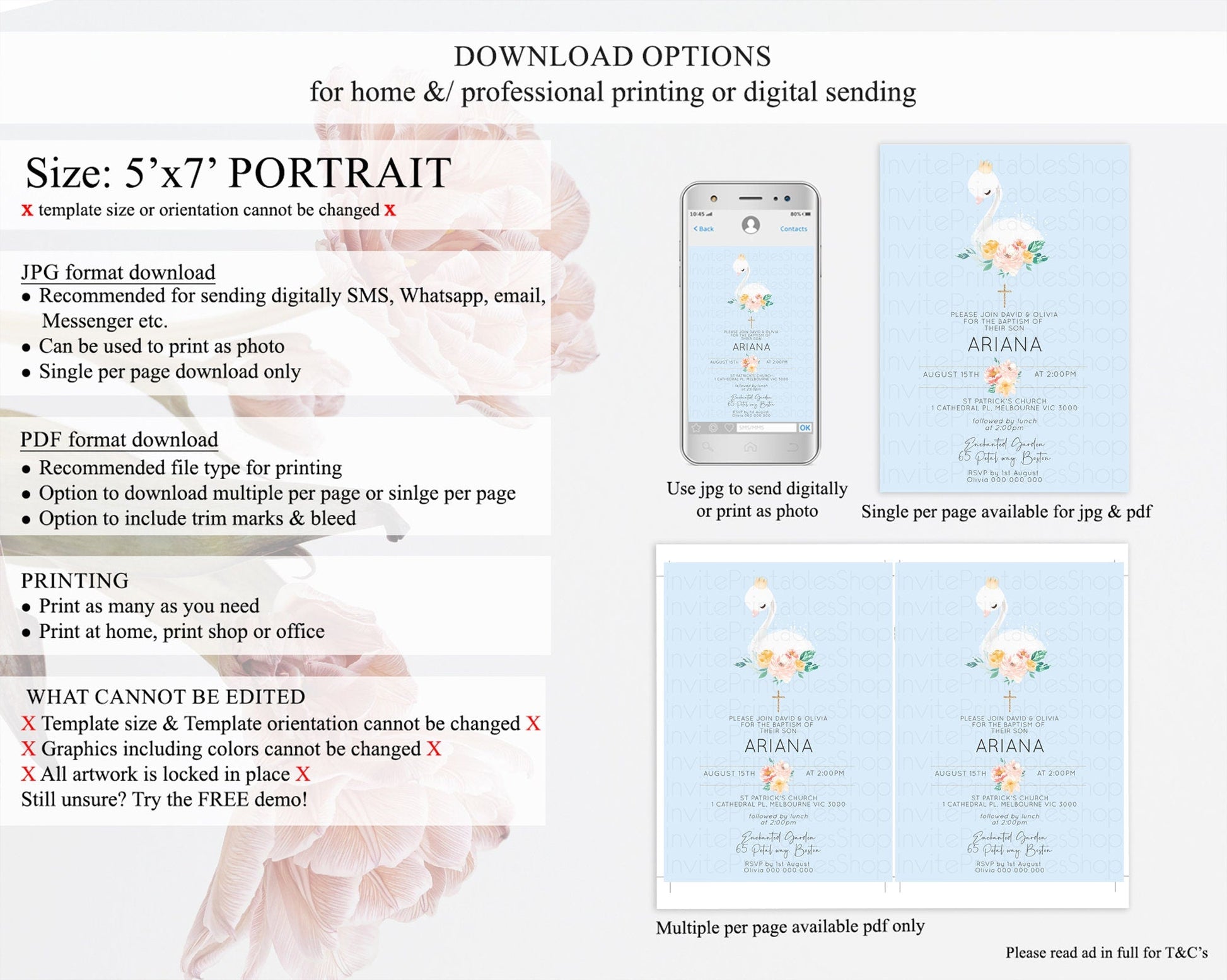 Swan Lake Baptism Invitation Swan Princess Ballet Baptism 1st Birthday Enchanted Forest Secret Garden Watercolour Pastel Floral D10903
